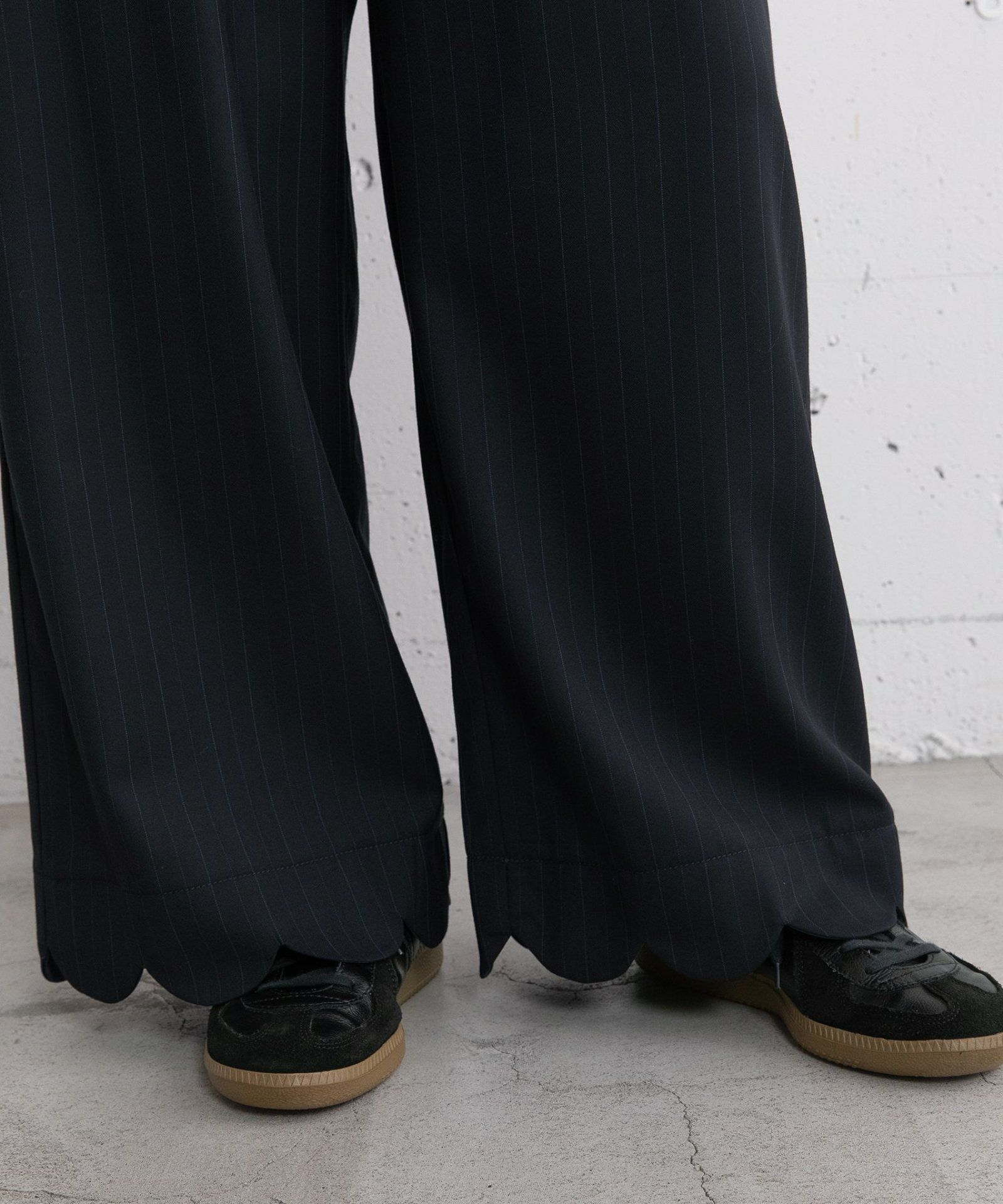 きれいめ素材で仕立てたPOU DOU DOUらしいスカラップディテールのパンツ。ニットや冬素材のトップス合わせも野暮ったくなりません。ウエストはぐるりゴムの仕様で楽な履き心地です。ひもでサイズ感の調整も可能。両サイドポケット付き。