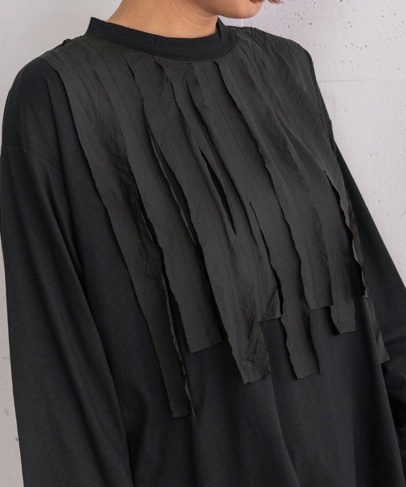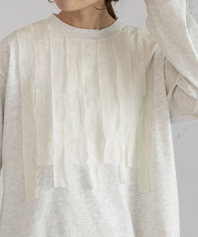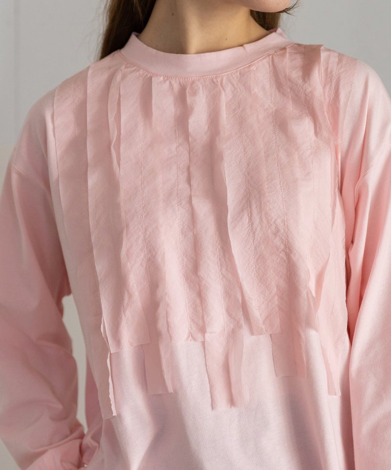フロントに合繊素材をを縫い付けたプルオーバー。ギャザーは寄せずに断ち切りのまま縫い付けた仕様がラフでカジュアルな雰囲気です。衿ぐりは控えめなスタンドカラーできちんと感もあるデザイン。カーディガンやジャケットの中に重ねてもポイントになります。
