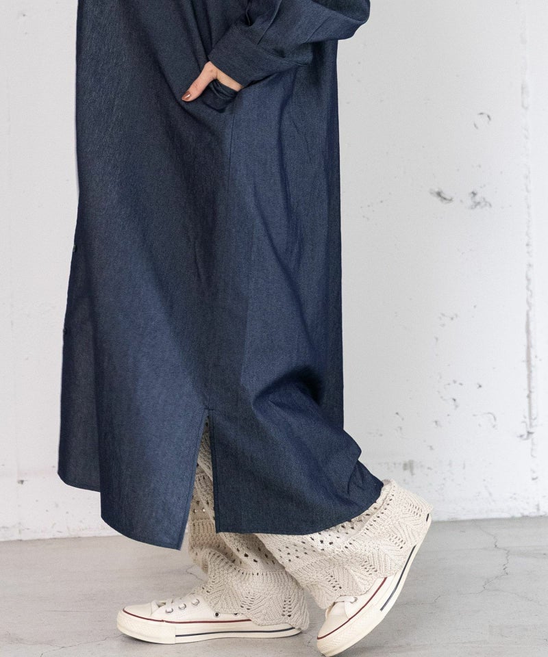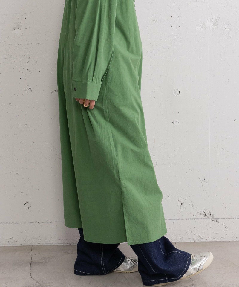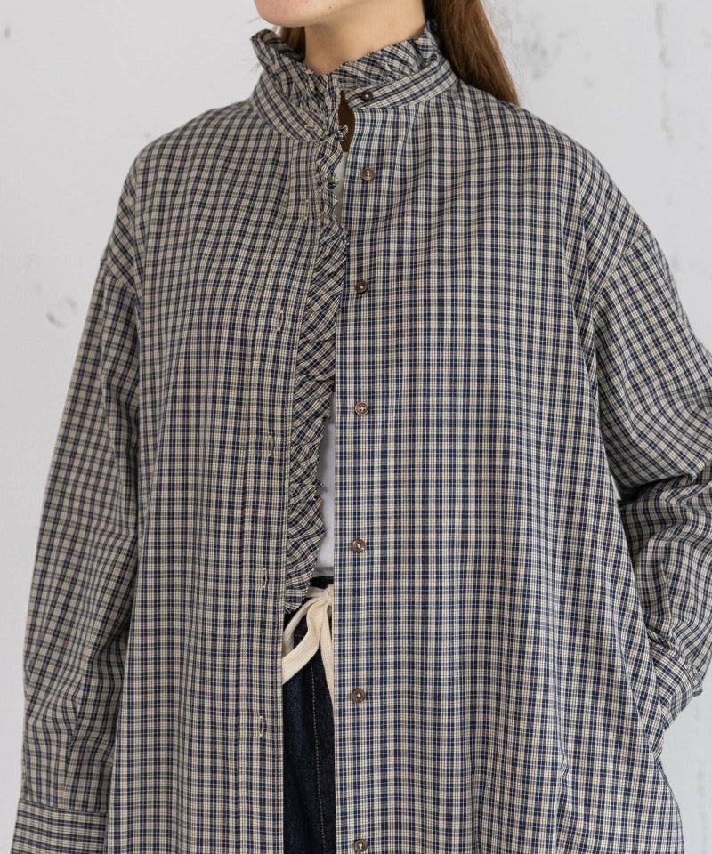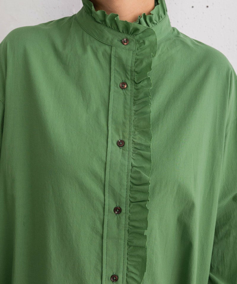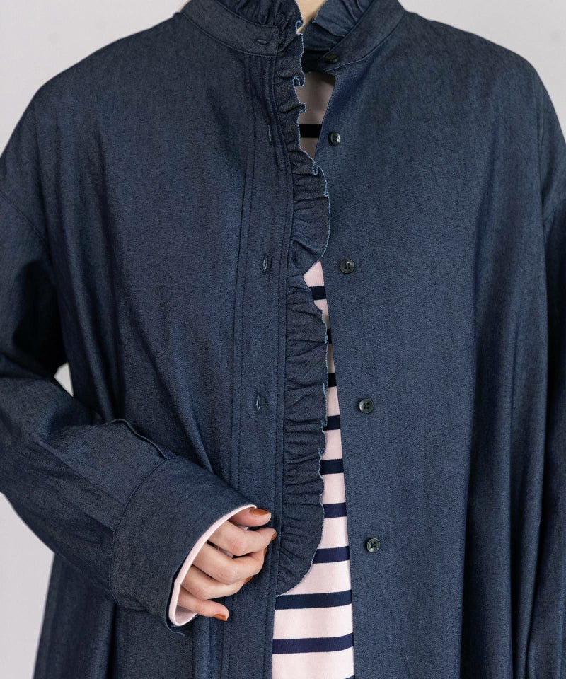 衿から前開きにかけてフリルをあしらった、華やかな印象のシャツワンピース。1枚でさらっと着るのはもちろん、ベストやニット、スウェットを重ねたレイヤードスタイルもおすすめです。両サイドにポケット付き。