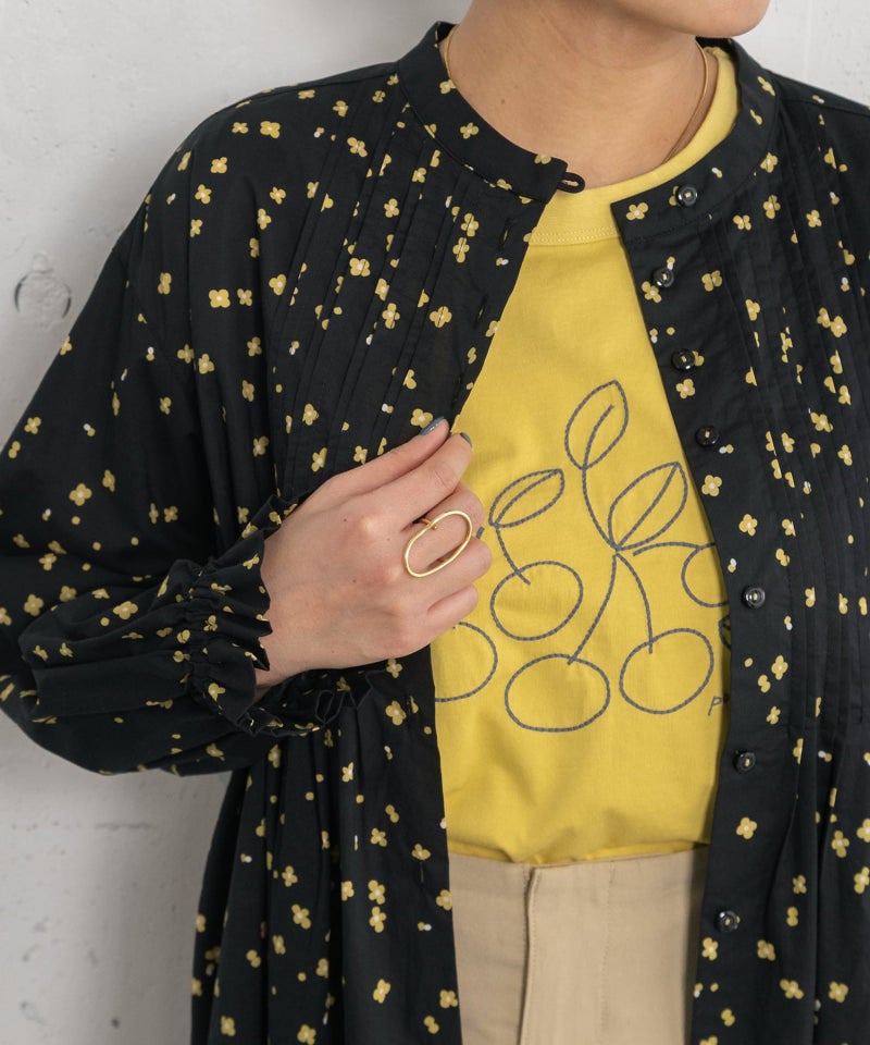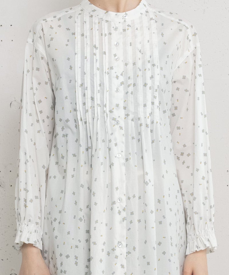 花柄とドットを散りばめたオリジナルのテキスタイルで仕立てたワンピース。フロントのタックがシンプルながらも上品なデザイン。ほどよく開いた衿元で、リラックス感のある着心地です。袖口はゴムフリルで捲りやすく、フルオープンで羽織としても使えます。ウエストの紐でフォルムの変化もお好みでアレンジしていただけます。両サイドポケットつき。