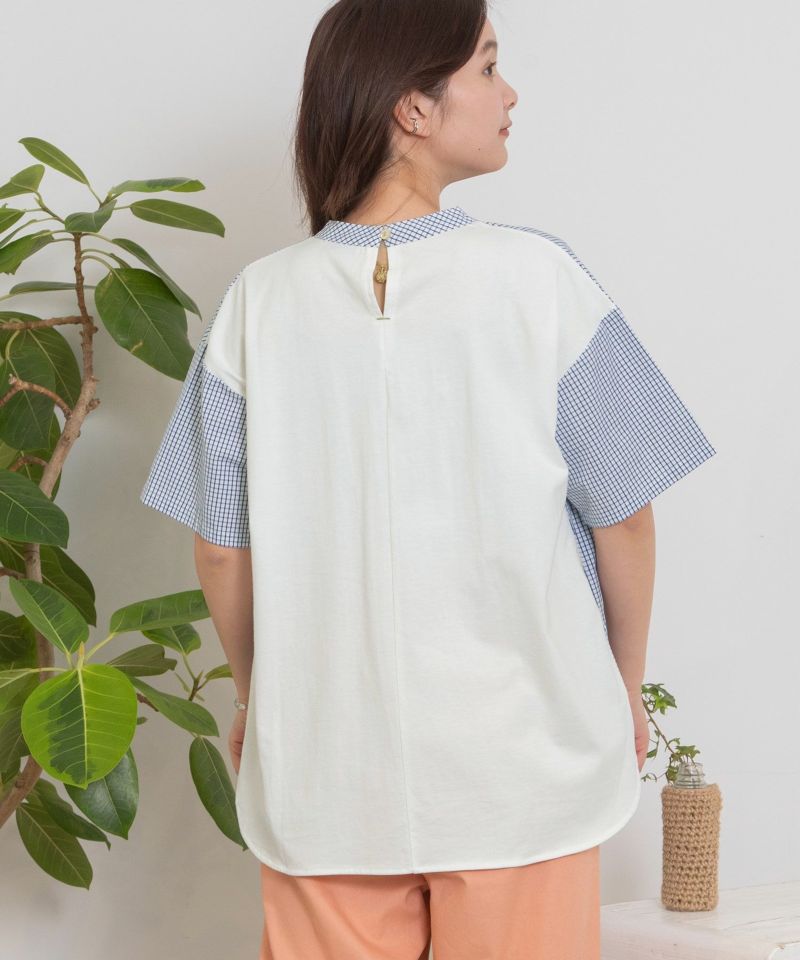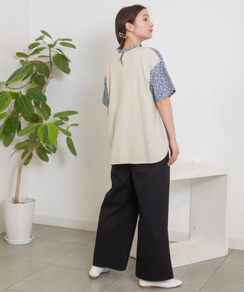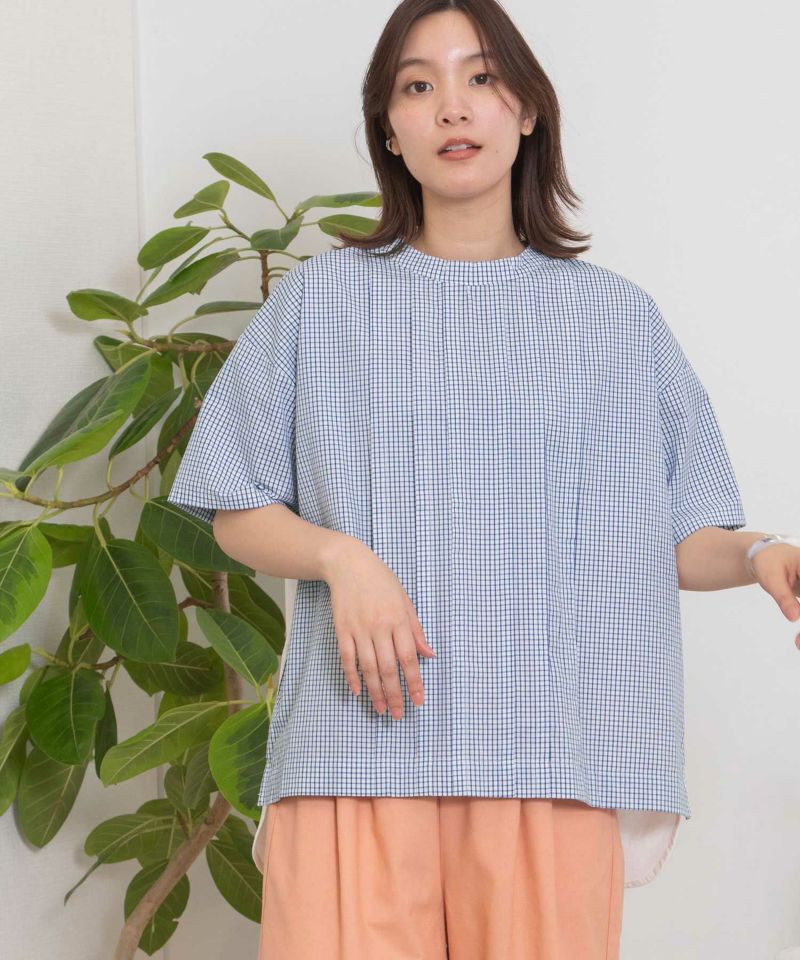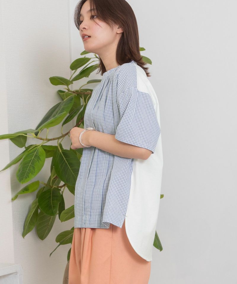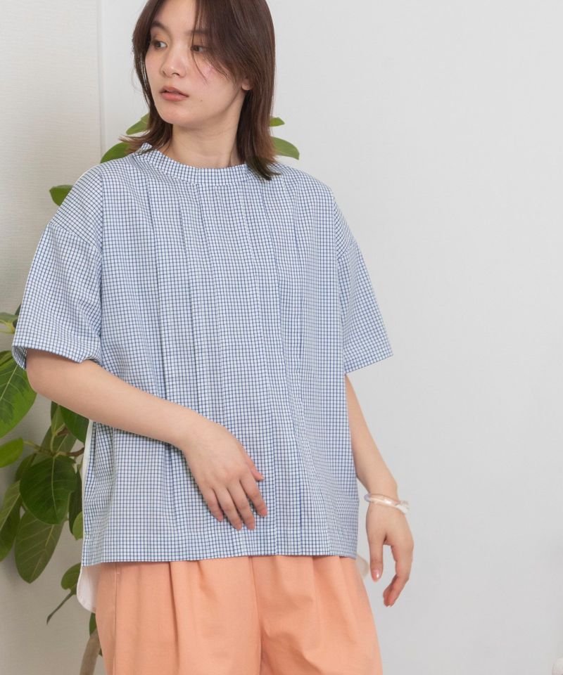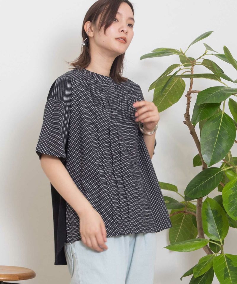 ・前身頃はタックを施した布帛生地、後身頃にカットソー生地を使用したトップス。ブラウスのようにキレイめ見えして、Tシャツのように楽な着心地のカットソーの1枚着です。