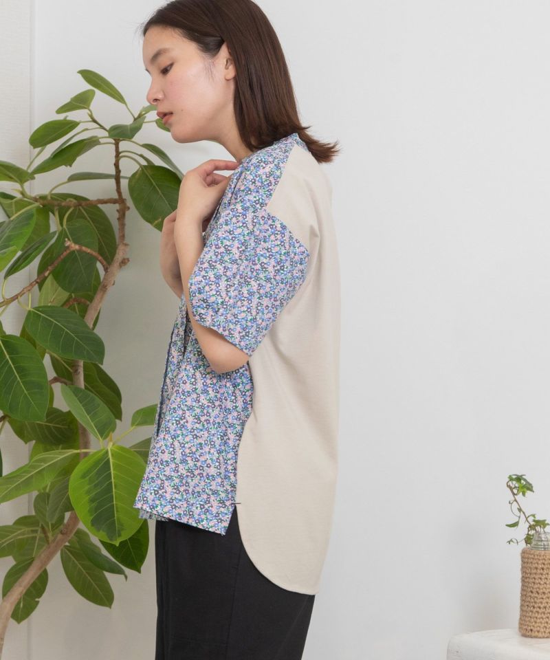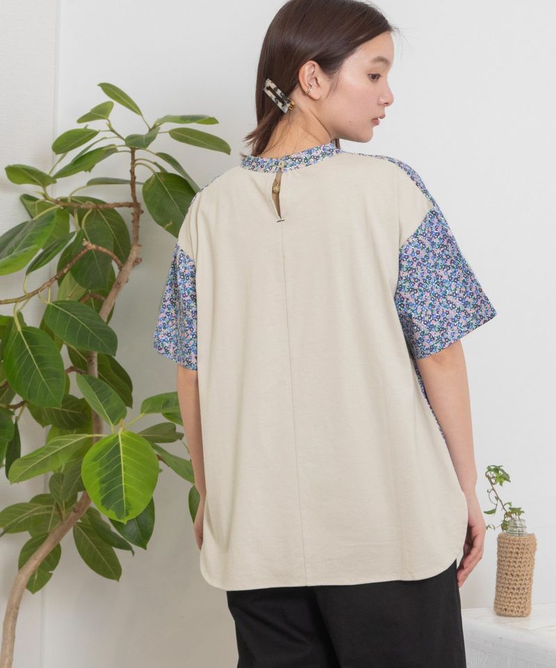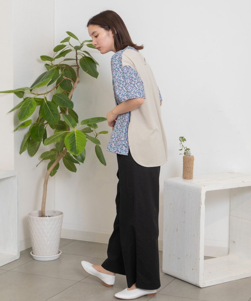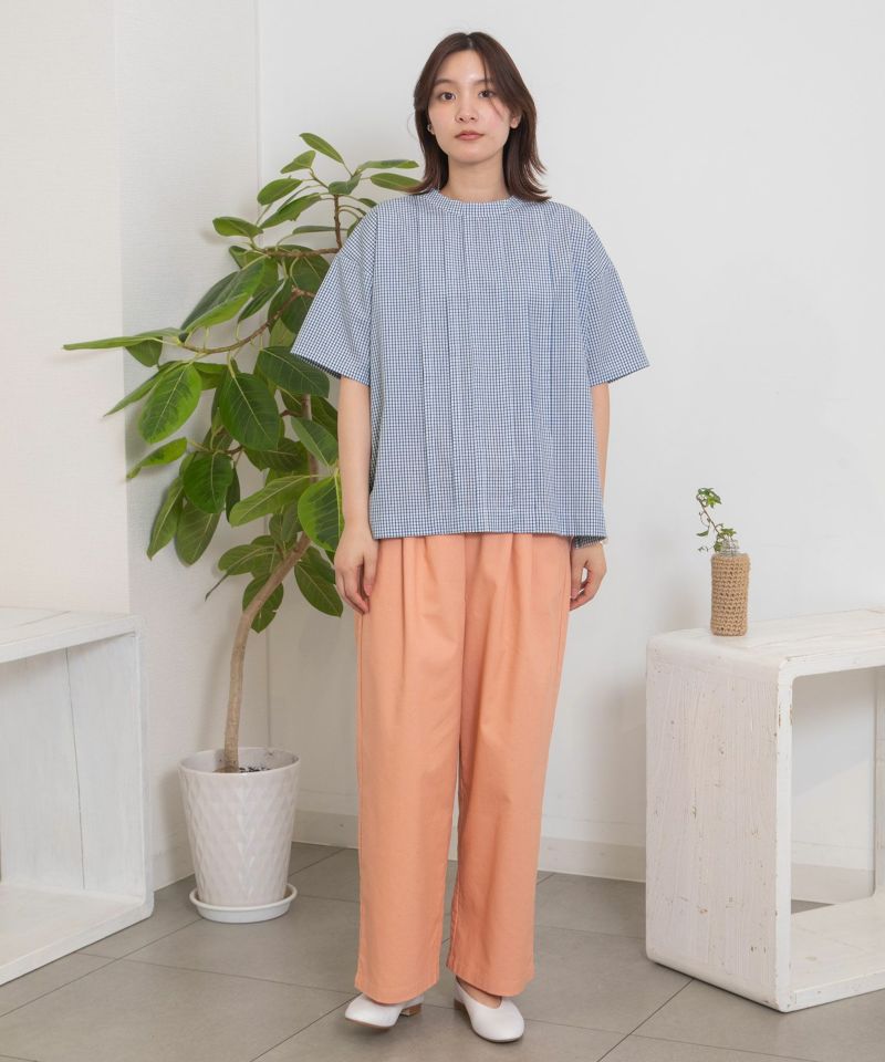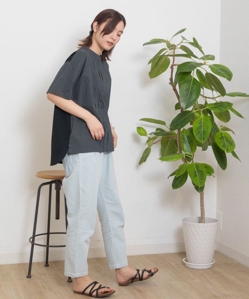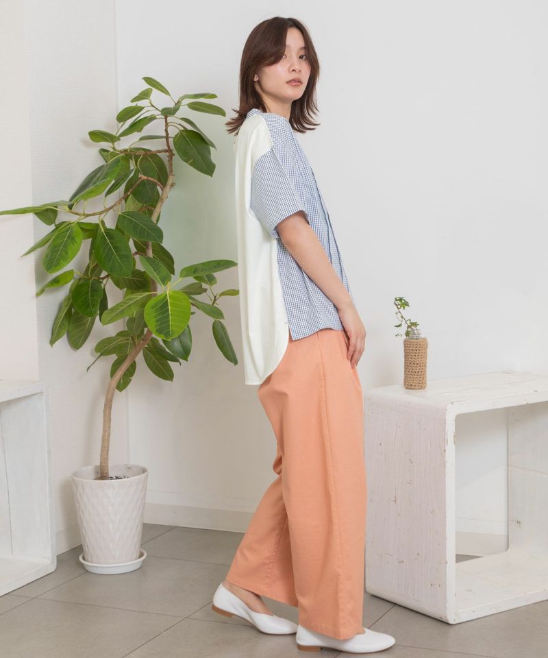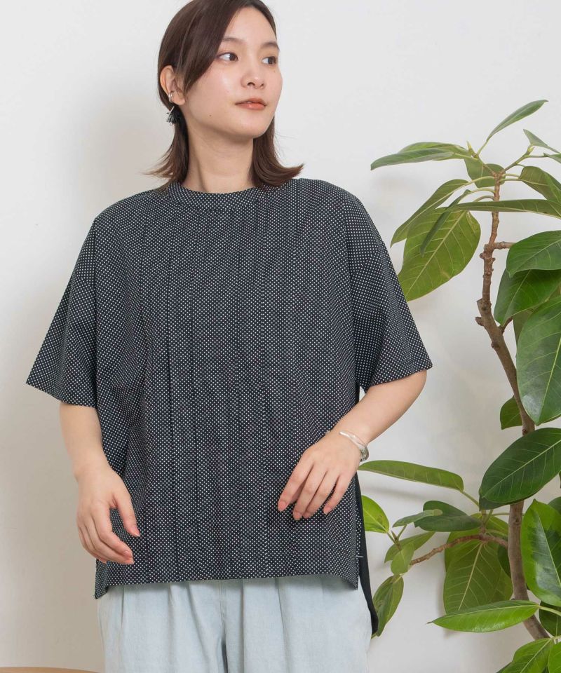 ・前身頃はタックを施した布帛生地、後身頃にカットソー生地を使用したトップス。ブラウスのようにキレイめ見えして、Tシャツのように楽な着心地のカットソーの1枚着です。