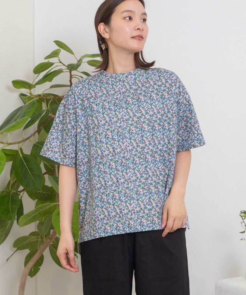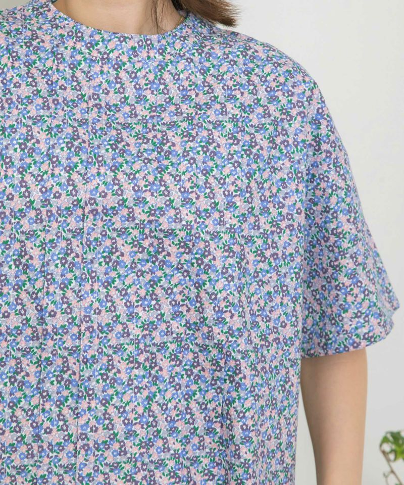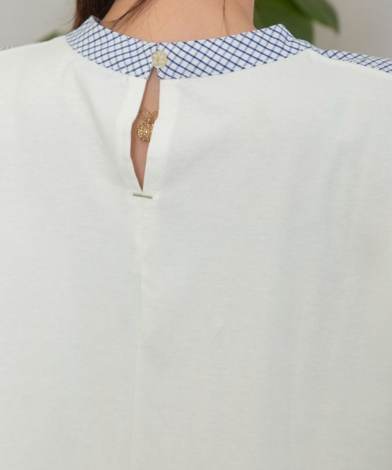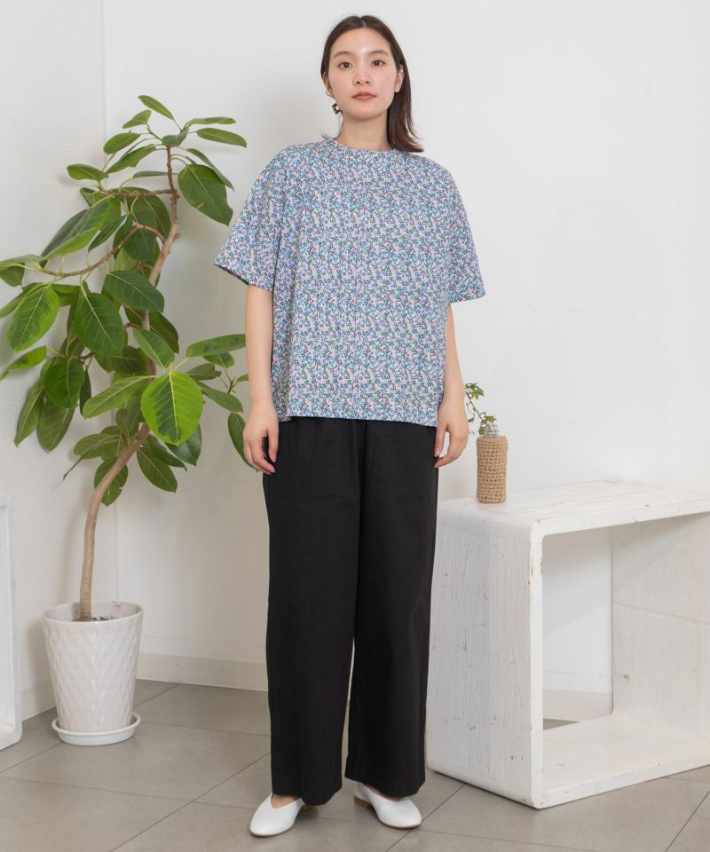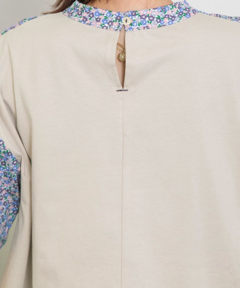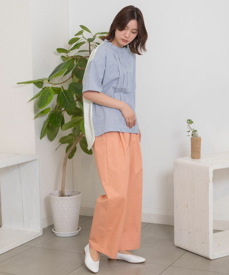 ・前身頃はタックを施した布帛生地、後身頃にカットソー生地を使用したトップス。ブラウスのようにキレイめ見えして、Tシャツのように楽な着心地のカットソーの1枚着です。