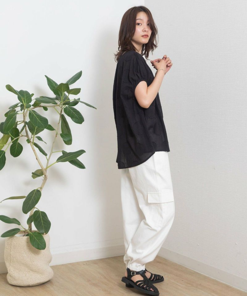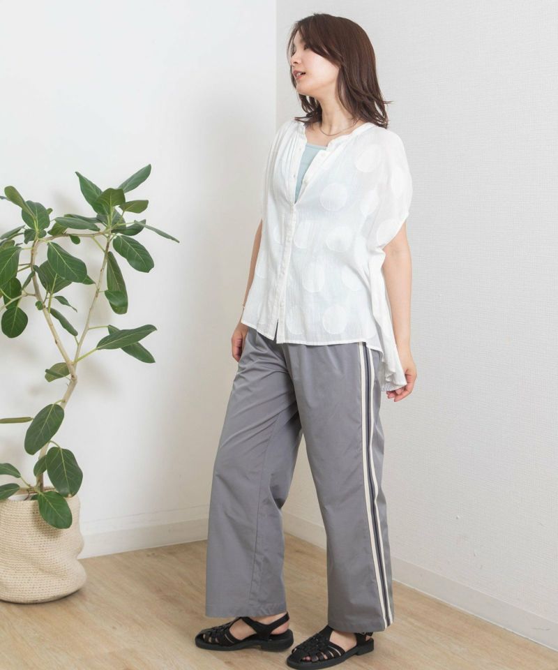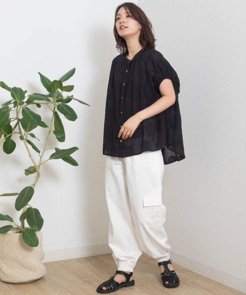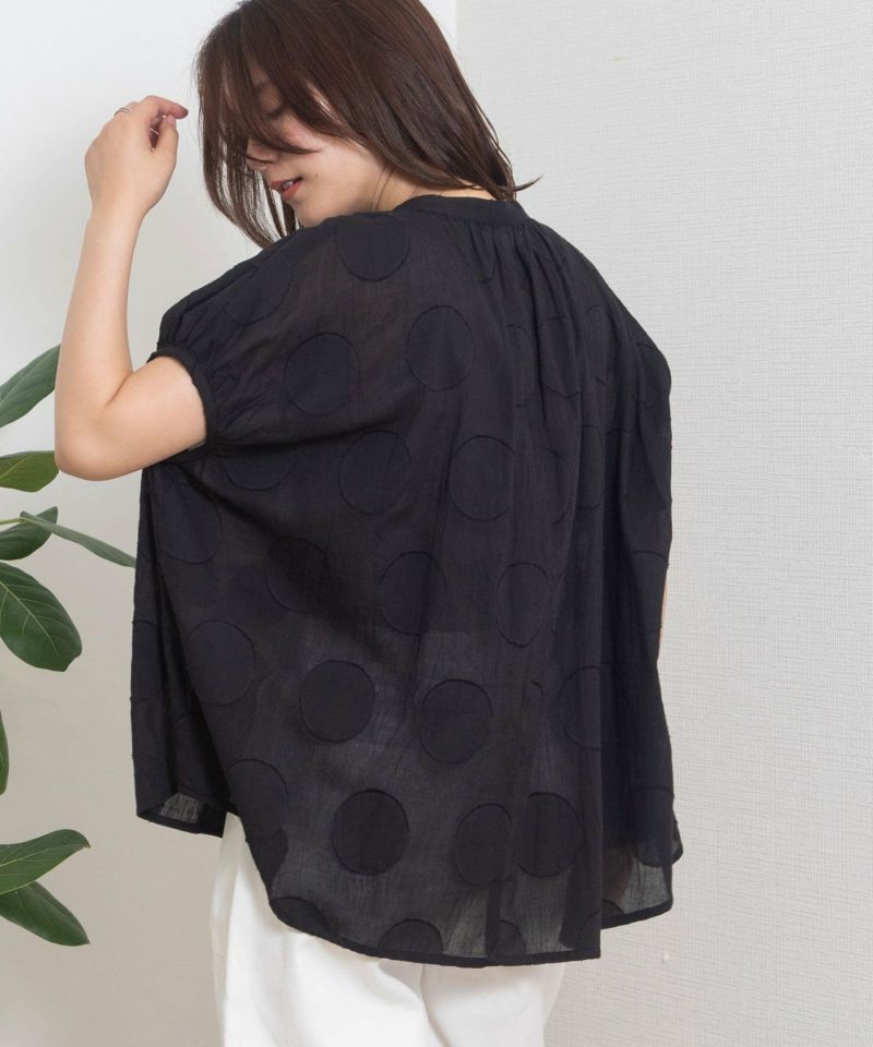 ・大胆な柄でも無地見えするのでトライしやすく見た目も映えます。身頃にギャザーを寄せたポンチョはバンドカラーと袖のタックで甘さを控えめに。体のラインを拾わないのでリラクシーな気心地です。