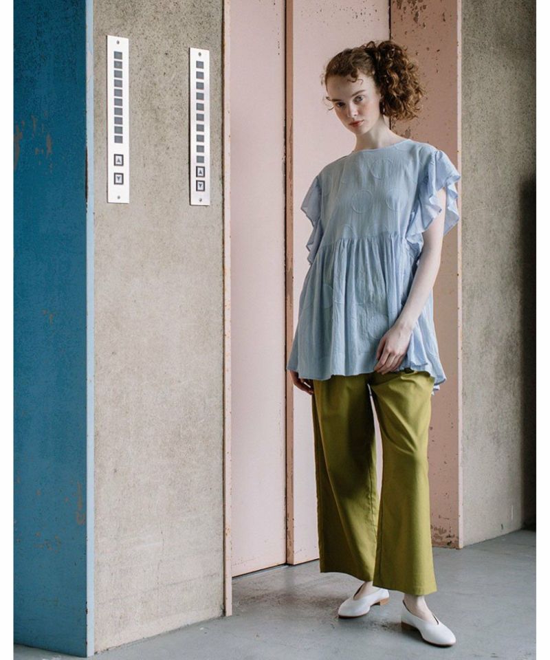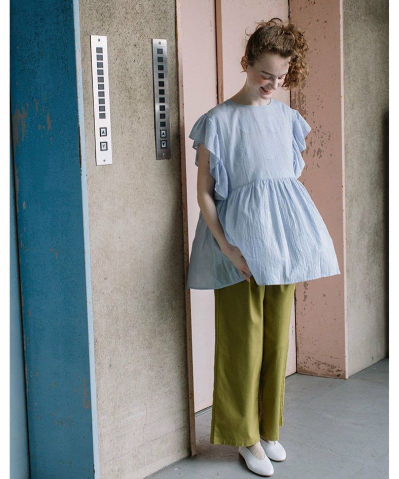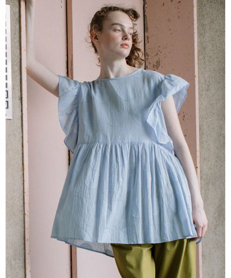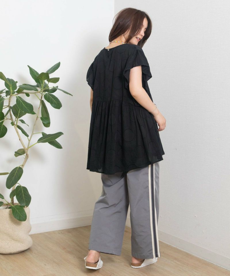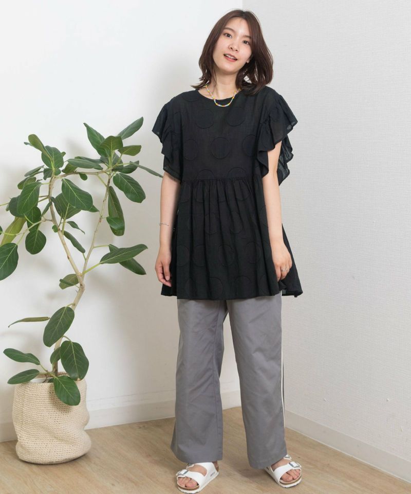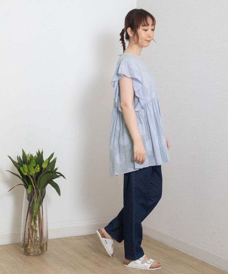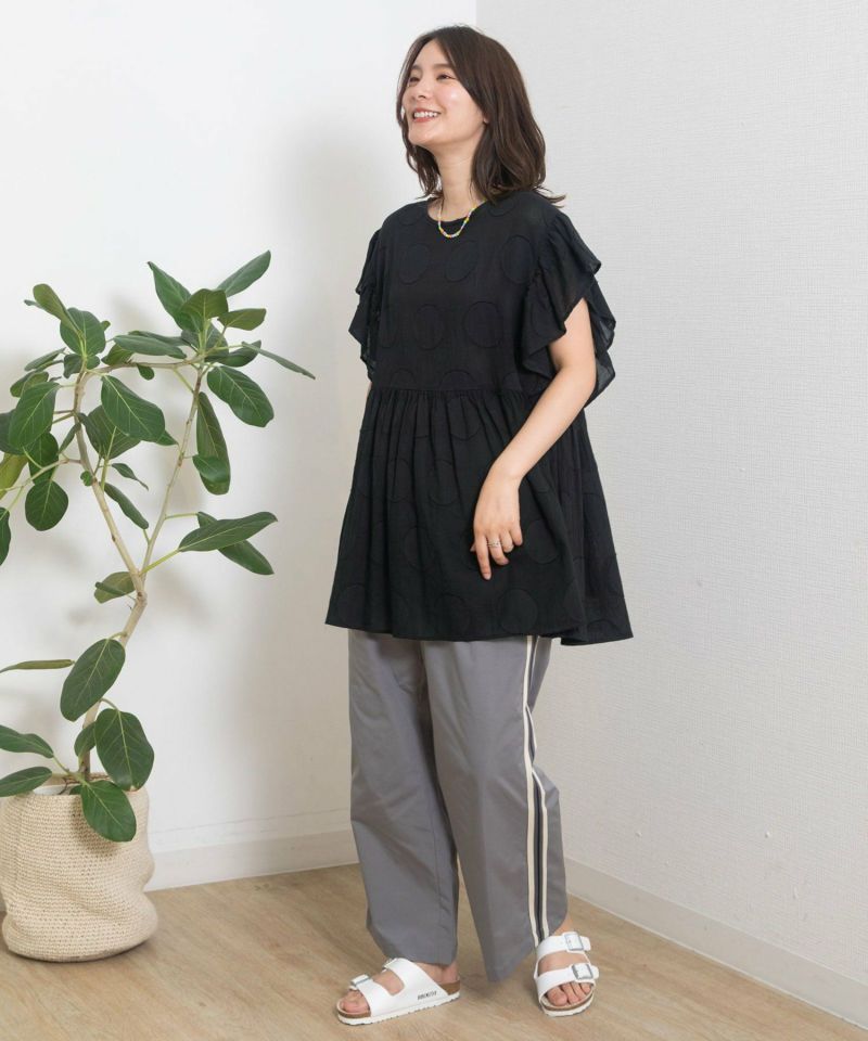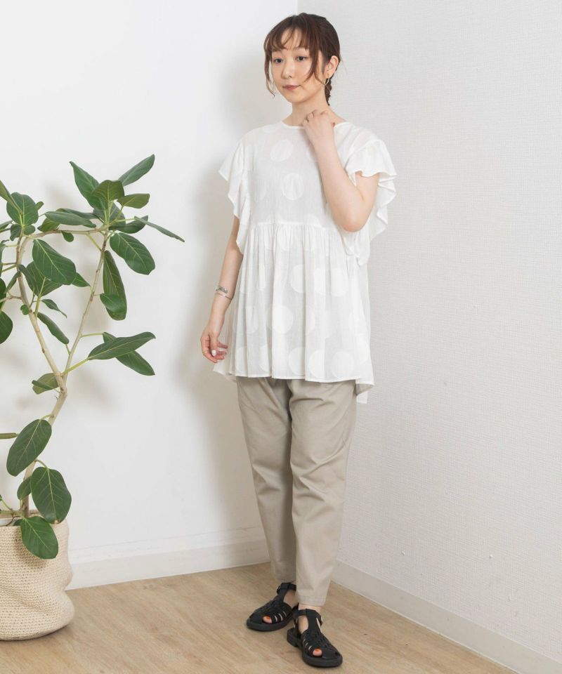 ・大胆な柄でも無地見えするのでトライしやすく見た目も映えます。袖のギャザーフリルが涼しげでトレンド感のあるブラウス。袖下にも身頃が続いているので安心して着ていただけます。