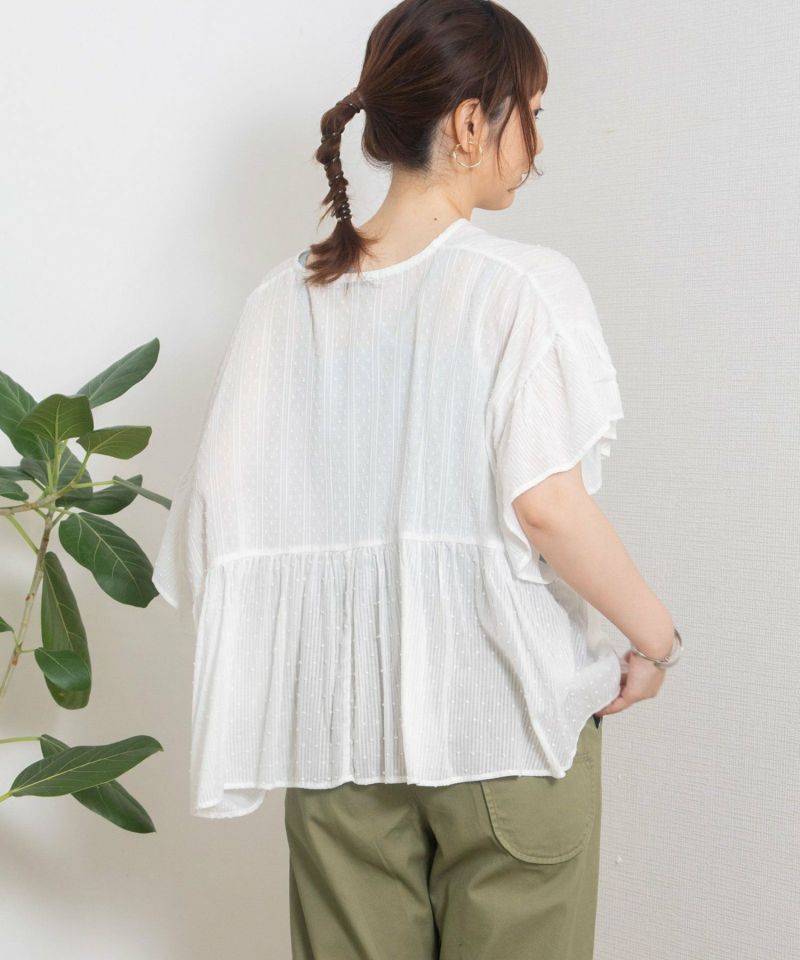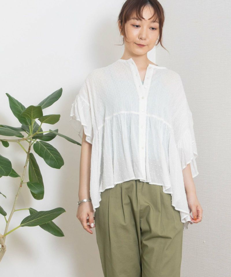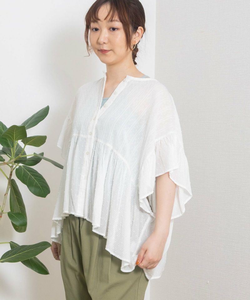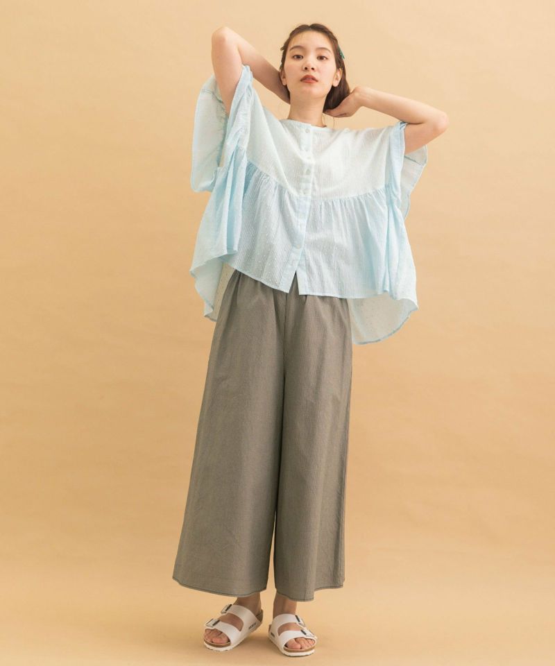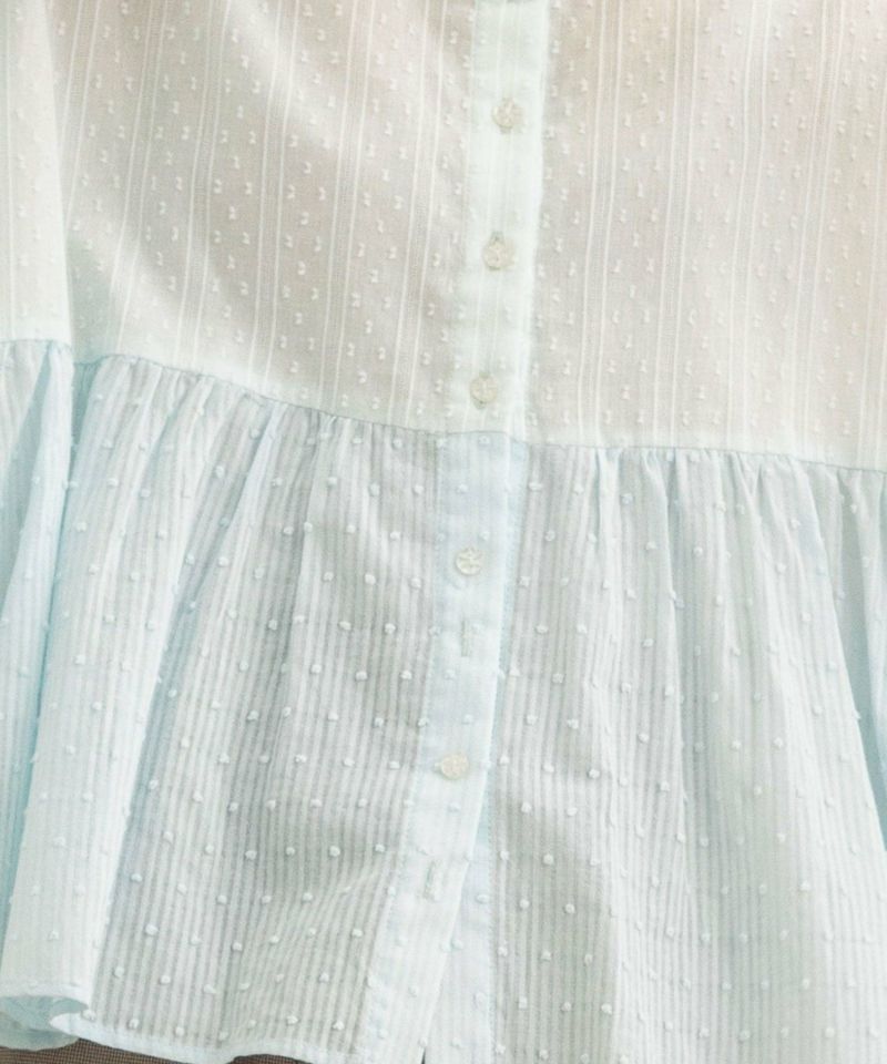 ・2種類の生地を掛け合わせた前開きのブラウスです。透け感と軽さのあるストライプとドビー織り生地の組み合わせ。見た目にも涼しげな雰囲気です。