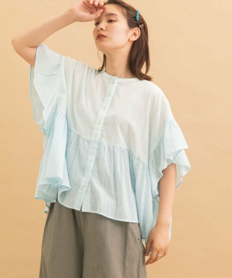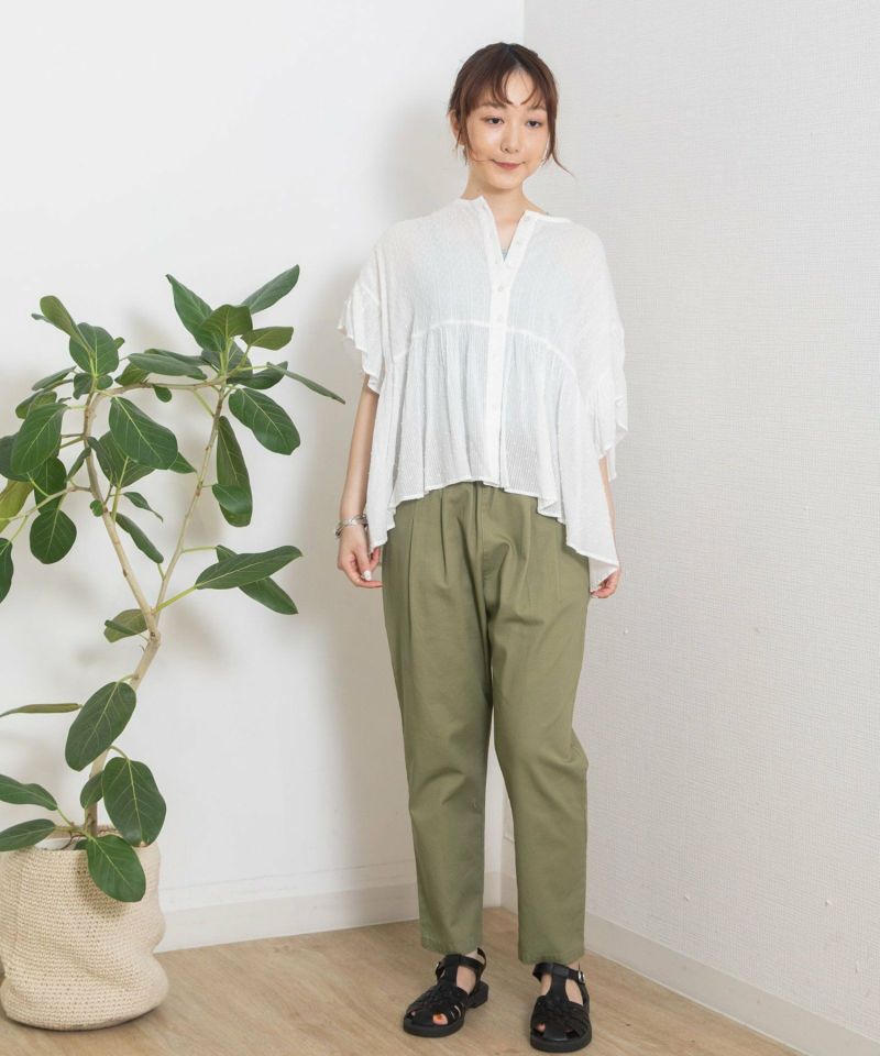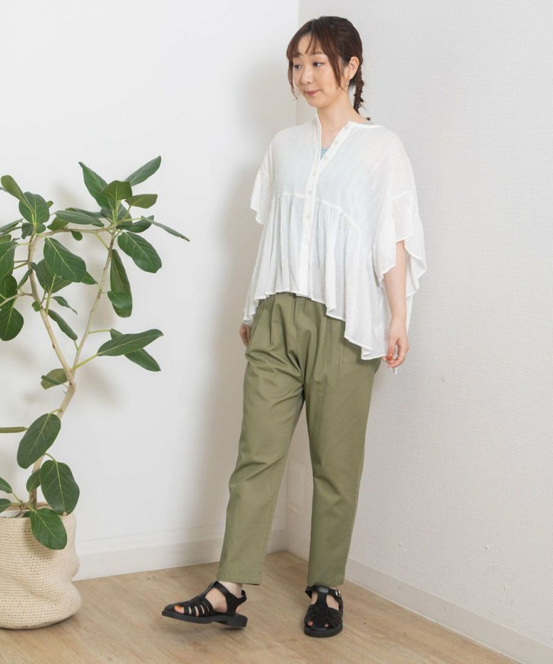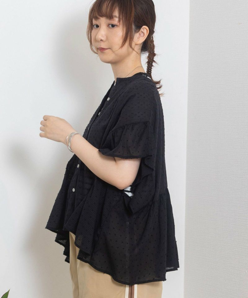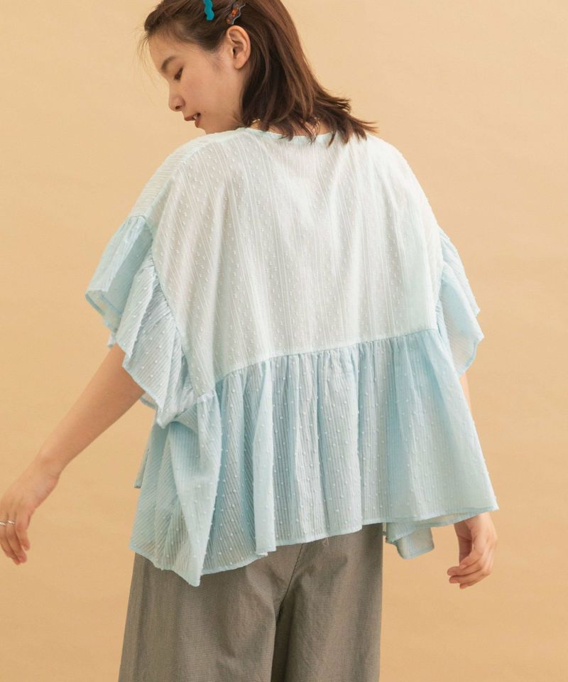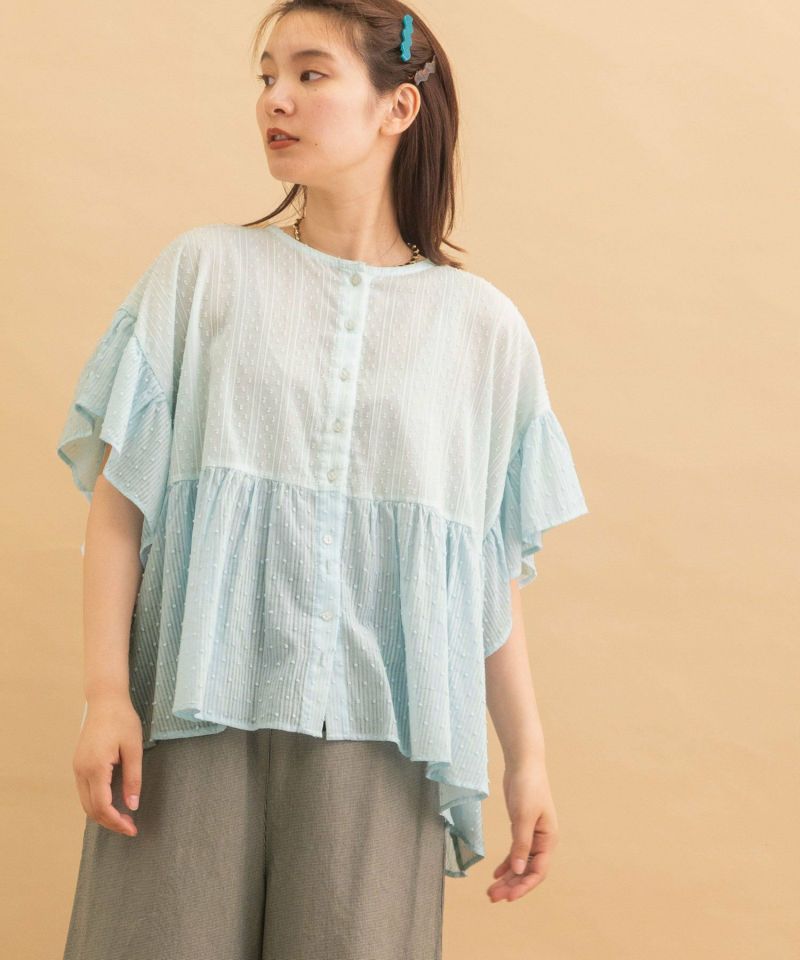 ・2種類の生地を掛け合わせた前開きのブラウスです。透け感と軽さのあるストライプとドビー織り生地の組み合わせ。見た目にも涼しげな雰囲気です。
