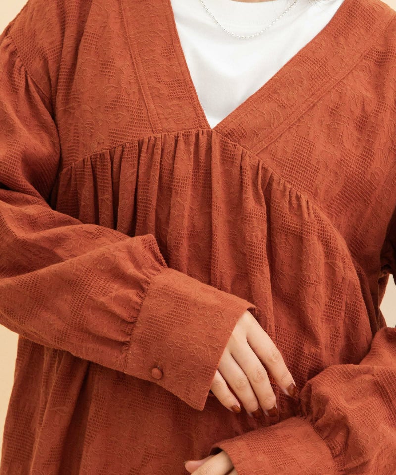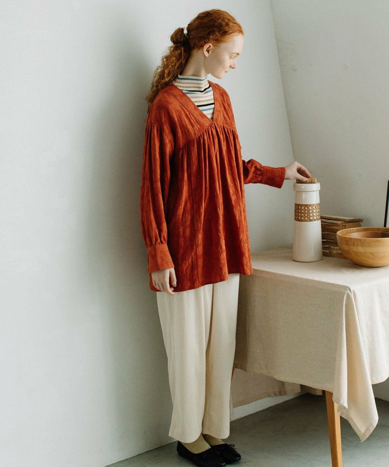 ボタニカル柄のジャガード生地を使用したチュニックブラウス。無地のように見えながらさりげなく華やかさのある生地で仕立てました。首元きれいに見えて、ハイネックのニット合わせもすっきりと決まるVネックデザイン。身頃と袖にギャザーを寄せて立体感を出しました。ボリュームのあるシューズとも相性の良いブラウスです。