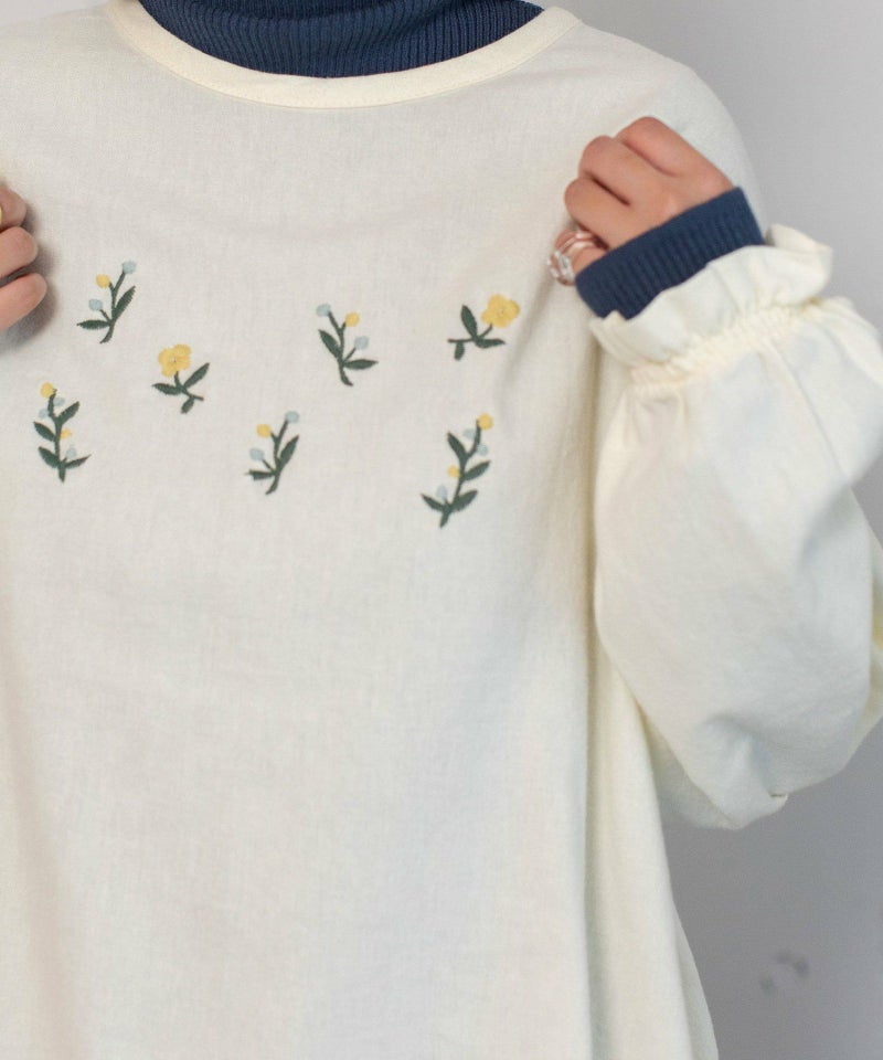 柔らかく暖かみのある綾織りコットンの起毛素材で仕立てたブラウス。フロントのボタニカル刺繍がポイントです。インナーにニットを合わせるスタイルもオススメ。前後差のある着丈でこなれた雰囲気に。袖口はゴムの仕様でまくりやすくしています。後ろあきのボタンはさりげなく配色にしています。
