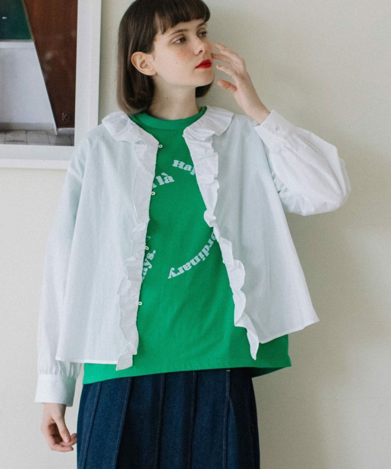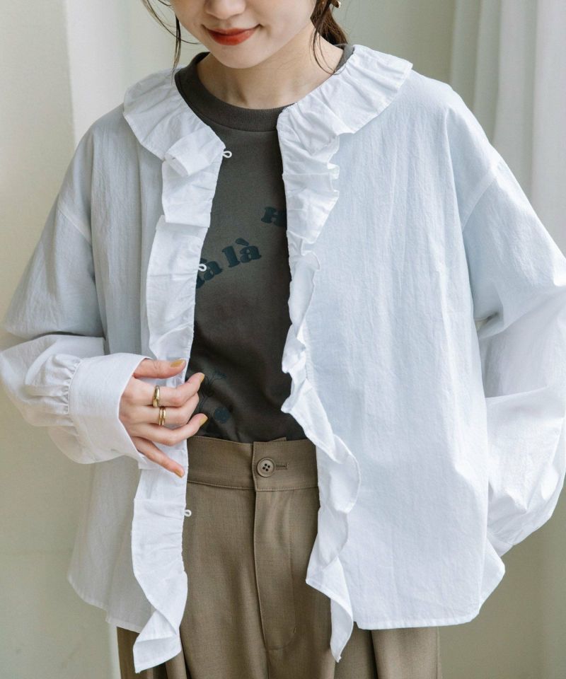 衿とフロントにギャザーフリルをあしらったブラウス。抜け感があり、羽織としても使いやすいアイテム。こなれた雰囲気でコーディネートが仕上がる洗い晒しコットン生地を使用しています。