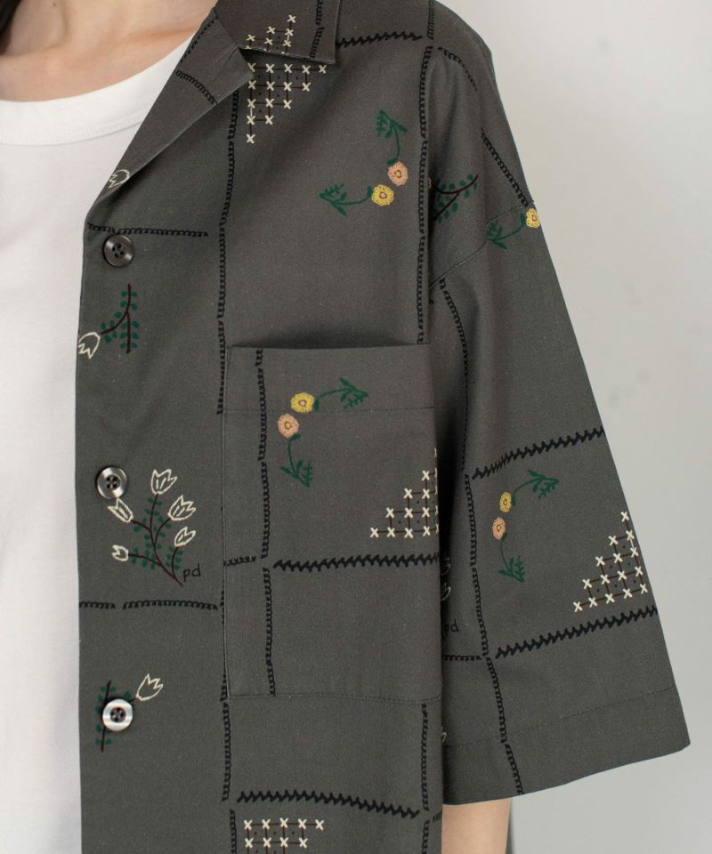 アンティーククロス風のステッチイラストをプリントしたオリジナルのテキスタイル。メンズライクな開襟シャツがデザインソースのオープンカラーシャツ。ボタンを上まで留めるとフラットカラーにもなります。いつもより少し大きめのボタンと左胸ポケットがさりげないポイント。羽織としても使えます。