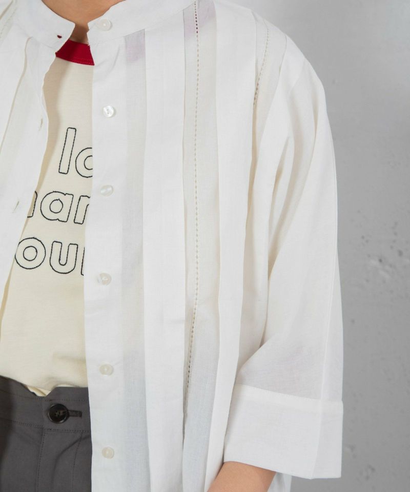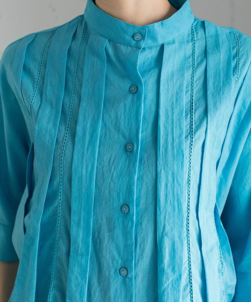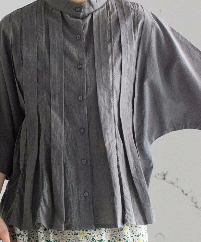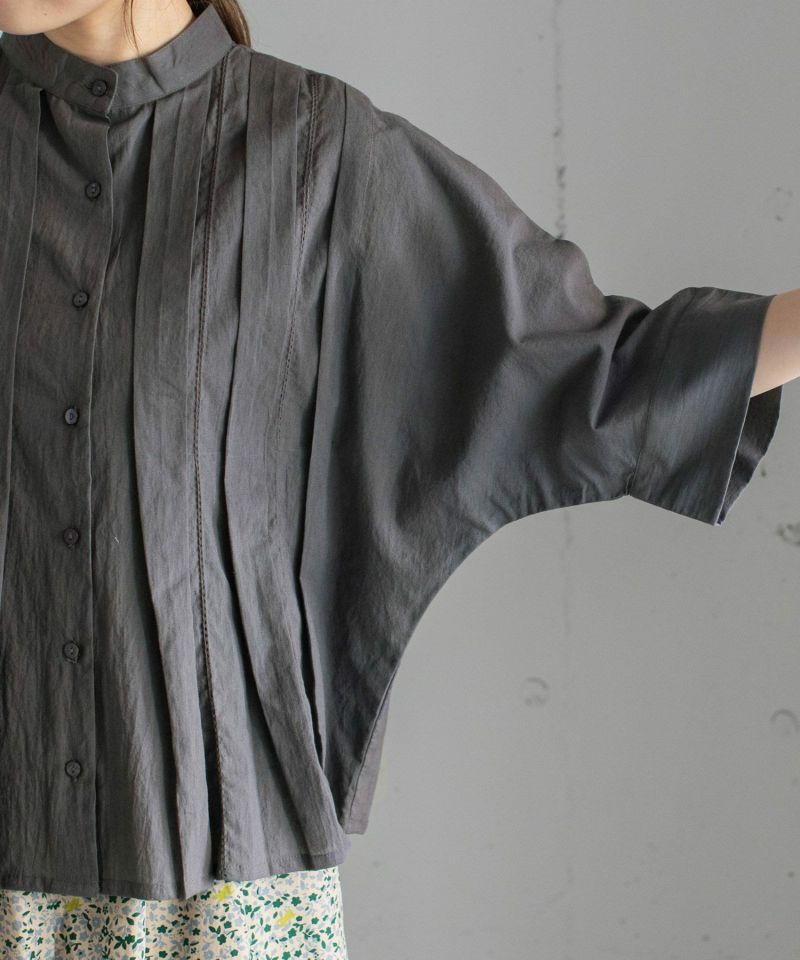 大胆なタックとピコミシンがポイント1枚でサマになるブラウス。衿元はスタンドカラーですっきりと。身頃続きのドルマンスリーブでゆったりと着られます。