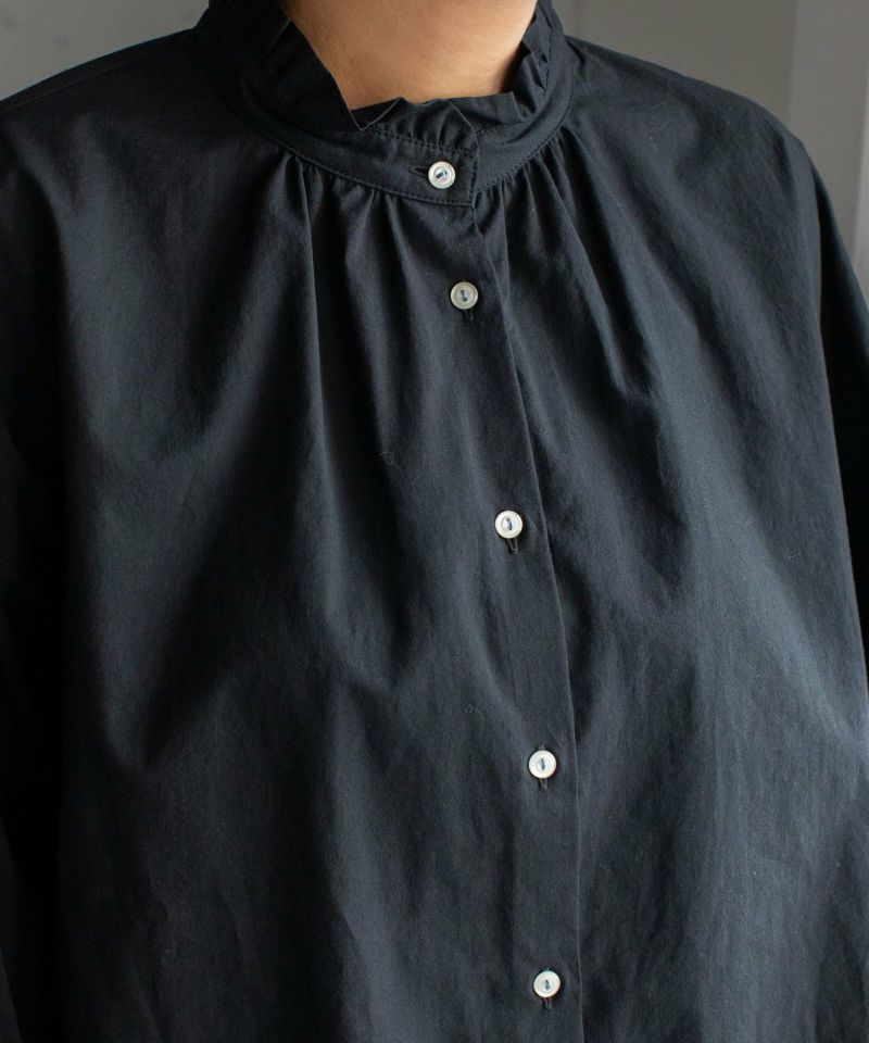 衿元のフリルがクラシカルで大人可愛いブラウス。ネックに寄せた控えめなギャザーデザインが、女性らしい雰囲気のアイテムです。使いやすいオフホワイトとブラックの無地とランダムに散りばめたドット柄2色の展開です。コットン100%でオールシーズン着られる素材感です。