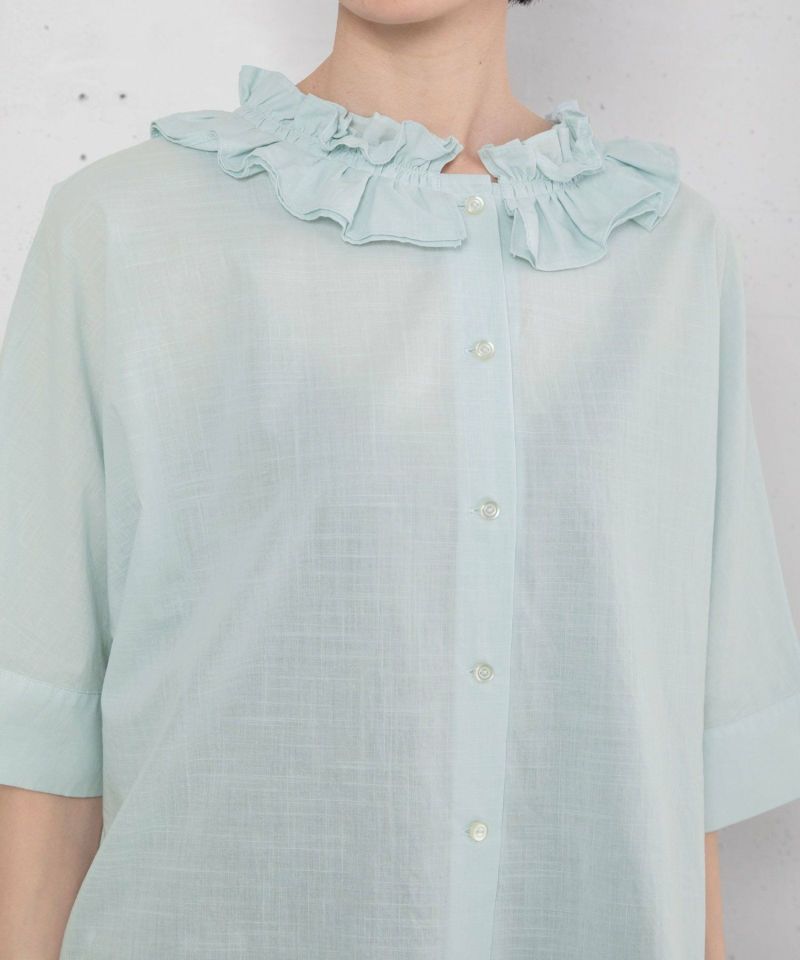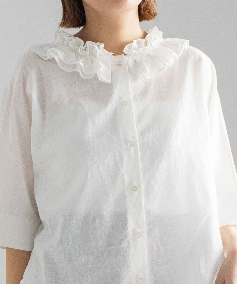 衿のフリルデザインが印象的なブラウス。生地を2枚重ねてボリューム感を出し、1枚で着映えします。糸の細いコットンスラブローン生地を使用し、夏にぴったりの清涼感のある軽い雰囲気に仕上げています。袖の切り替えがない身頃続きのドルマンスリーブのシルエットで、Tシャツのように気軽に着られます。きれいめでも、デニム合わせのカジュアルな着こなしもおすすめです。
