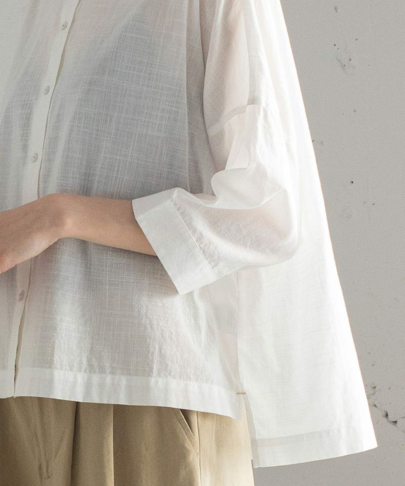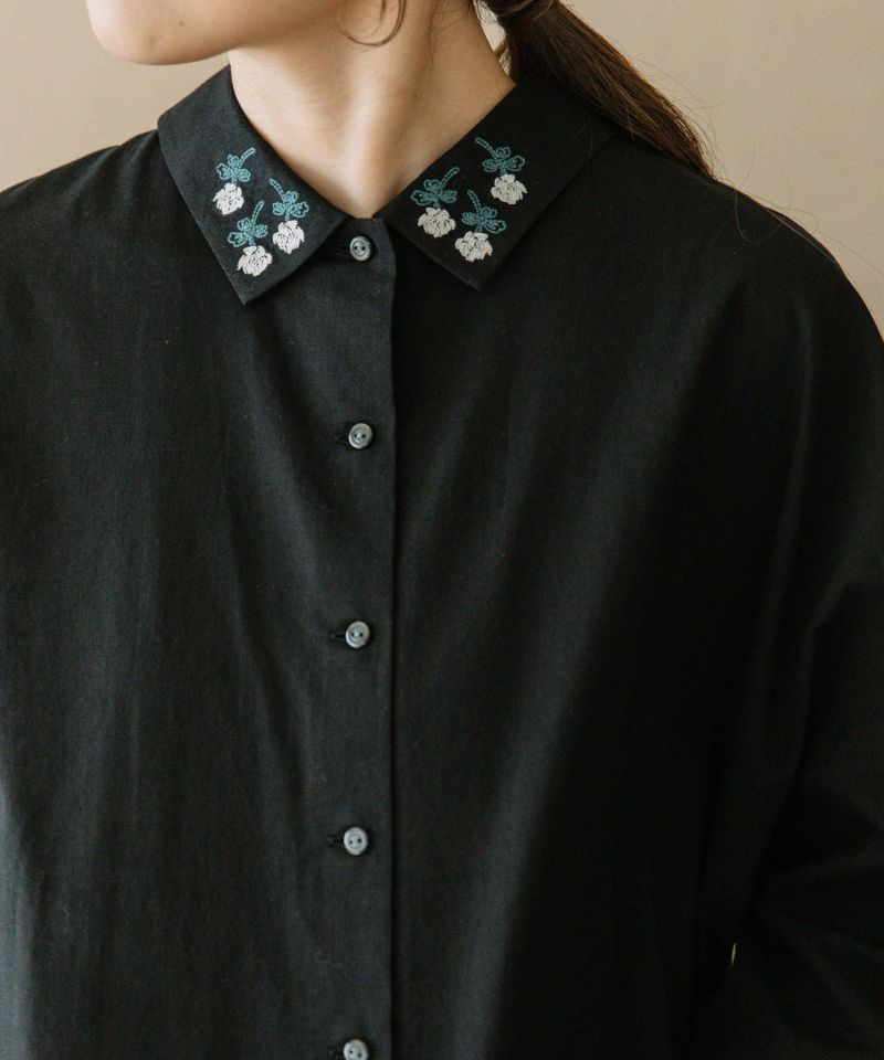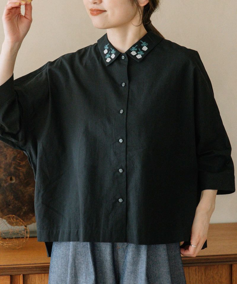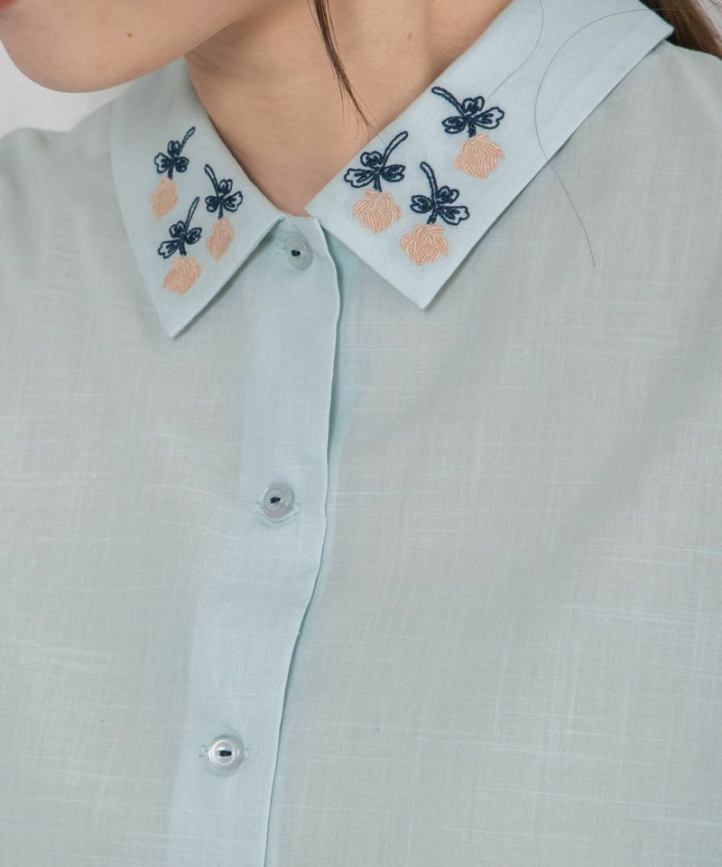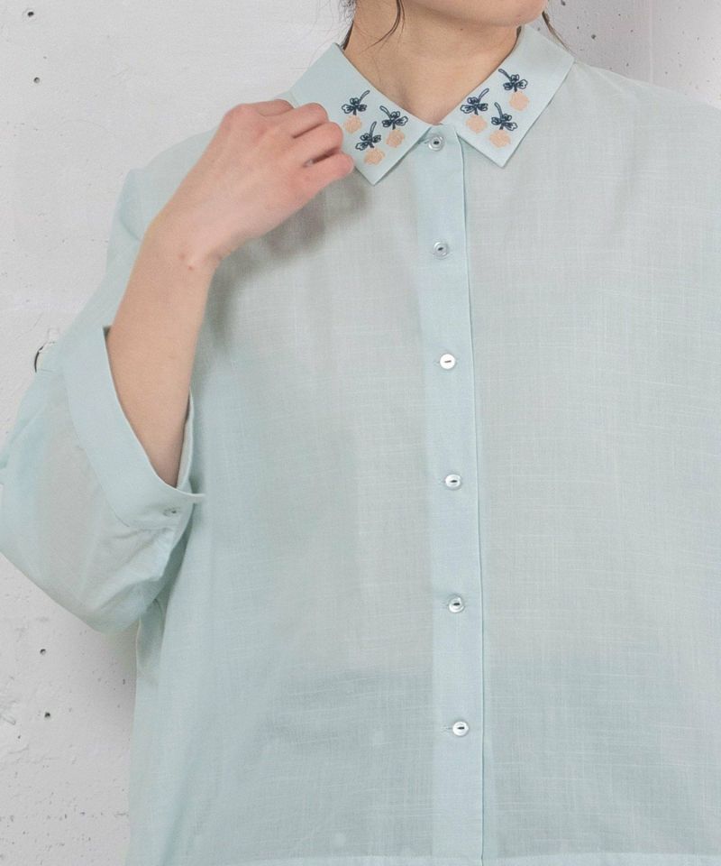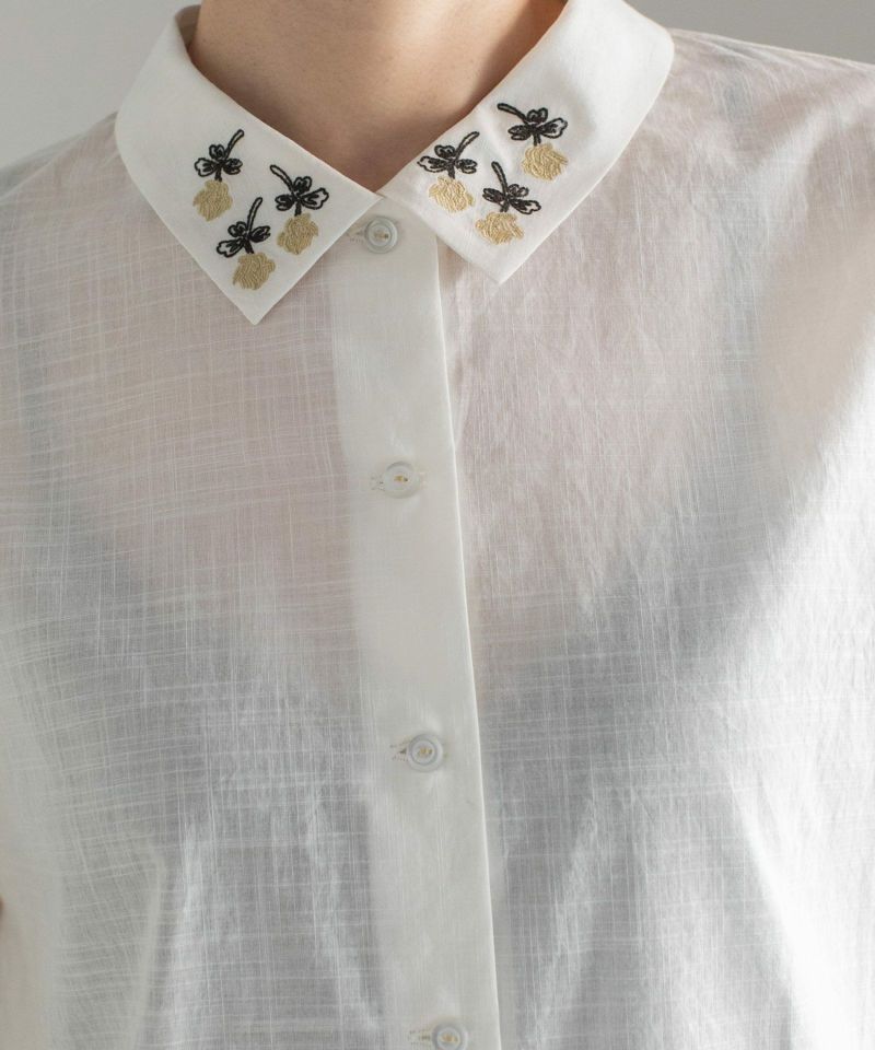 衿にシロツメクサの刺繍を施したブラウス。身頃は四角いシルエットで甘さを控えめにしています。後ろを少し長めにし、前後差を付けた着丈でこなれ感のあるデザイン。肘が隠れる袖丈で長い季節着られます。糸の細いスラブローン生地を使用し、夏にぴったりの清涼感のある軽い雰囲気に仕上げています。