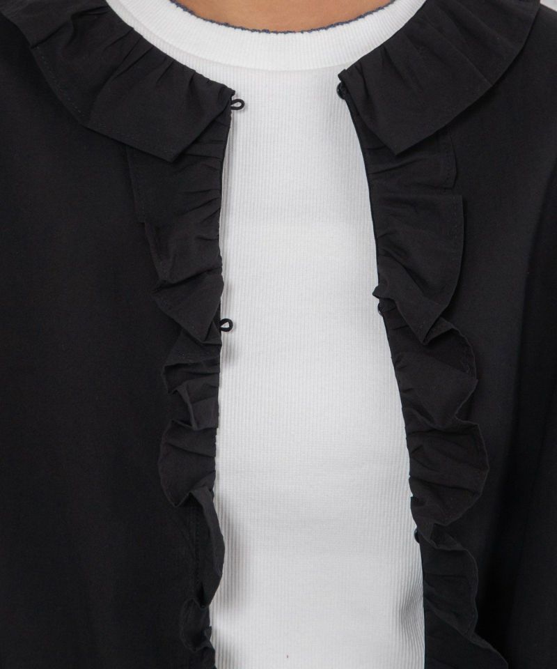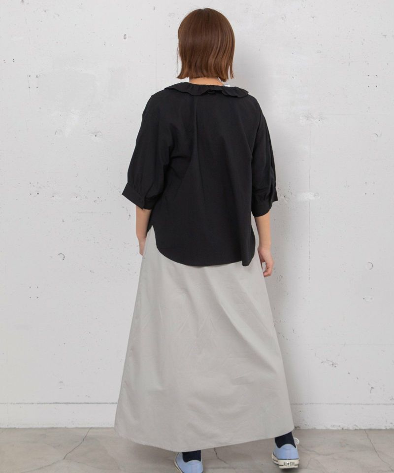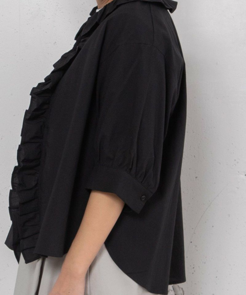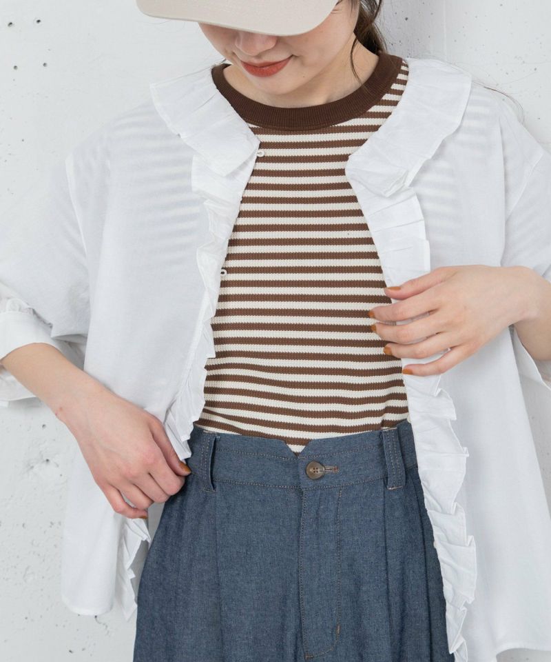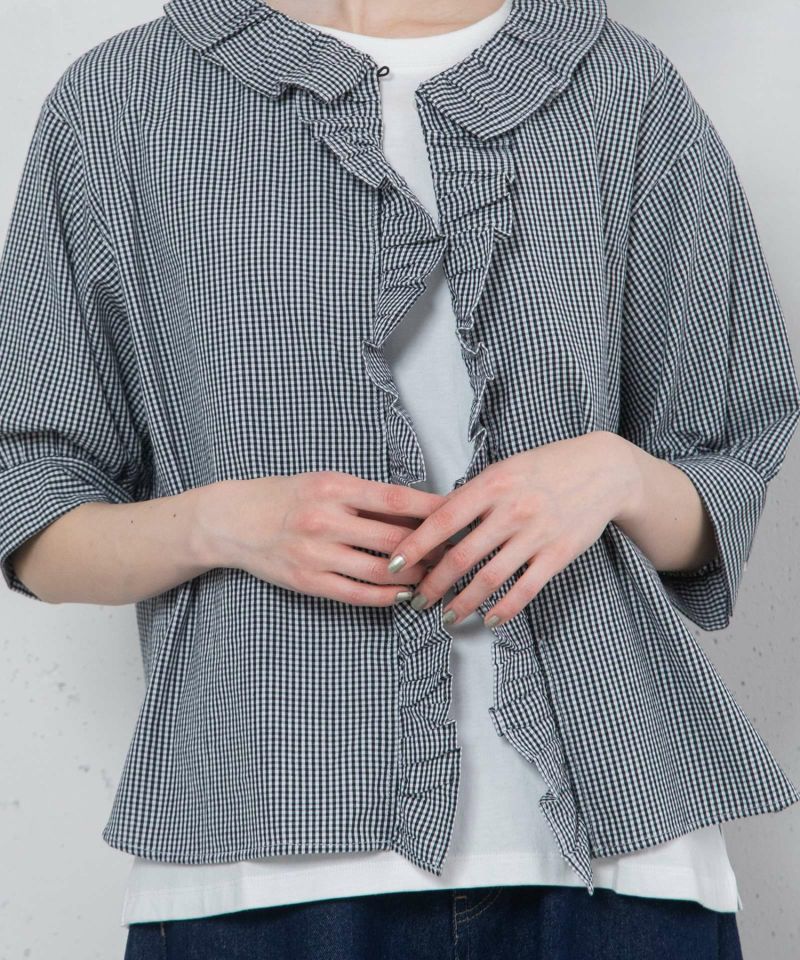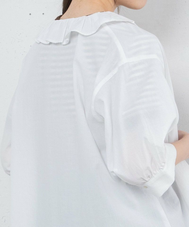 衿とフロントにギャザーフリルをあしらったブラウス。抜け感があり、羽織としても使いやすいです。コーディネートもこなれた雰囲気で仕上がる洗い晒しコットン生地を使用しています。ボーダーやデニムなどカジュアルなアイテムとのバランスも取りやすく、お手持ちのアイテムにプラスするだけで新鮮なスタイリングが楽しめます。