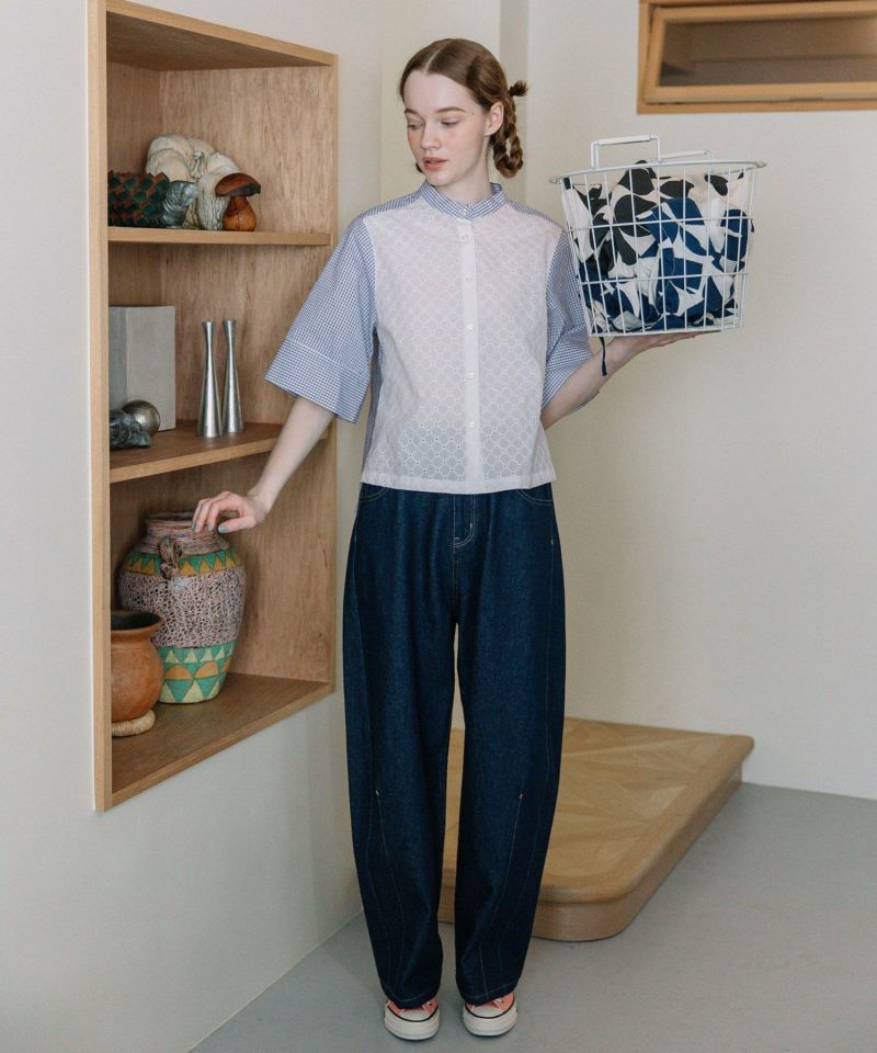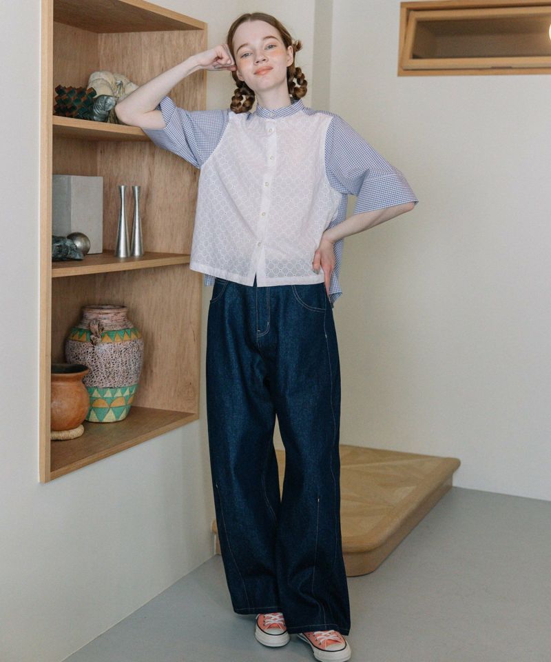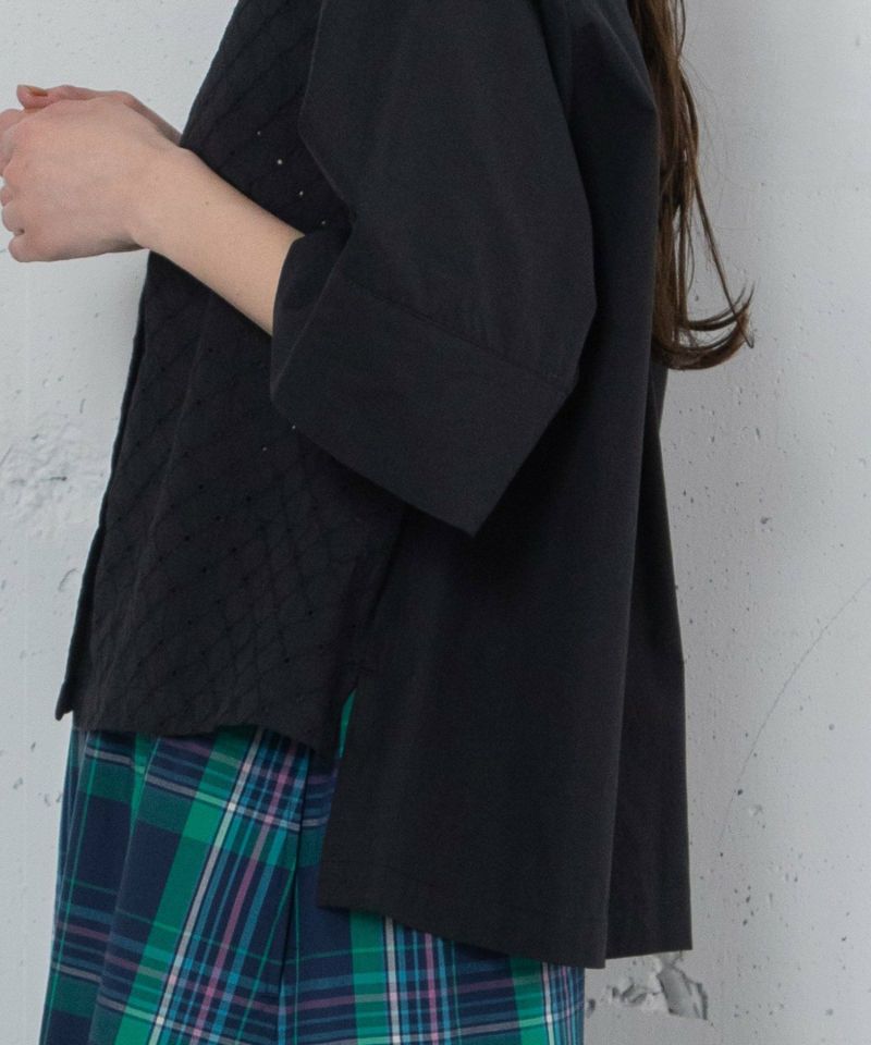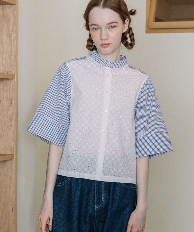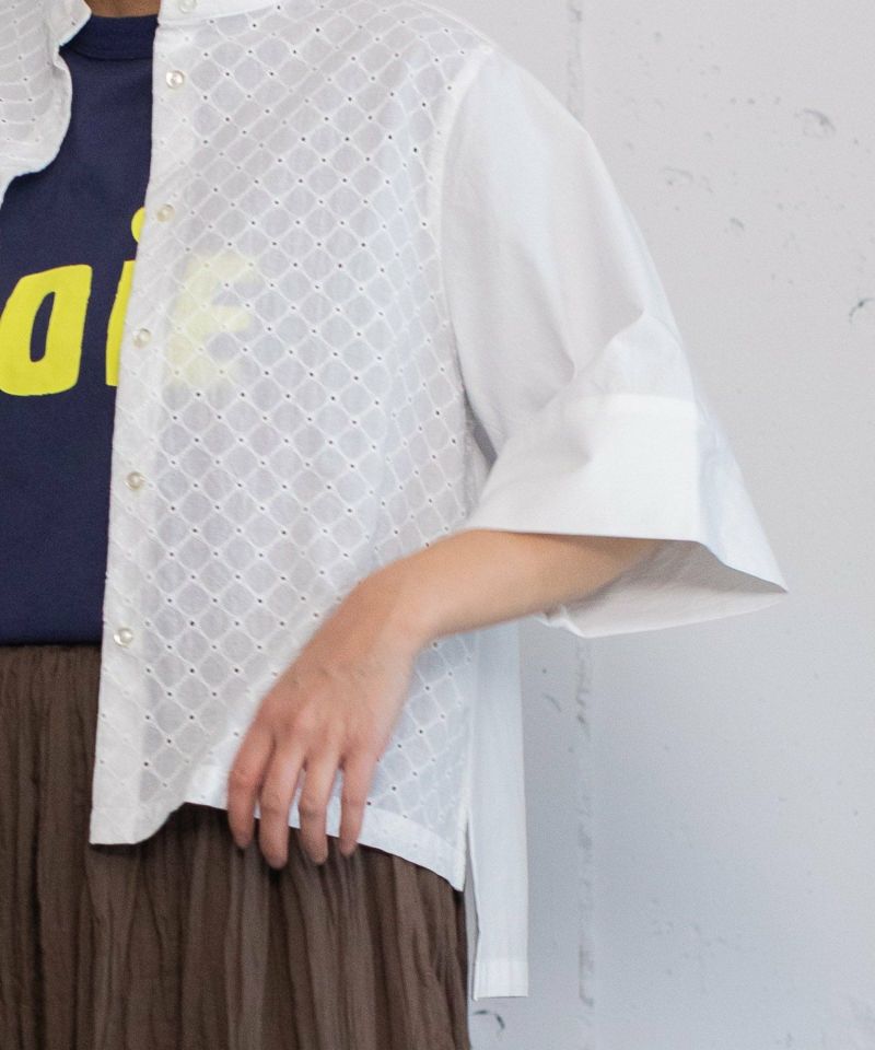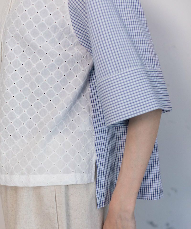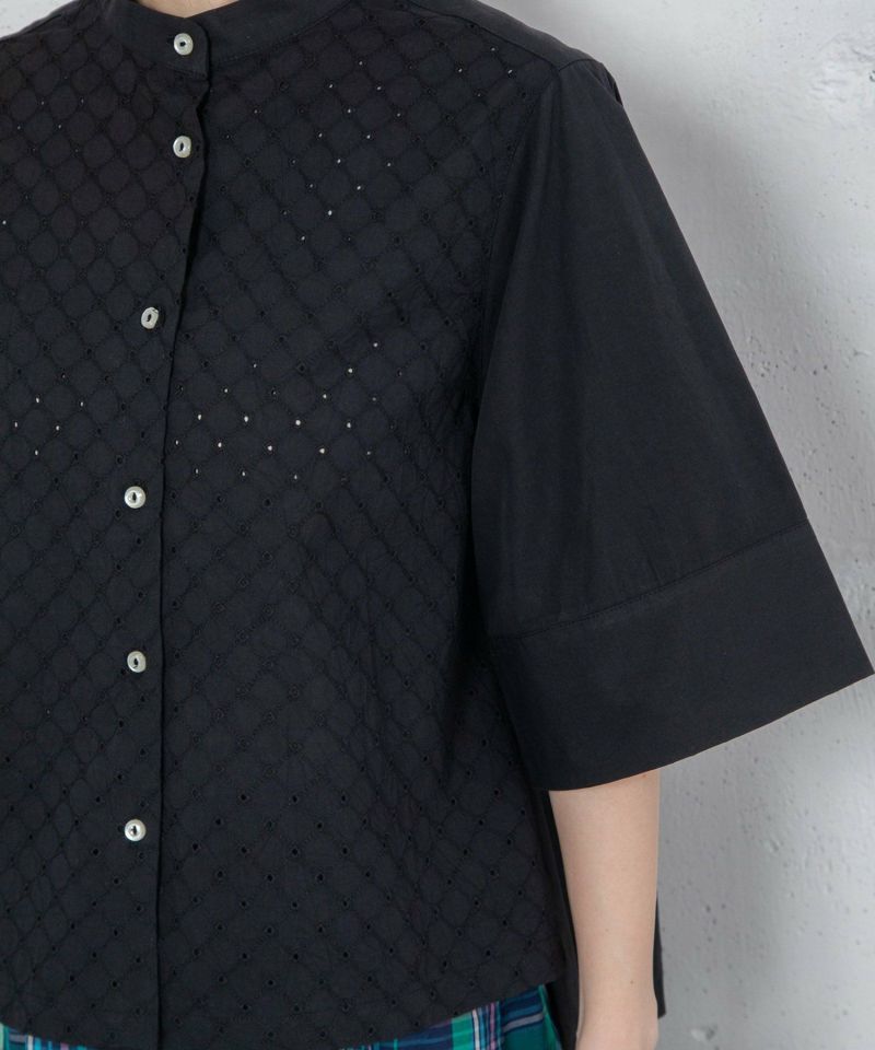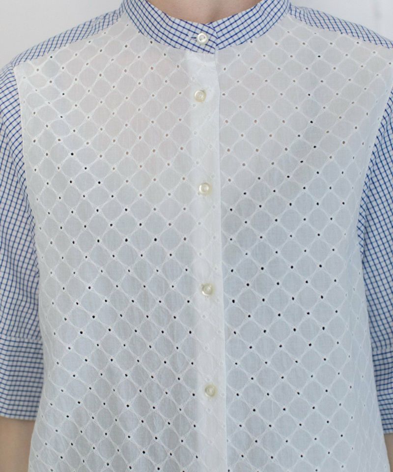 前身頃にエンブロイダリーレース生地を使用したシャツ。穴の開いたレース生地で涼しげな印象です。細めのスタンドカラーで甘さを控えてきちんと感を出しました。腕を華奢に見せてくれるひじ丈で、少し広がった袖と太めのカフスがポイント。オフホワイトとブラックは同色系、ブルーのウインドゥペンチェックはオフホワイトのエンブロイダリーとかけ合わせた爽やかな配色です。フルオープンで羽織りとしても着られます。