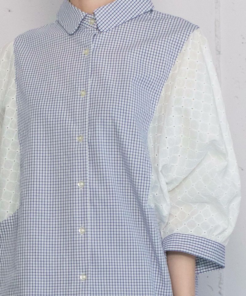 袖をエンブロイダリーレースで切り替えたブラウス。身頃側に切り替えたウェッジスリーブのデザインで、ゆったりとした袖周りです。角丸のシャツ衿がきちんと感もありながら優しい印象に。オフホワイトとブラックは同色系、ブルーのウインドゥペンチェックはオフホワイトのエンブロイダリーとかけ合わせた爽やかな配色です。フルオープンで羽織りとしても着られます。