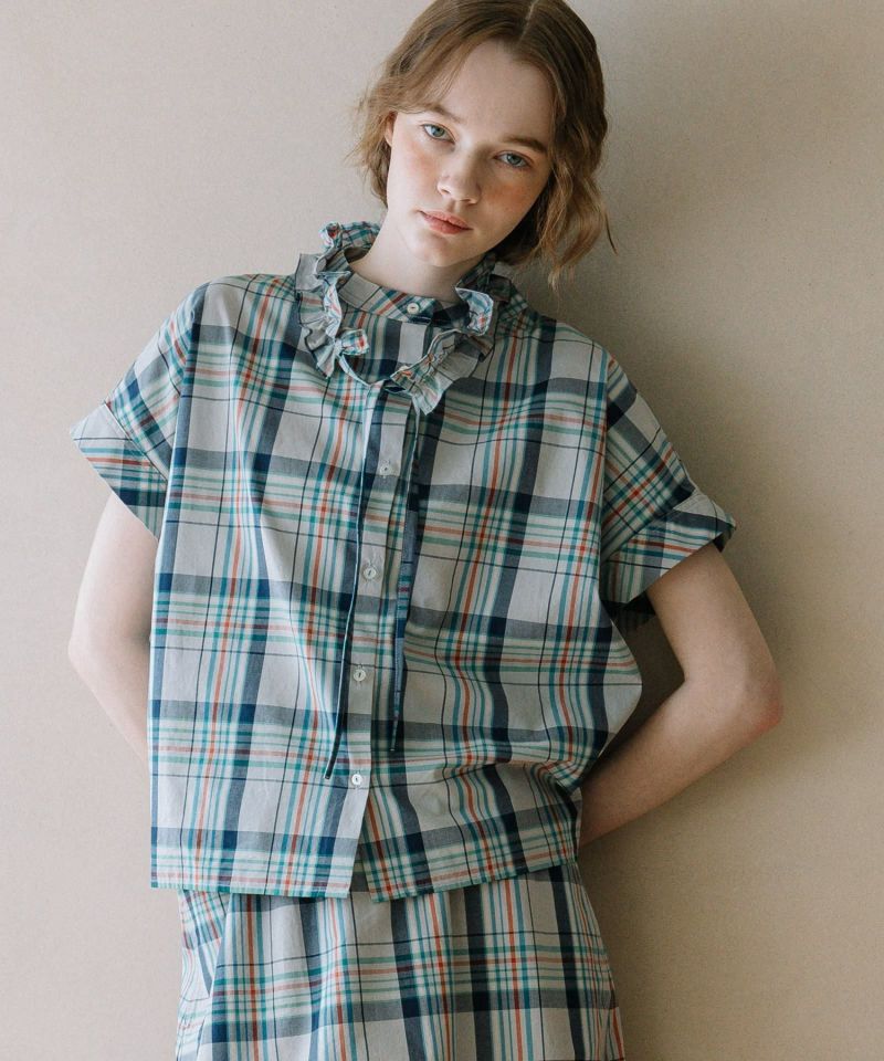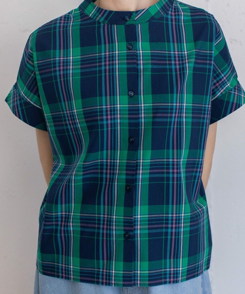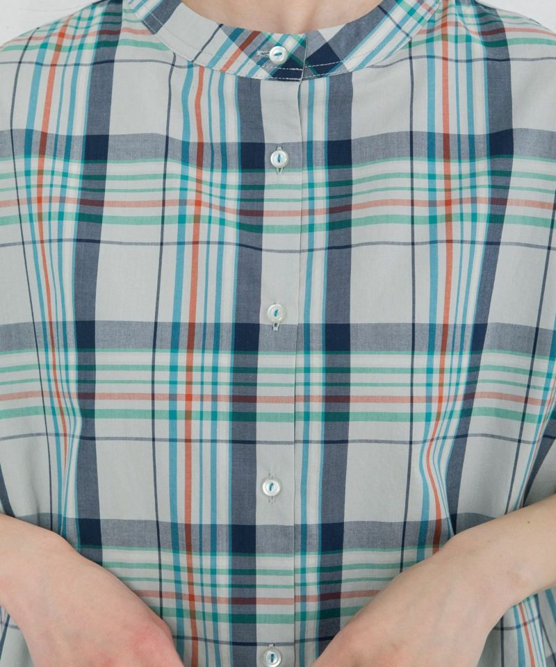 パッと目を惹くオリジナルのマドラスチェック柄のブラウス。多色使いながらもまとまったカラーリングで落ち着いた雰囲気に仕上げました。程よく首から離れたスタンドカラーがきちんと見えするデザイン。身頃続きの袖もゆったりとしていて涼しく着られます。フルオープンで羽織りとしても使えます。