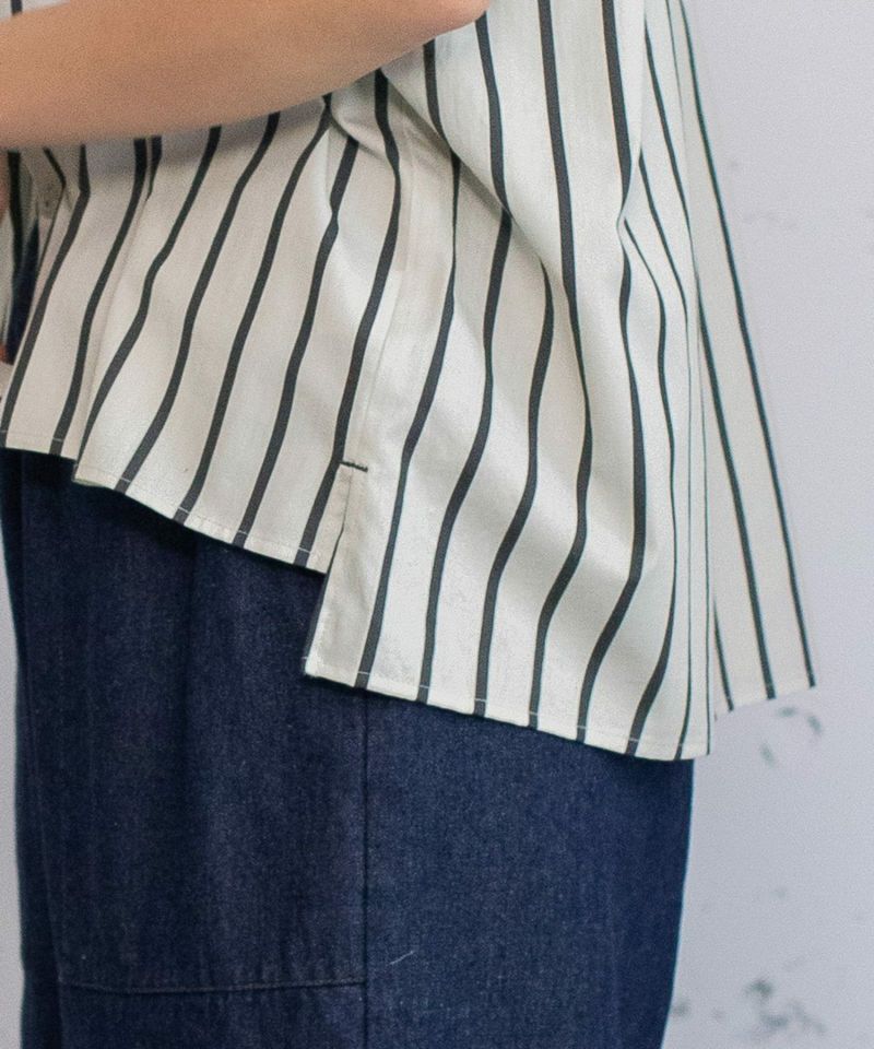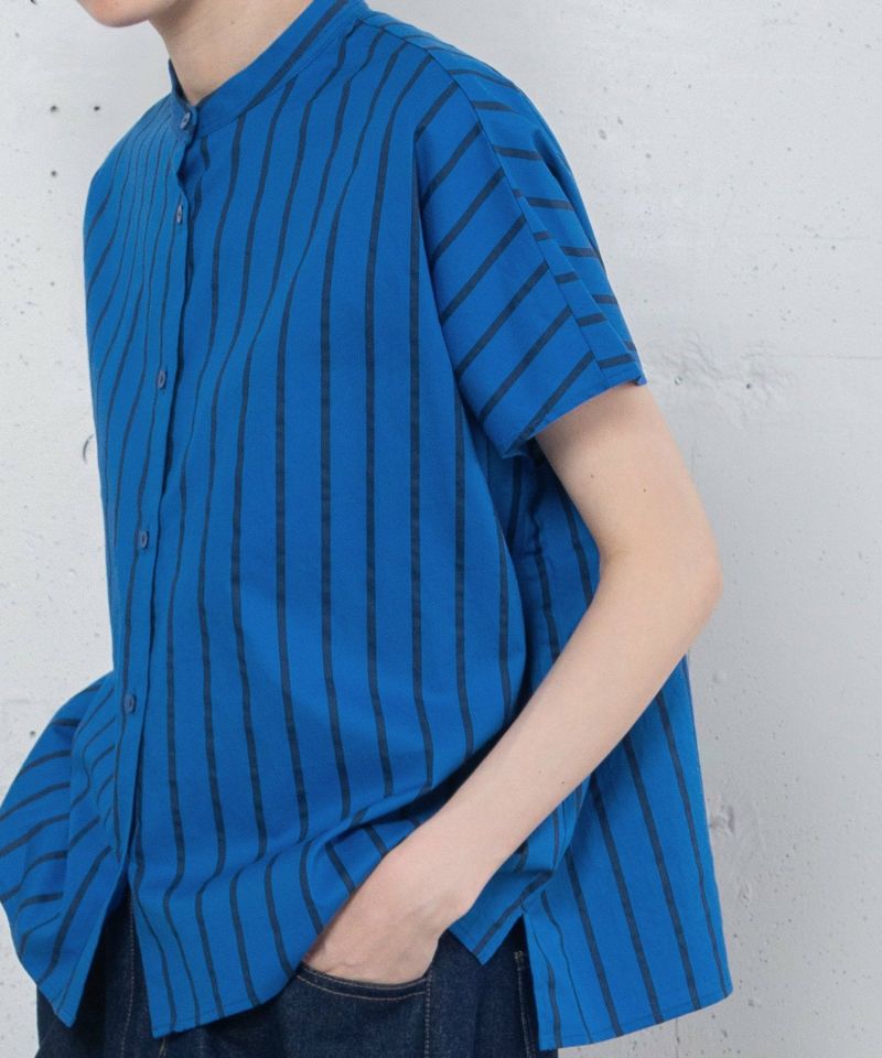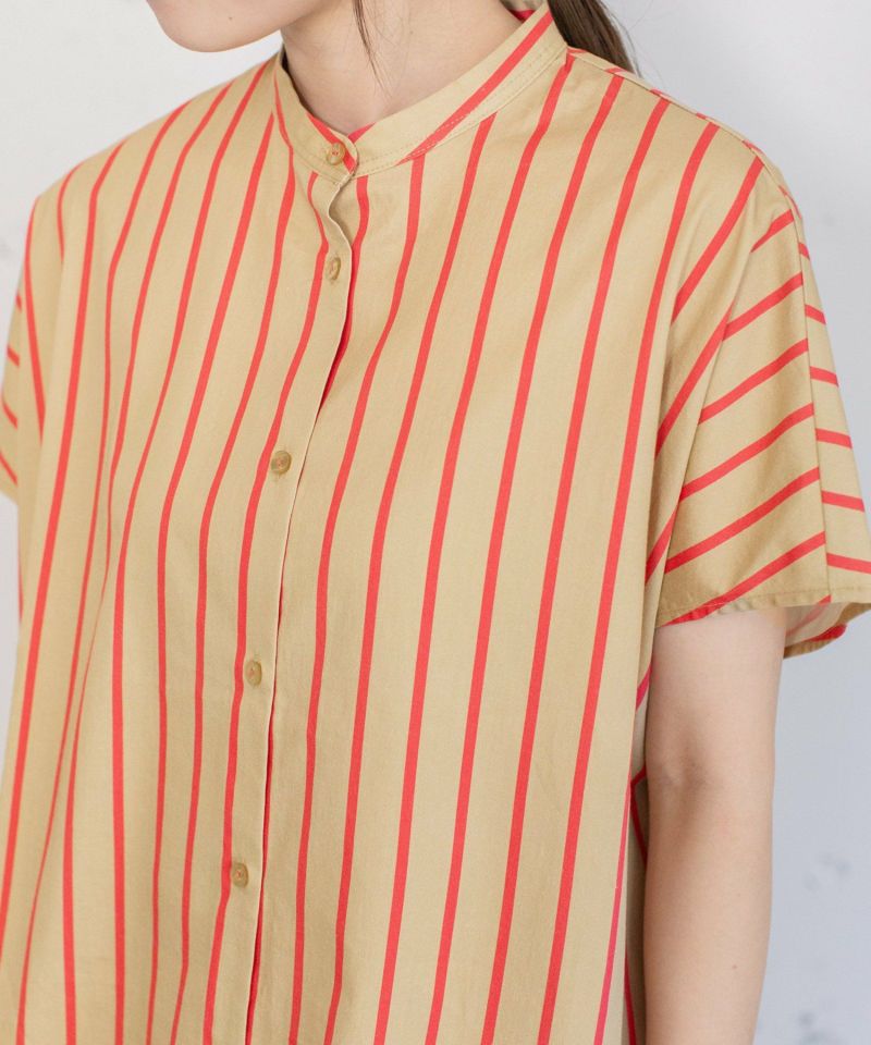 オリジナルカラーのストライププリントが目を惹くシャツ。程よく首から離れたスタンドカラーできちんと感があります。ゆとりのある四角いシルエットでラフに着られ、フルオープンで羽織りとしても着られます。前後差のある着丈とサイドのスリットがこなれた雰囲気に。
