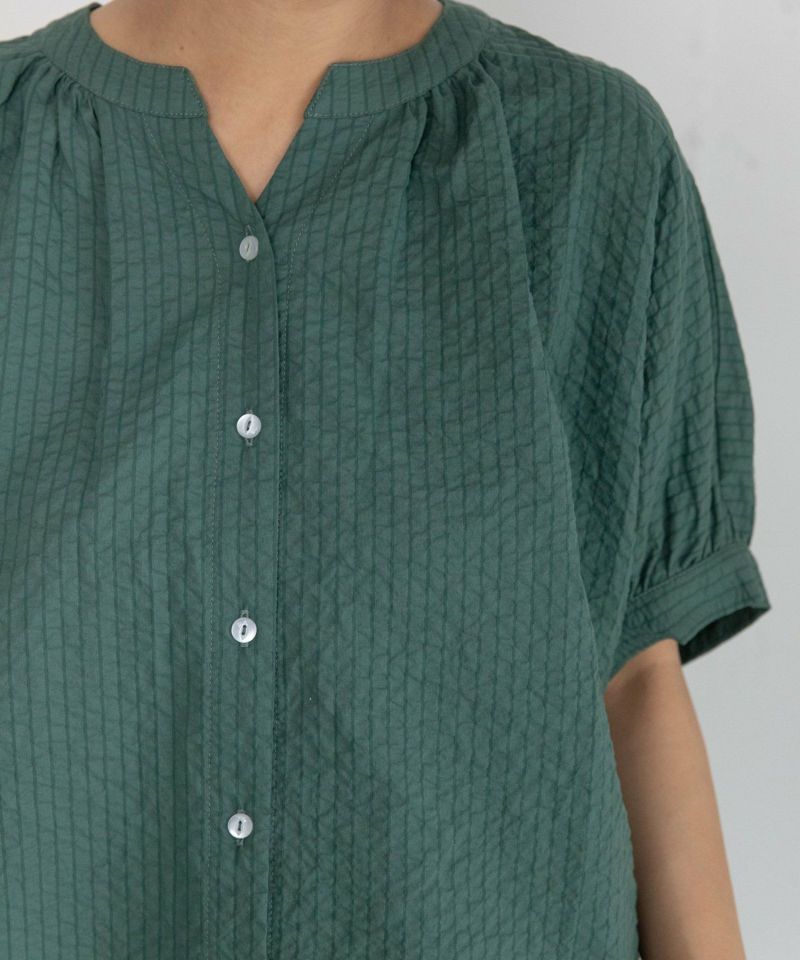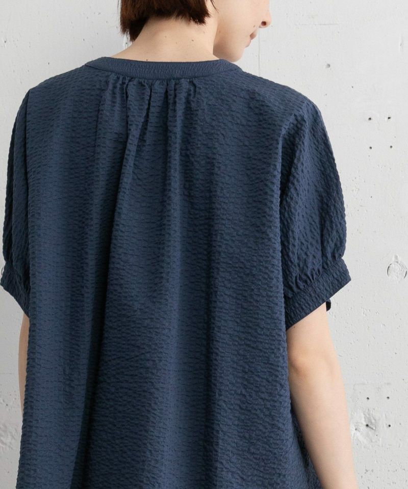 ちりちりぽこぽことした表面感のサッカーストライプを使用したブラウス。コットン100%の天然素材で、ノーアイロンで着られるのがうれしい夏にぴったりのアイテムです。身頃続きのドルマンスリーブはゆったりとしてリラクシーな着心地、ぷっくりとさせた袖口もポイントです。スキッパー衿が涼しげなデザイン。着丈に前後差をつけ、シンプルながらこなれた雰囲気で着用できるシャツです。通気性が良く涼しい着心地が魅力です。