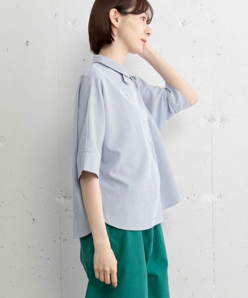 タイカラーのように重なった衿デザインがポイントのシャツ。袖の切り替えがない身頃続きのドルマンスリーブのシルエットで、Tシャツのように気軽に着られます。きれいめも、デニム合わせのカジュアルな着こなしもおすすめです。無地のオフホワイト、ウィンドゥペンチェック、ドット柄の3色展開。