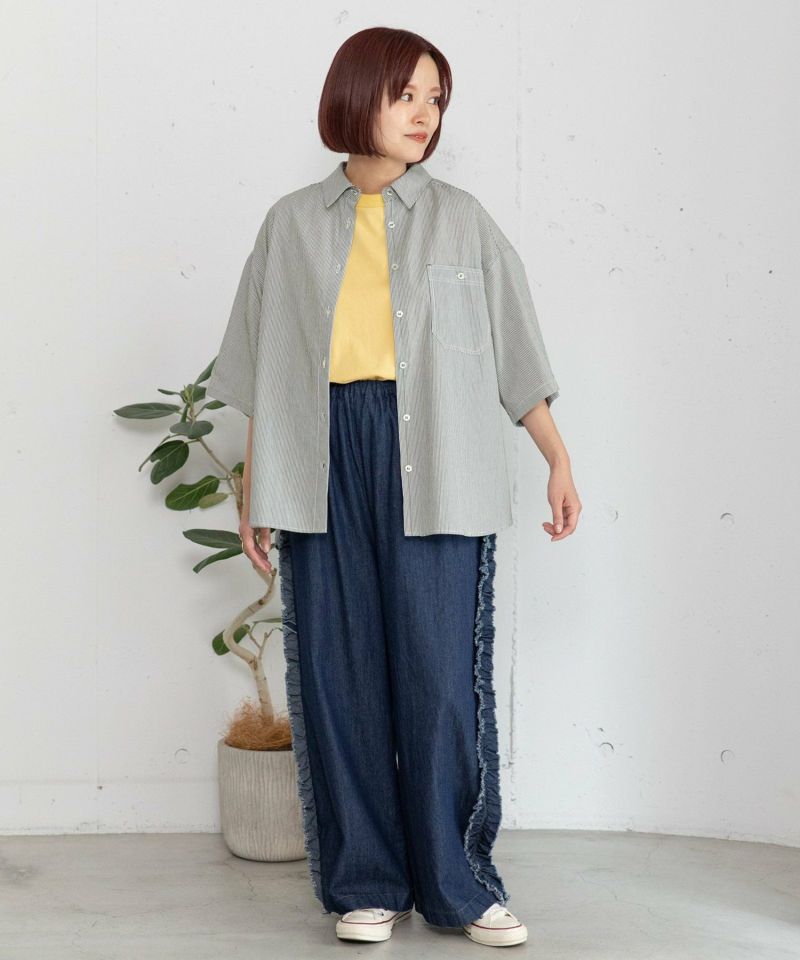 背中のざっくりとしたロゴ刺繍が目を引くシャツ。トレンドのオーバーサイズシルエットが魅力です。軽やかな素材感で、夏の羽織りとしても活躍。Tシャツ+パンツにさらっと羽織るだけで、今っぽいコーディネートを楽しめます。