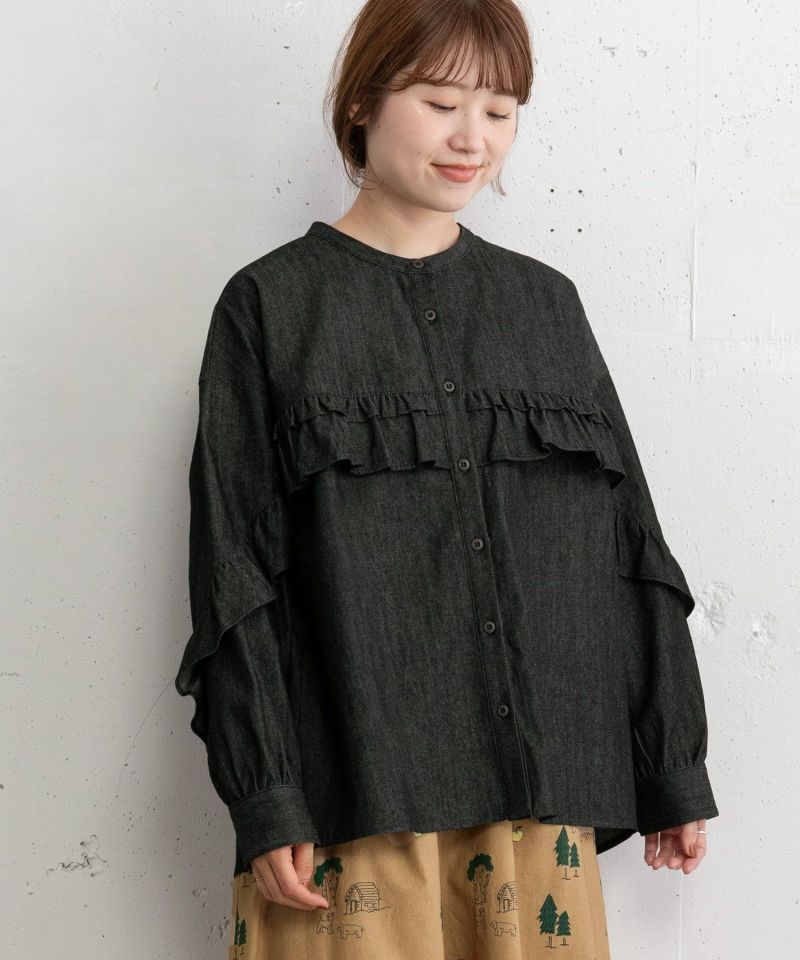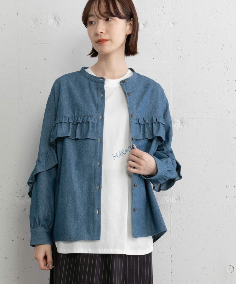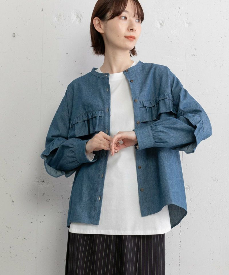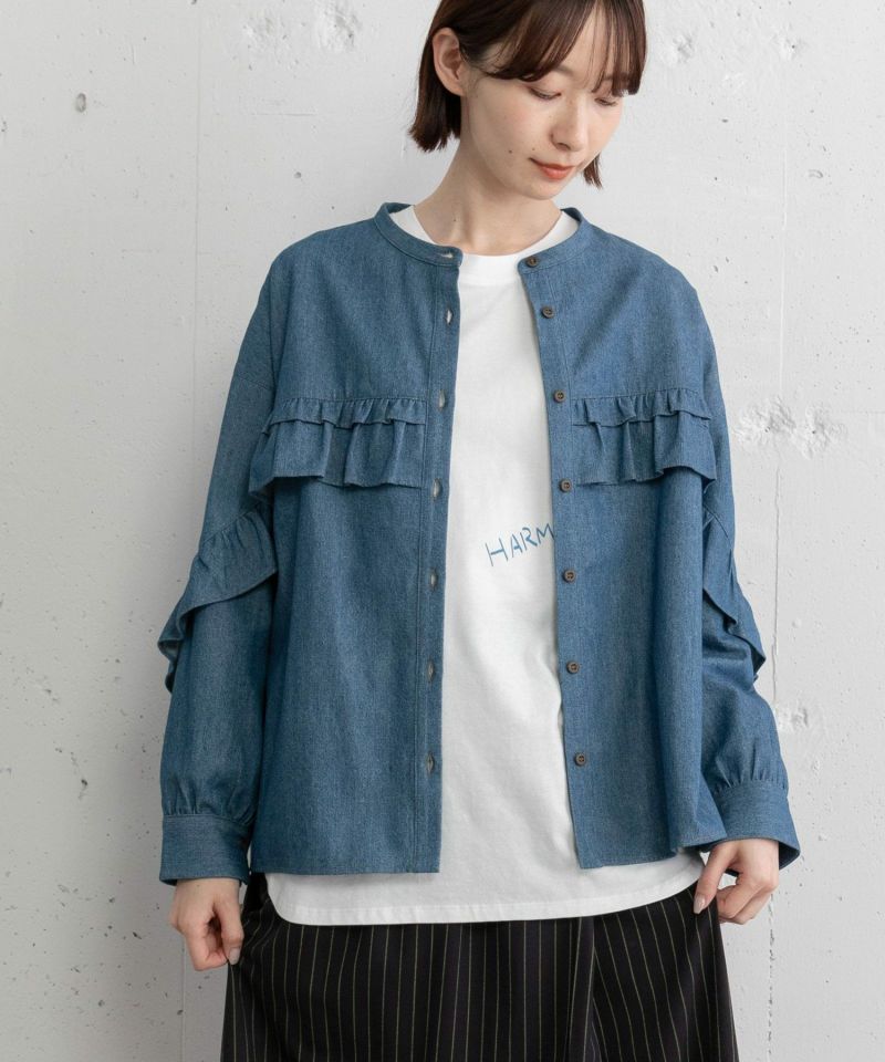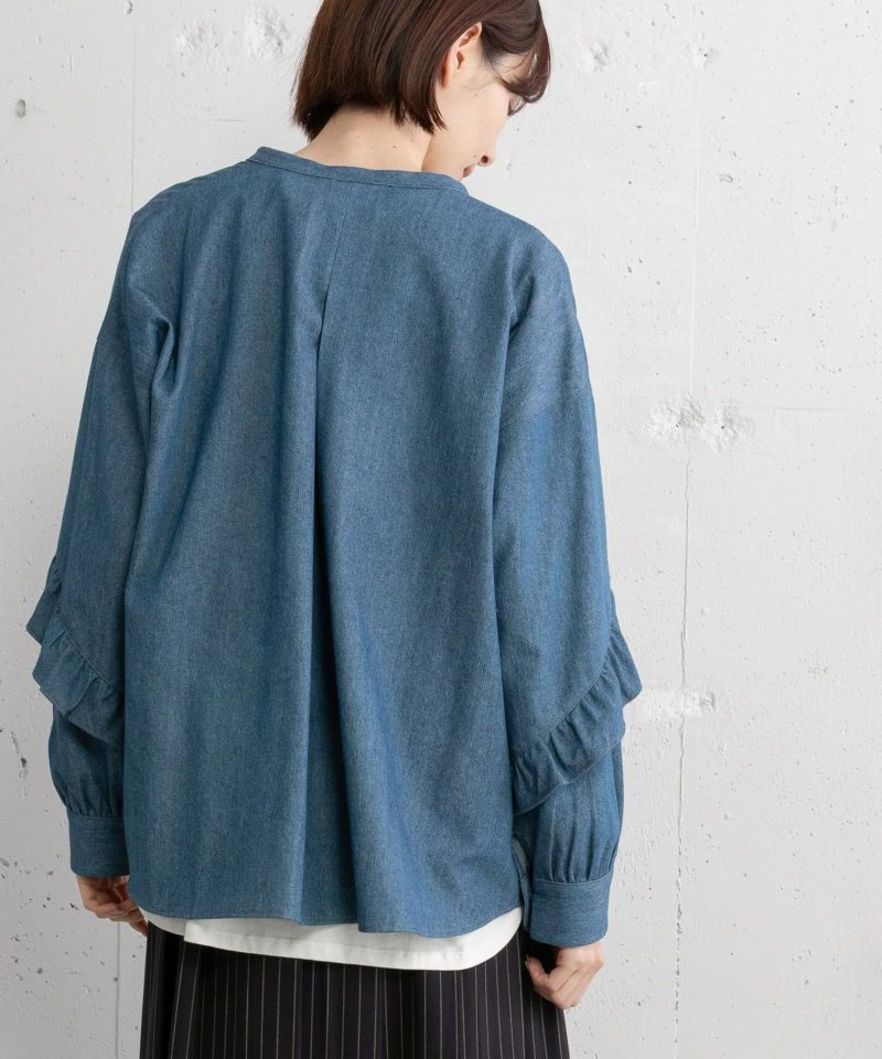 身頃から袖に続くフリルディテールがポイントのブラウス。1枚で華やかなスタイリングが完成です。やわらかなライトオンスデニムで仕立てました。細めのスタンドカラーでネック回りはすっきりと、肩が落ちたゆとりのあるシルエットで気負わずに着られます。カットソーに羽織ってカジュアルダウンさせて着るのもオススメです。