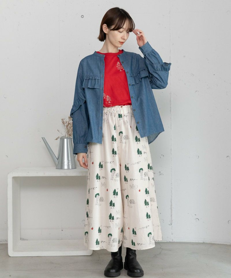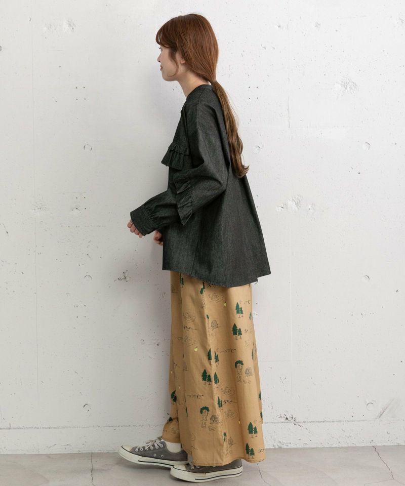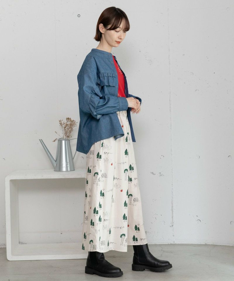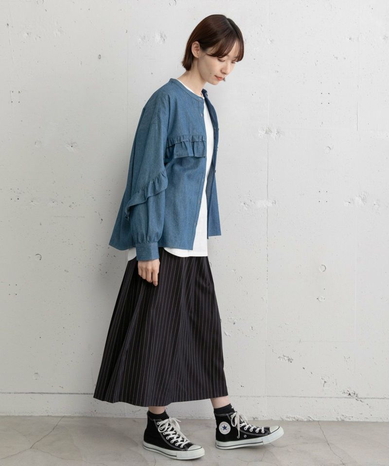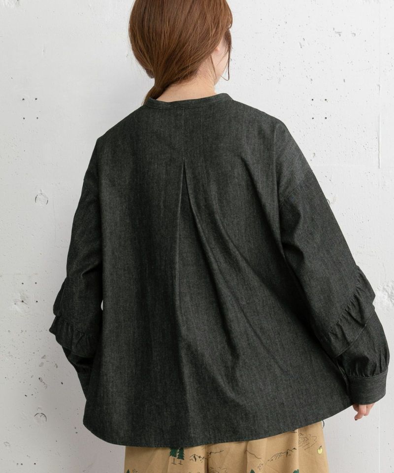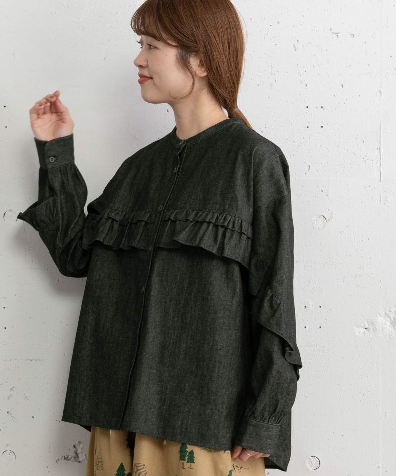 身頃から袖に続くフリルディテールがポイントのブラウス。1枚で華やかなスタイリングが完成です。やわらかなライトオンスデニムで仕立てました。細めのスタンドカラーでネック回りはすっきりと、肩が落ちたゆとりのあるシルエットで気負わずに着られます。カットソーに羽織ってカジュアルダウンさせて着るのもオススメです。