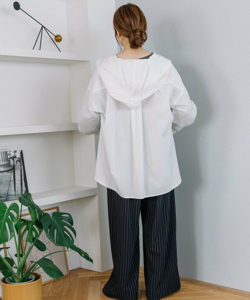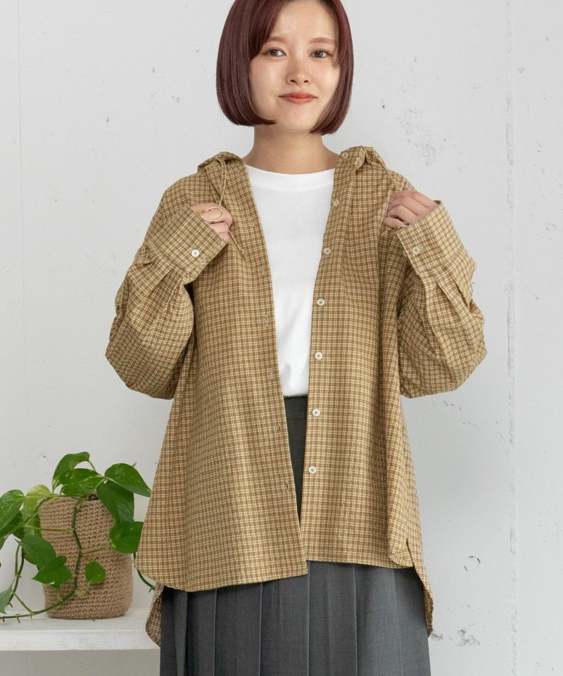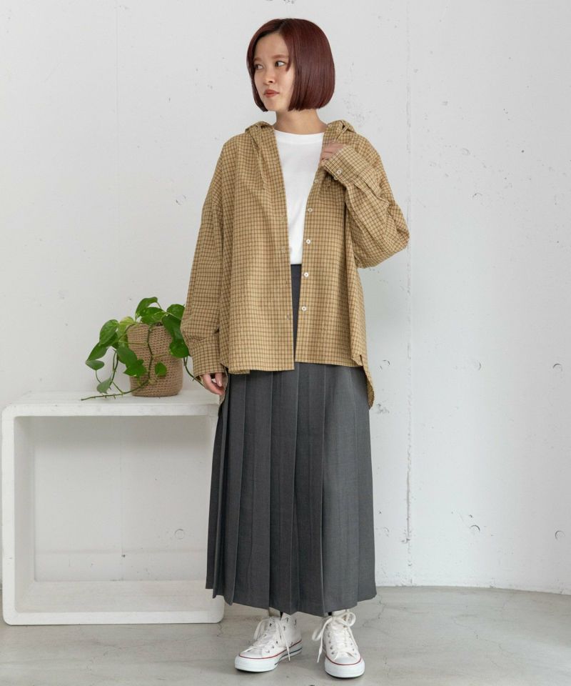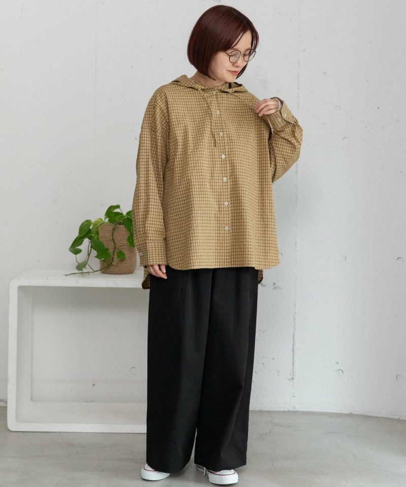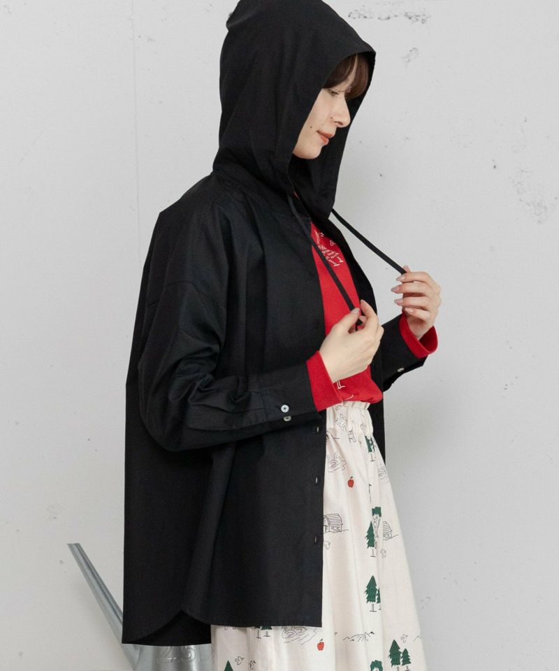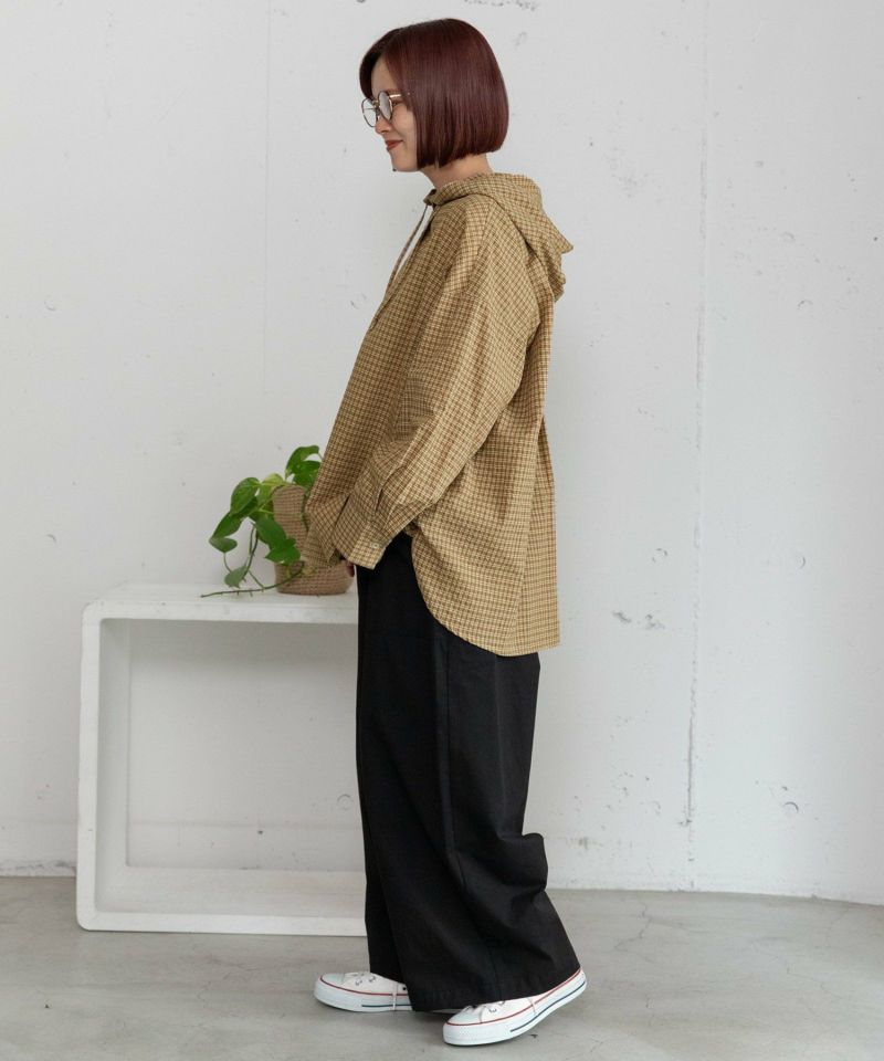 カジュアルな印象のフーディシャツ。羽織やすいゆったりとしたシルエットで、こなれた雰囲気を演出します。着回しがしやすいベーシックなオフホワイト・ブラックと、ユーズドアイテムのような雰囲気のあるチェックの3色展開です。
