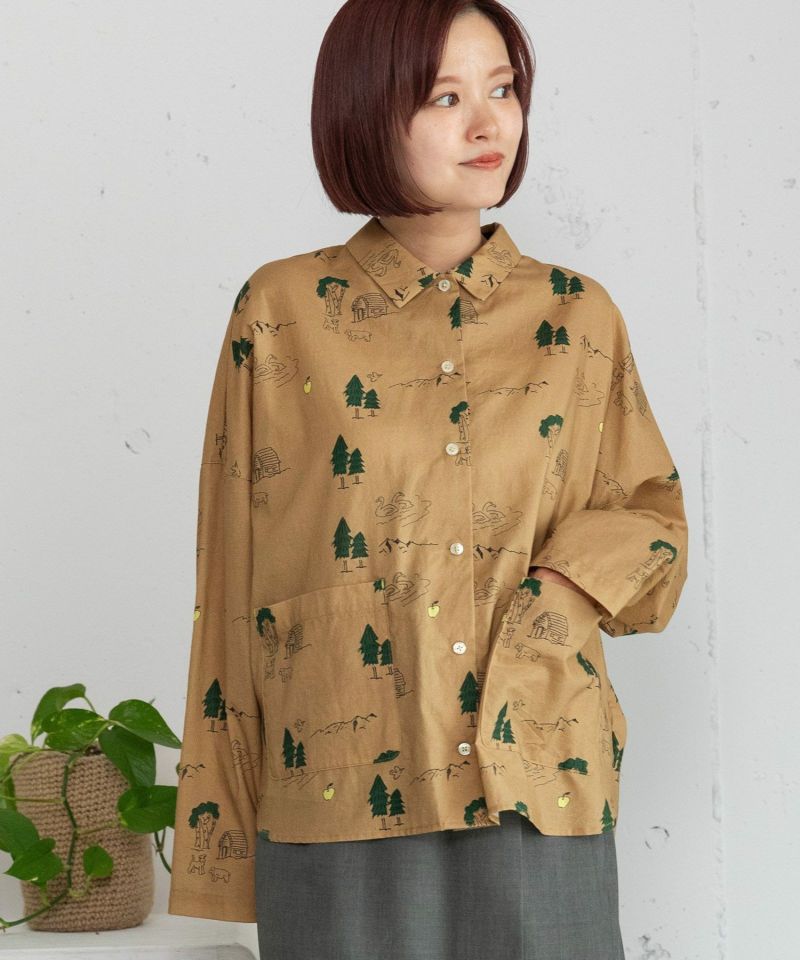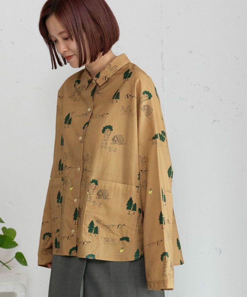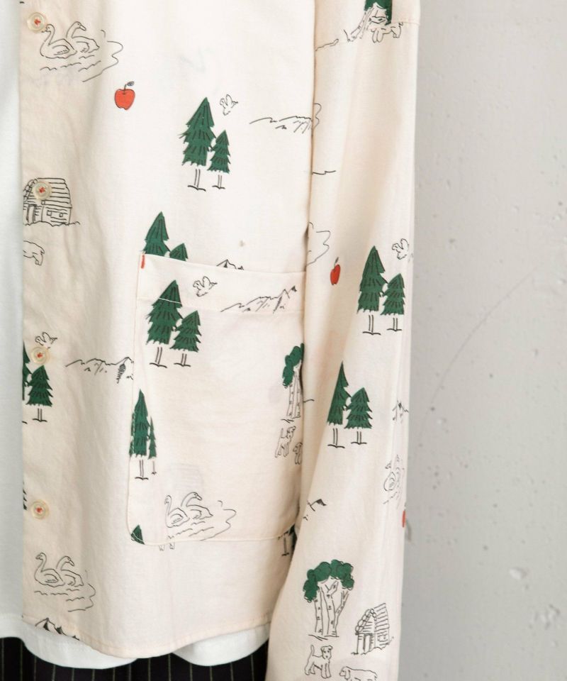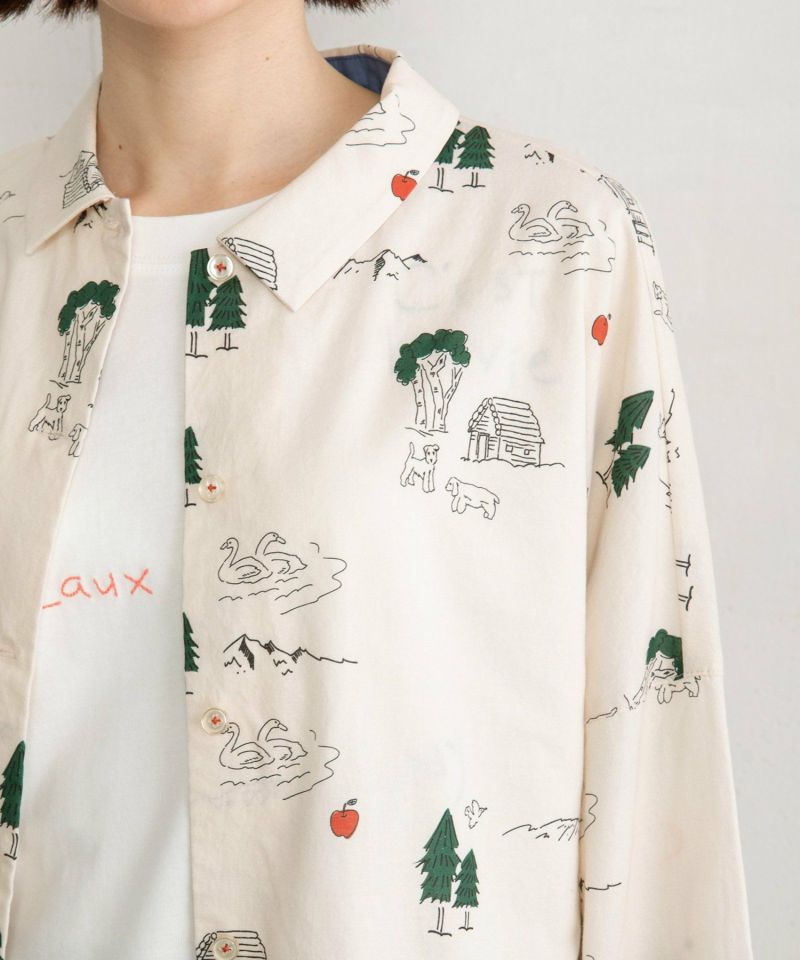オリジナルのスワンレイク柄をプリントしたポケットシャツ。コットンキャンブリックの素朴な風合いが優しい雰囲気。肩を落としたゆとりのあるサイジングで羽織りとしても使えます。すとんとしたシンプルな袖口で捲りやすく、袖口からインナーをチラ見せさせるのもおすすめです。