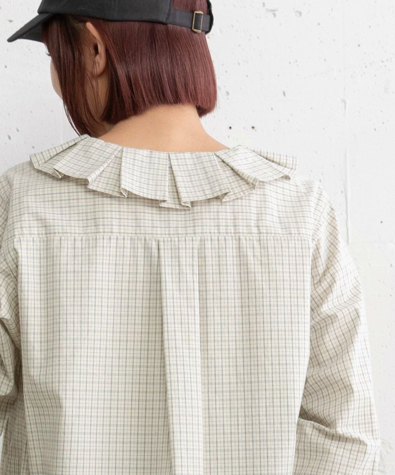 メンズライクなオーバーサイズをベースに、程よい甘さのプリーツ衿をのせたシャツ。ニットやスウェットにも重ねやすく、通年着られるコットン素材を使用しました。腰まわりが隠れる長さの丸みのあるラウンドヘム仕様で、トップスの裾からちらりと出すのもオススメ。無地のオフホワイトとダークブラウン、チェックの3色展開です。