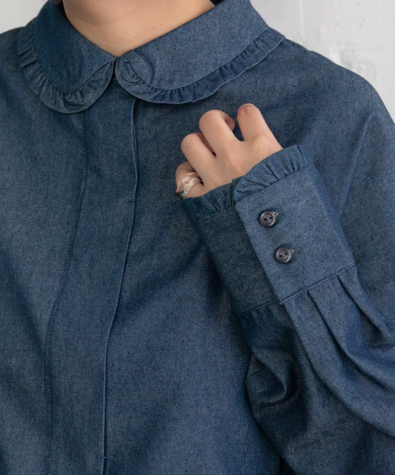 メンズライクなオーバーサイズをベースに、程よい甘さのフリル衿をのせたシャツ。袖口のカフス端にもフリルをあしらいました。ニットやスウェットとも重ねやすく、通年着られるコットン素材を使用。一枚持っておけばスタイリングの幅が広がるアイテムです。オフホワイトと無地のライトオンスデニム、ブルーベースのストライプの3色展開です。