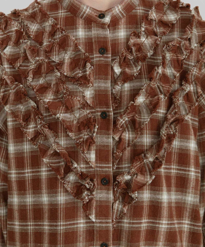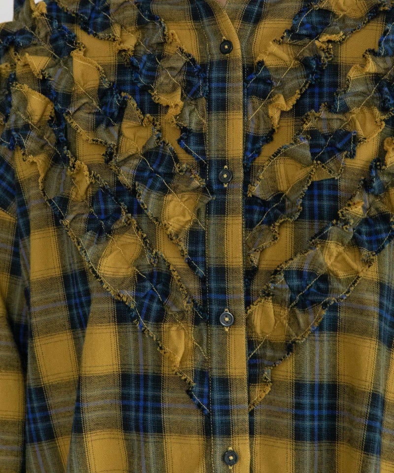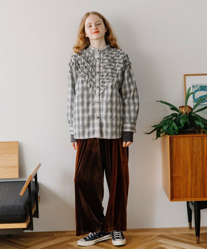 V字にあしらったフリルデザインが印象的な、甘さと辛さを掛け合わせた主役級シャツ。やわらかい起毛感のあるチェック生地で仕立てました。ゆったりとしたオーバーサイズで、羽織ってもインしてもバランスが良いです◎デニム合わせでカジュアルに、スカート合わせで甘辛ミックスな着こなしもおすすめ。