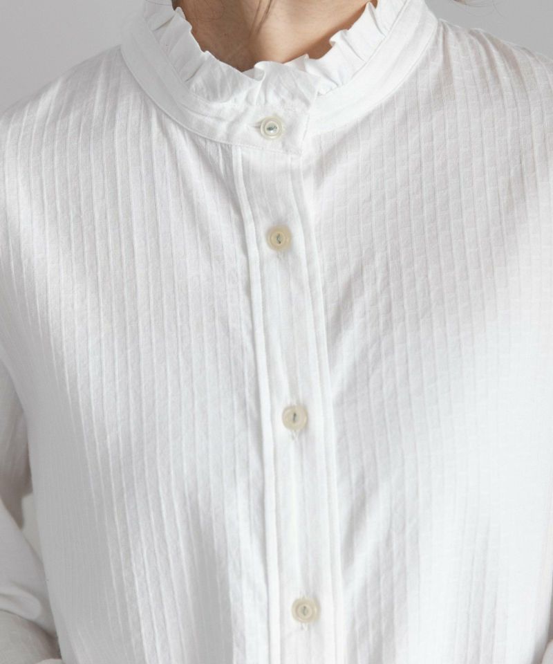 スタンドカラーにフリルをあしらったブラウス。フリル端を断ち切り仕様にする事でラフに仕上げました。身頃はスッキリとしたデザインにし、スタイリングに取り入れやすい、程良い甘さのブラウスに仕上げました。ニットやスウェットのインナーにしてもポイントになります。オフホワイトとブラックはストライプ状のドビー柄が入ったコットン素材、フラワーはネイビーベースに赤の花柄が効いたプリント柄です。