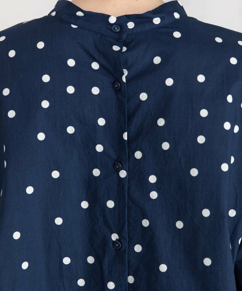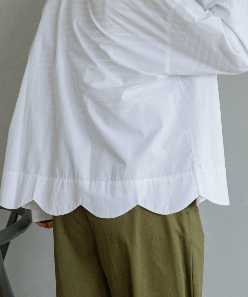 人気の裾スカラップブラウスが長袖になって再登場!裾のなみなみスカラップが印象的なデザインブラウス。細巾で控えめなスタンドカラーが上品な雰囲気です。プルオーバーとしても羽織りとしても、前後両面で着用できます。