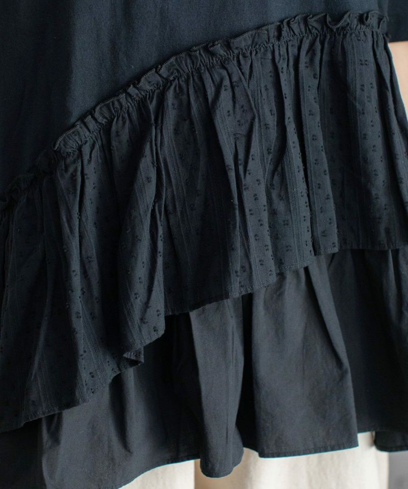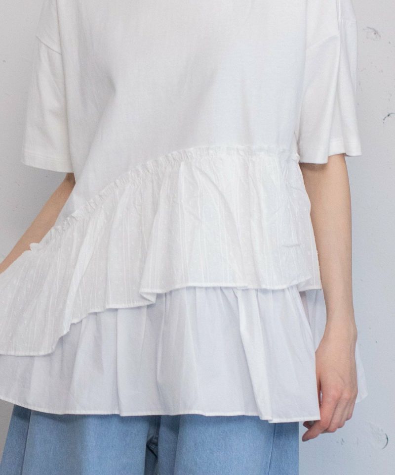 Tシャツにアシンメトリーなフリルを施したフェミニンなデザイントップス。ボディラインを拾わないふわっとしたシルエットとアシンメトリーなデザインで体形カバー効果も◎身頃についたウェーブフリルは透け感のあるストライプドビーで軽やかに仕上げています。