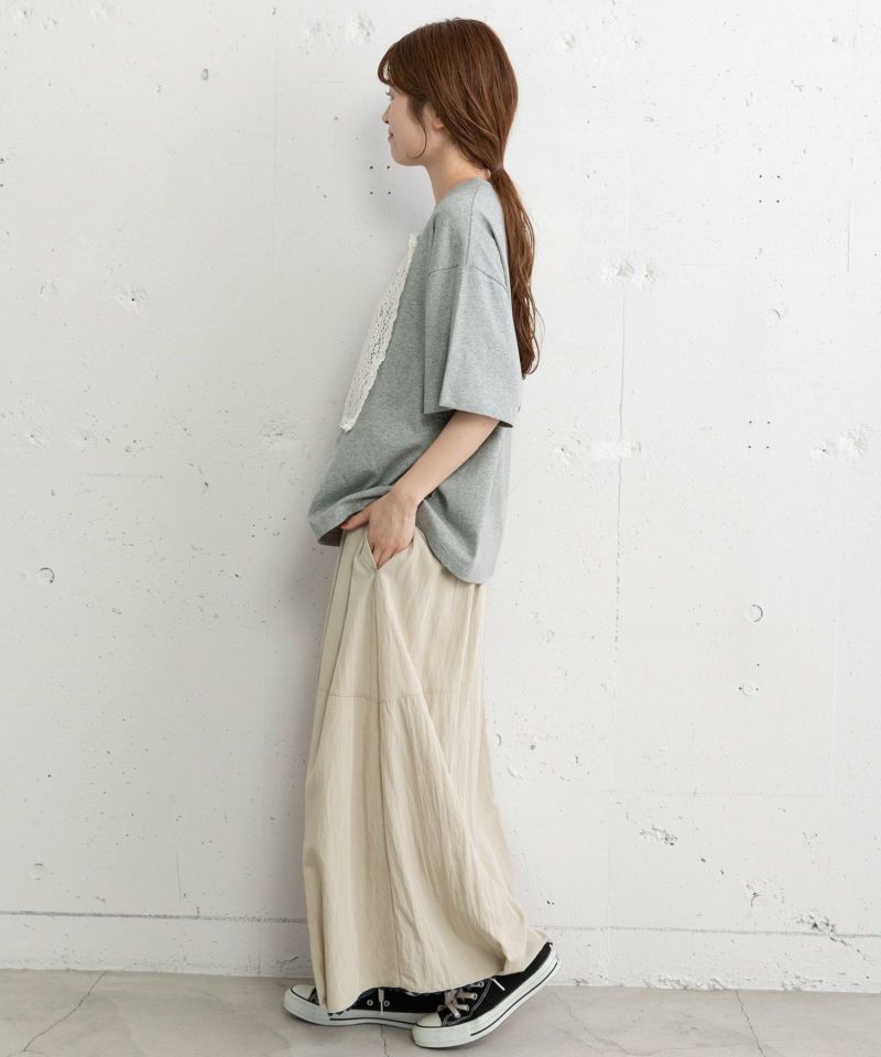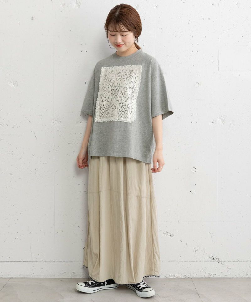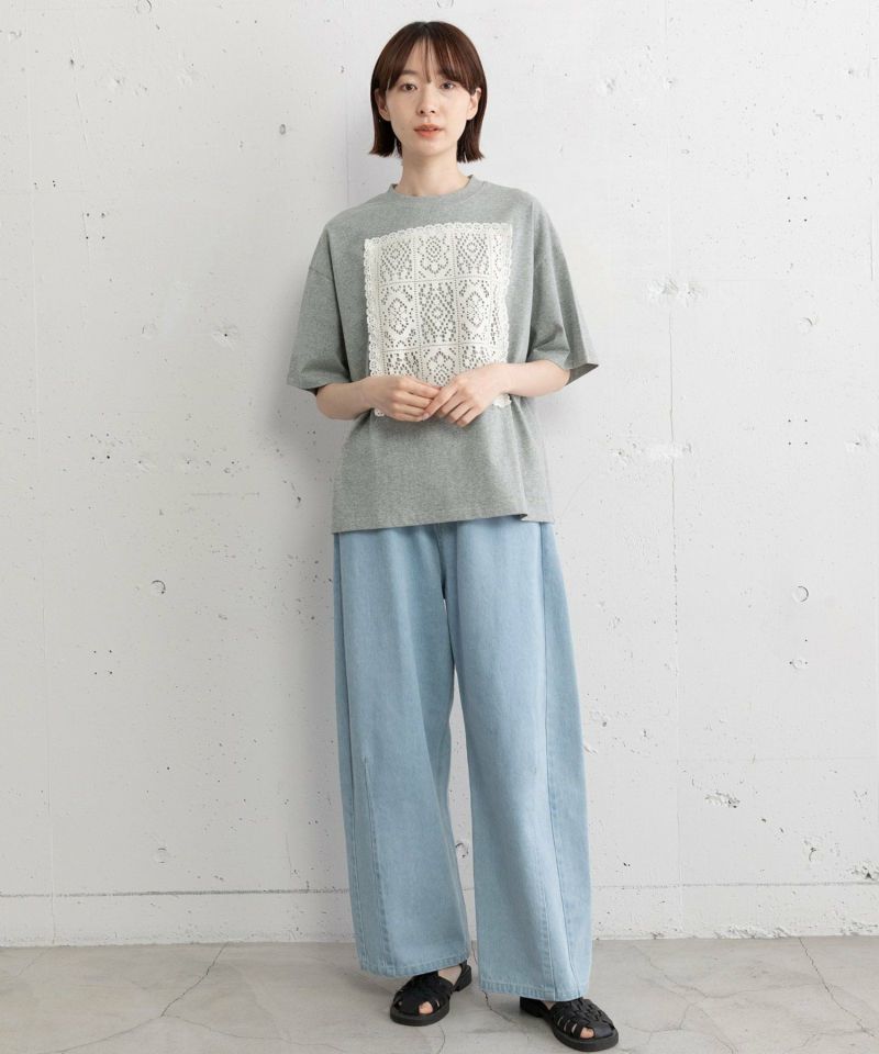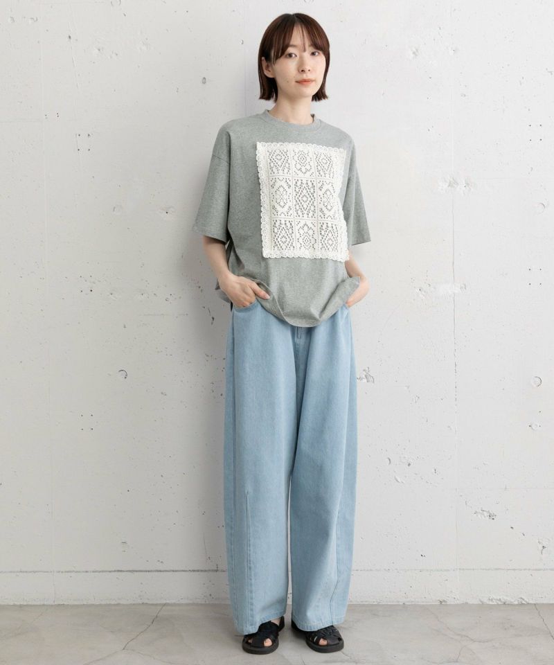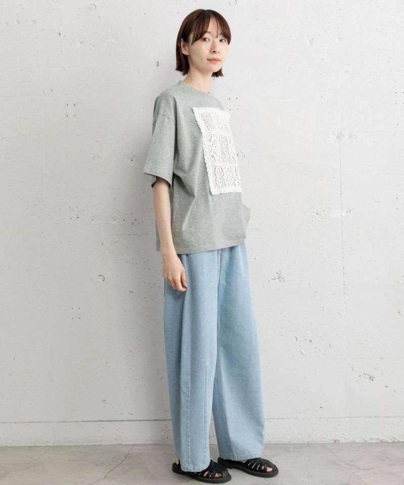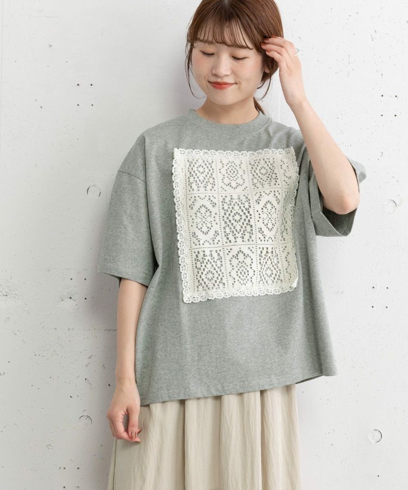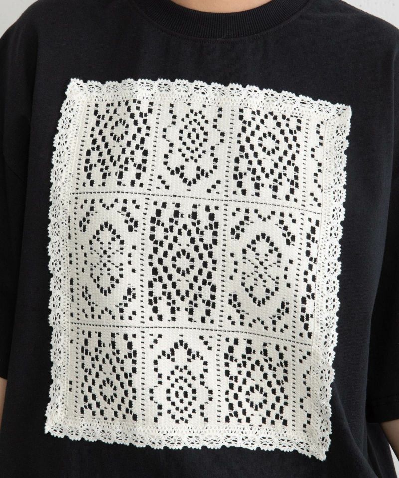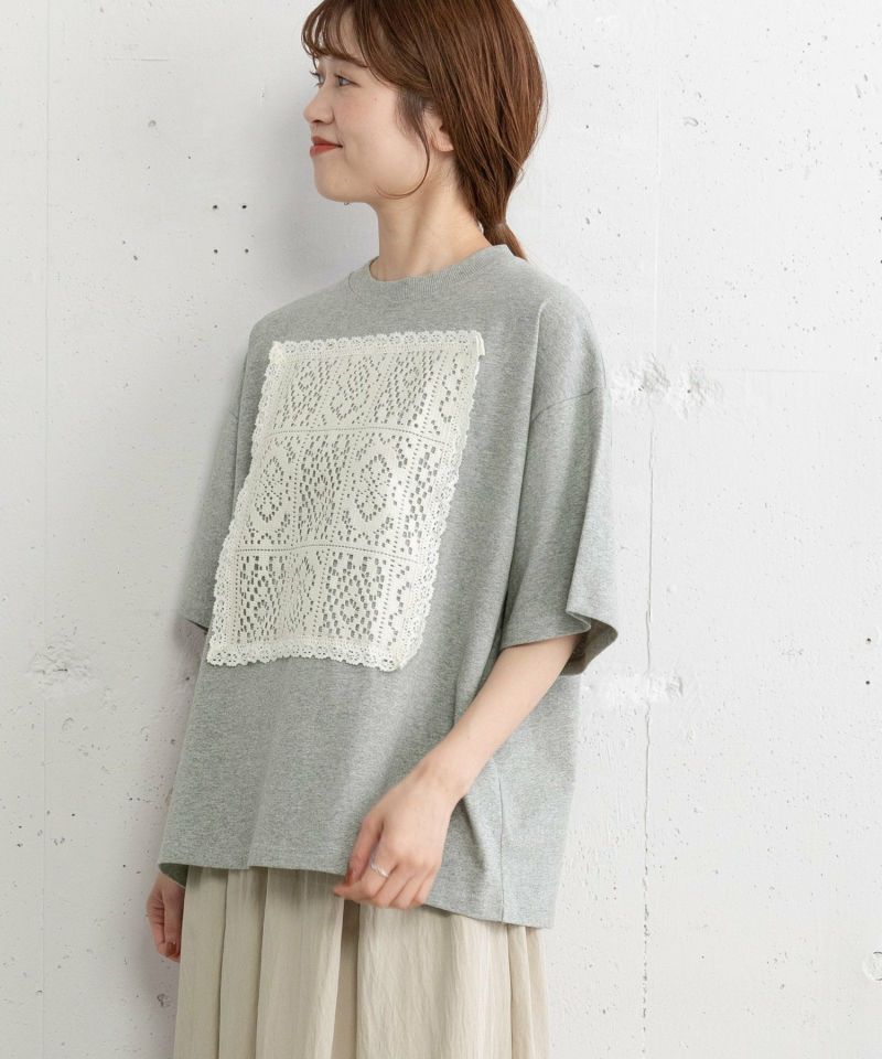 メンズライクなボックスTシャツにレースをたたきつけた、リメイク風のデザインTシャツ。オフホワイトはボディ同色、ブラックとグレーはキナリのレースを使用しています。程よい着丈でイン・アウトスタイルが気分に合わせてお楽しみいただけます。