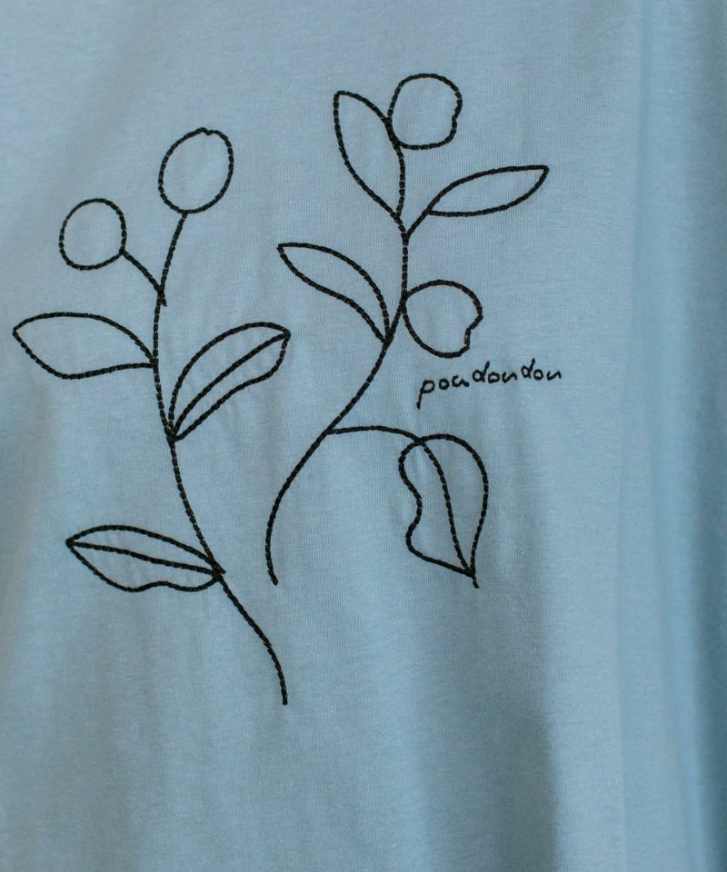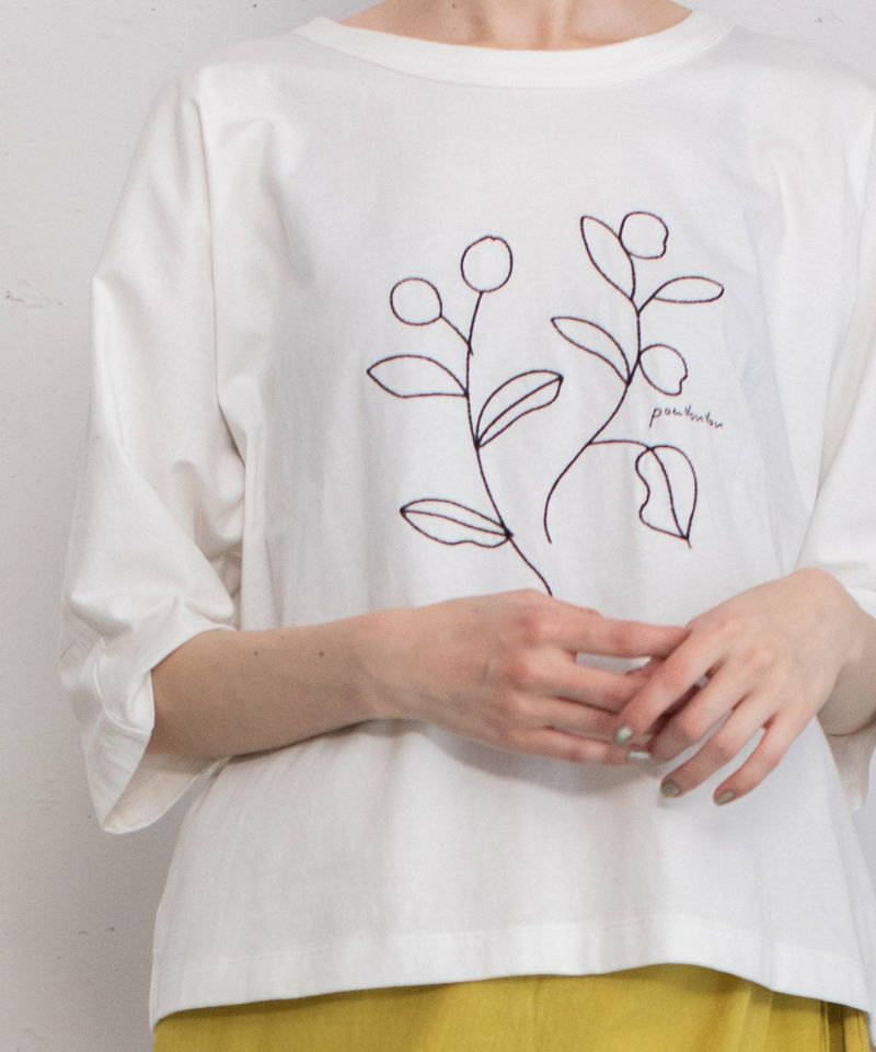 身頃続きの袖でゆったりとしたサイズ感のドルマンスリーブトップス。フロントに手描きからデータをおこした木の実モチーフを刺繍しました。ザクザクとしたハンドステッチライクなミシン刺繍がラフで新鮮さがあります。着丈は長すぎず、真っ直ぐとした裾のラインでボリュームボトムスとの相性もいいです。