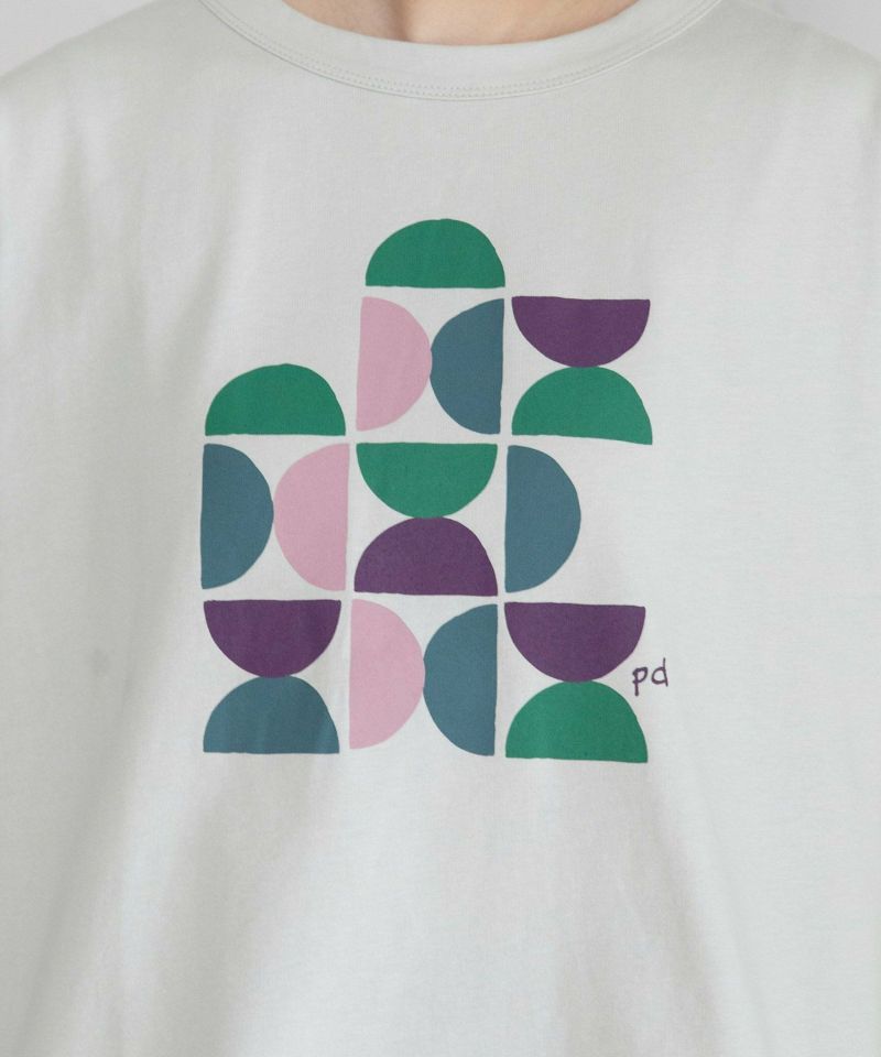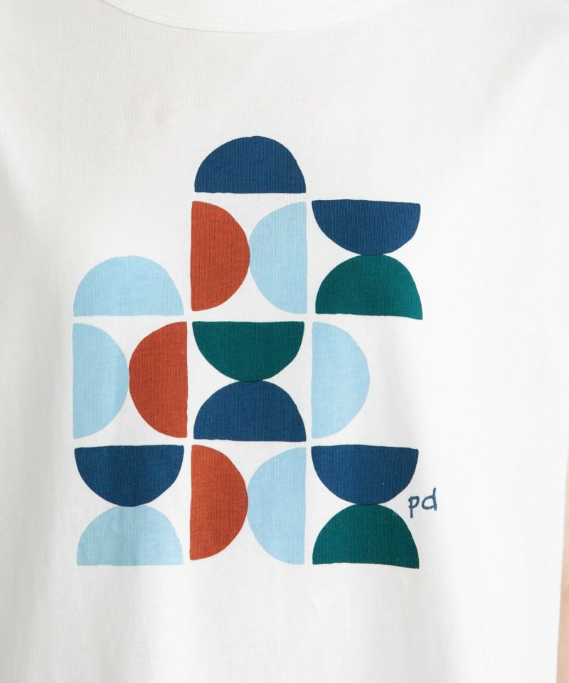 ランダムに配置したプリントがキャッチーなTシャツ。さりげなくpd(POU DOU DOU)のロゴが入っています。ゆとりのあるサイズ感にほどよく肩が隠れるフレンチスリーブで、暑い夏にもぴったり。シャツやカーディガンも羽織りやすいです。