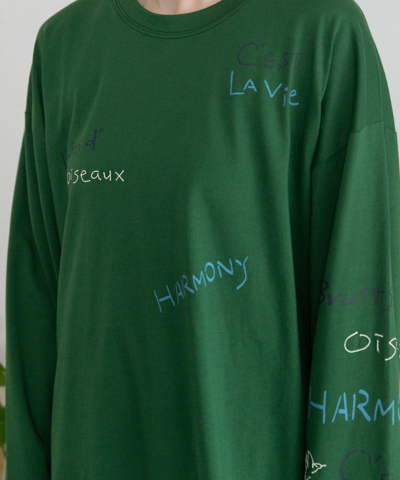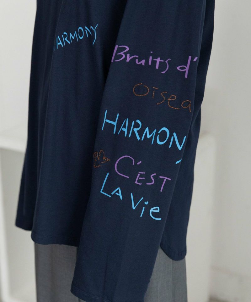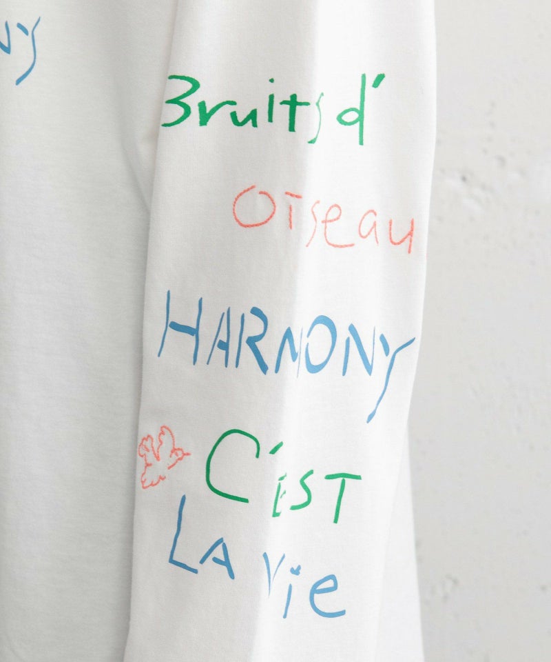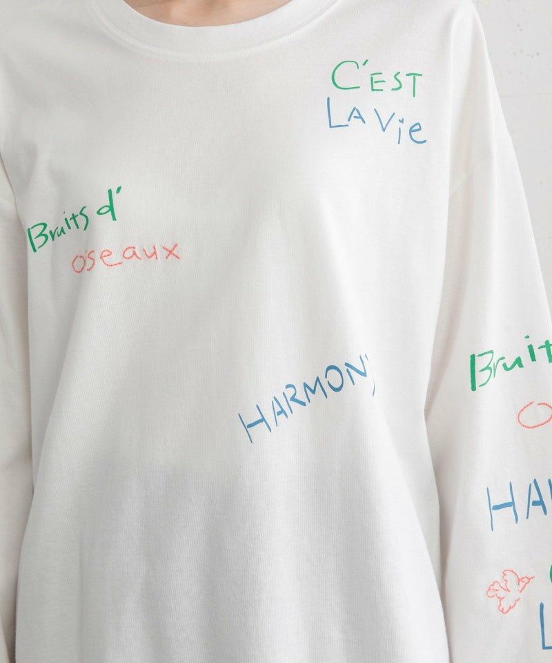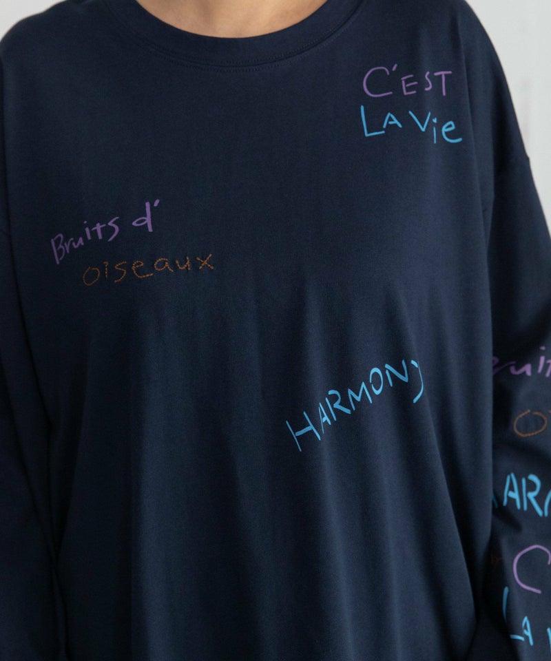 フロントと袖にランダムに入れたカラフルな文字プリントとミシン刺繍がキャッチーなアイテム。程よい厚さでカジュアルに着られる天竺素材を使用しました。今年らしいバランスで着こなせるルーズなシルエットやボリューム感のある袖がおすすめポイント。ラウンドした裾のシルエットもさりげないポイントです。