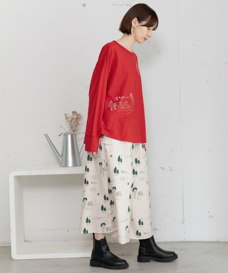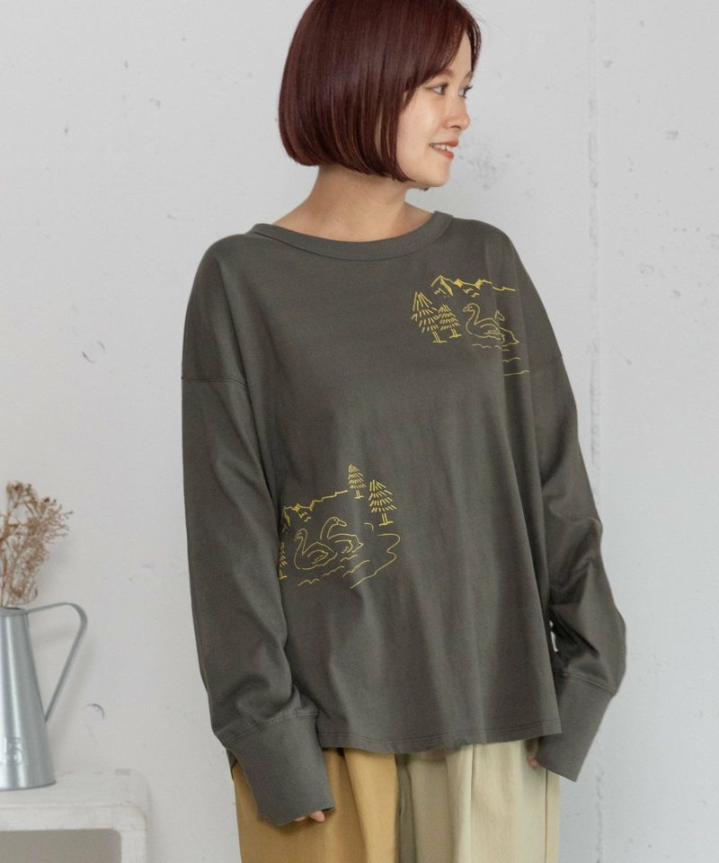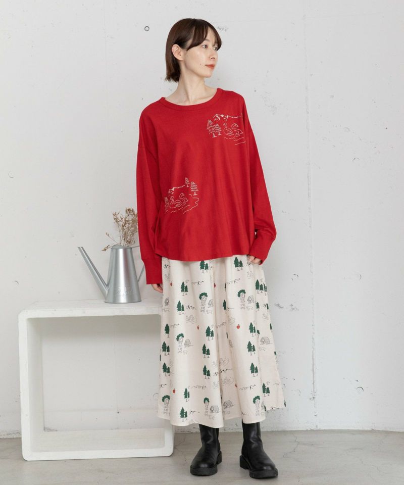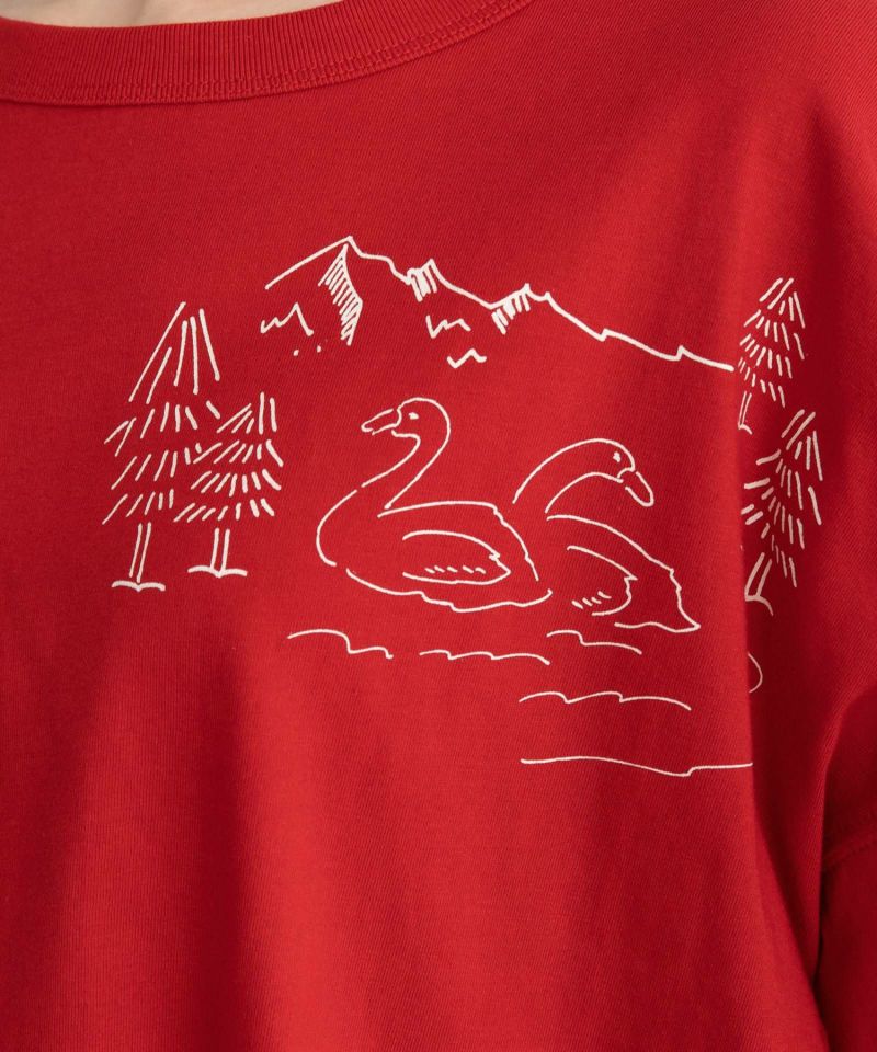 白鳥が湖に浮かぶ湖畔の風景のイラストをプリントした長袖Tシャツ。手描きのゆるっとした雰囲気とオーバーサイズシルエットで、リラックス感のあるアイテム。1枚着としてはもちろん、シャツやスウェットのインナーにも使えます。レッドは差し色にもなるのでおすすめです。