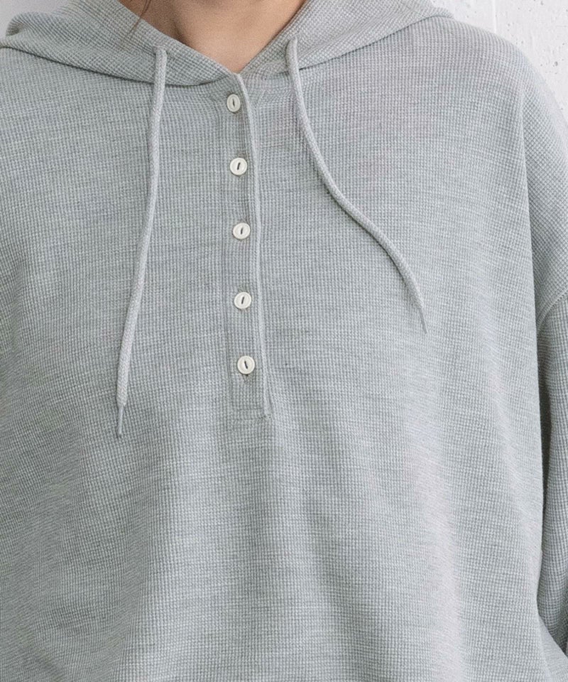 ほどよい厚みのワッフル生地を使用したフーディトップス。表面が凹凸で表情があるのでシンプルなのにどこかこなれた印象に。おうち時間にもお出かけにもぴったりで、つい手に取りたくなる着心地です。1枚でラフに着てもサマになり、気温に合わせて中にインナーを重ねればロングシー ズン活躍するアイテム。ベストに重ねてフードを出すスタイリングもおすすめです。