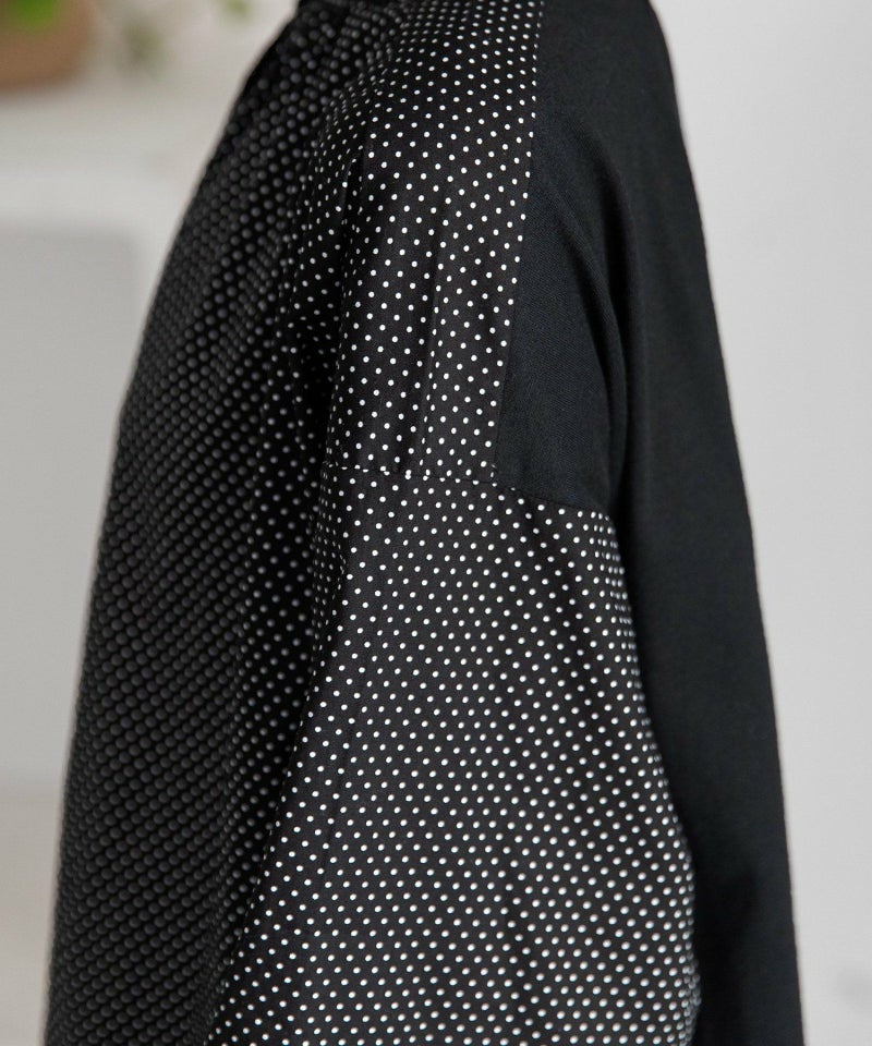 カットソーと布帛生地を組み合わせた、スタンドフリル衿が華やかなトップス。ブラウスのようにきちんと見えするのに、カットソー素材の柔らかな肌なじみが着やすいポイント。落ち着いた色味の展開です。ニットやスウェットのインナー使いもオススメ。前後どちらでも着用できるフレキシブルなアイテムです。