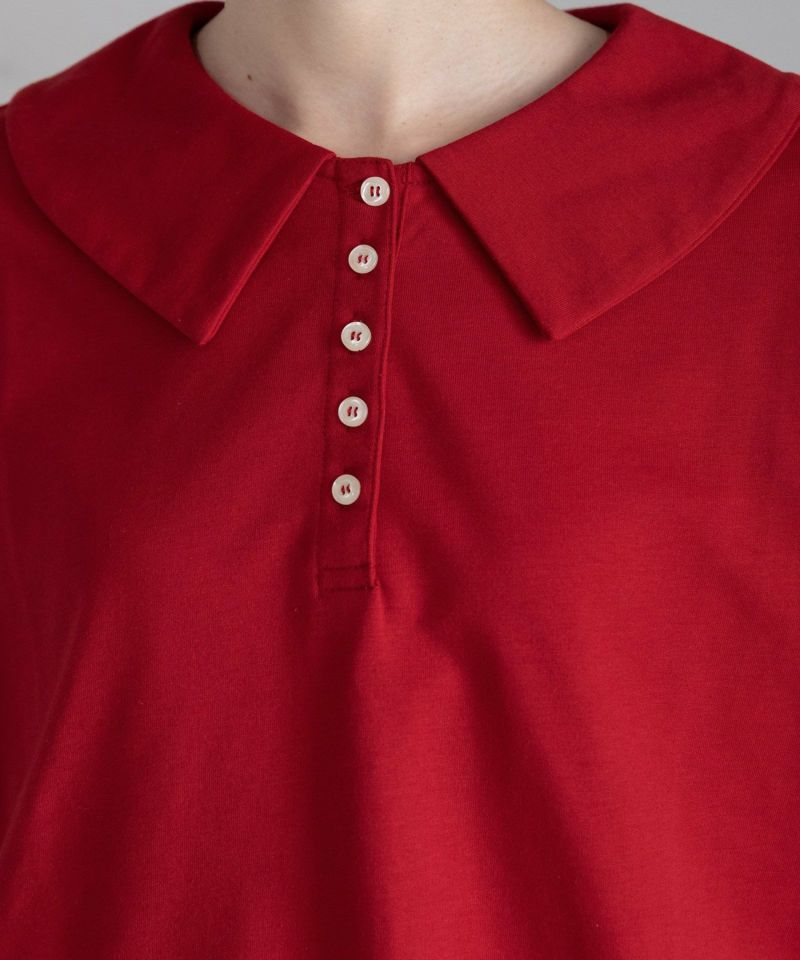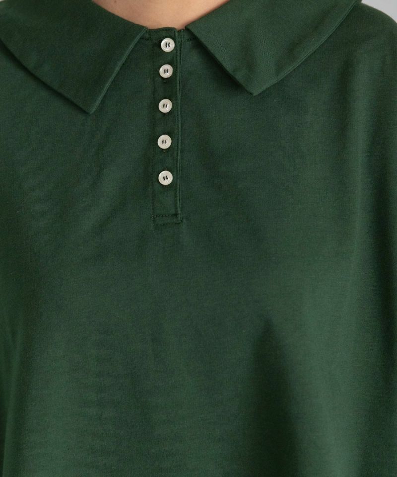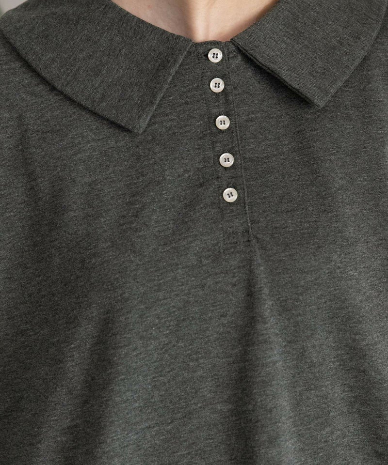 フラットカラーできちんと感がありながら、肩を落としたボックスシルエットでリラックスして着られるトップス。並んだボタンがポイントで、開けて抜け感のある着こなしをするのもおすすめです。スウェットとTシャツを良いとこ取りしたような程よい厚みのミニ裏毛生地で、さらっと着ていただけるアイテムです。ハイネックやタートルネックインナーを下に合わせる着こなしも可愛いです。