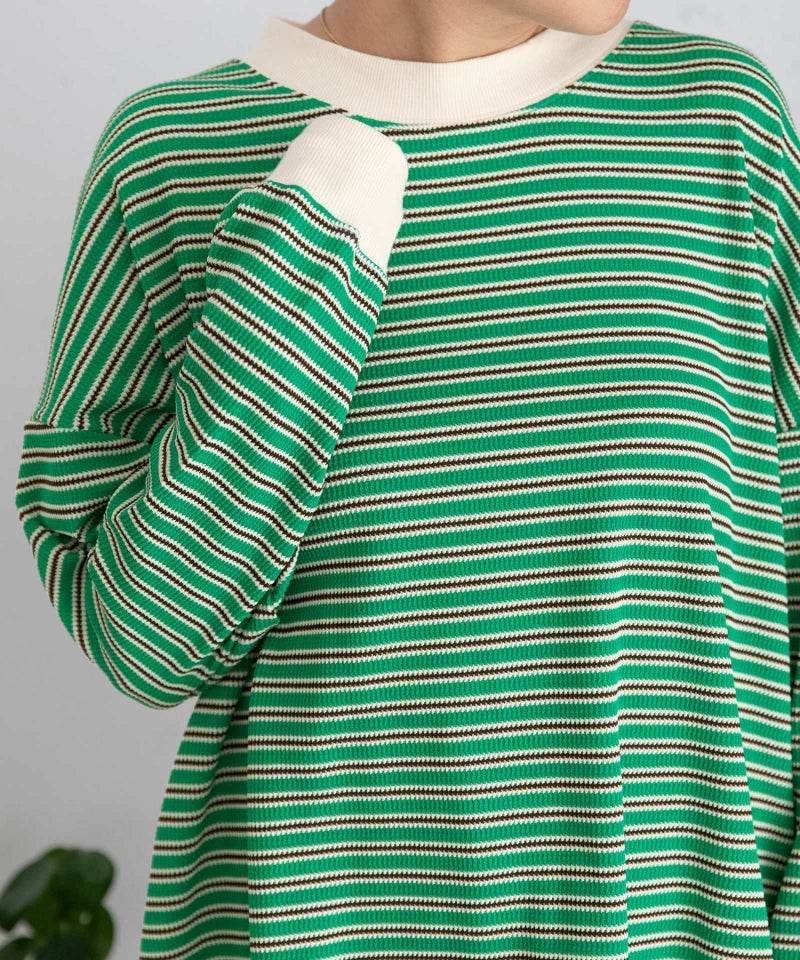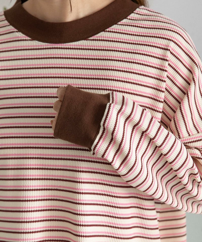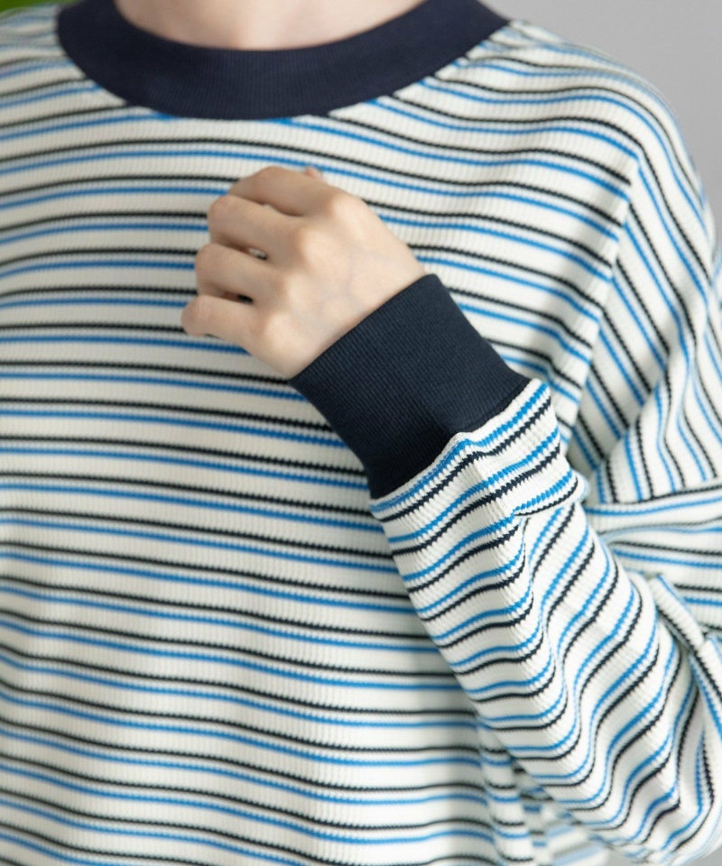 オーバーシルエットが女性らしい抜け感を作るワッフルボーダーのプルオーバー。ゆるっとしたサイズ感を楽しめます。1枚でポイントになるカラーリングのワッフル生地をチョイスし、リブも配色使いでアクセントにしました。デニムやスラックスと合わせるのはもちろん、スウェットやニットを重ねるスタイリングもオススメです。