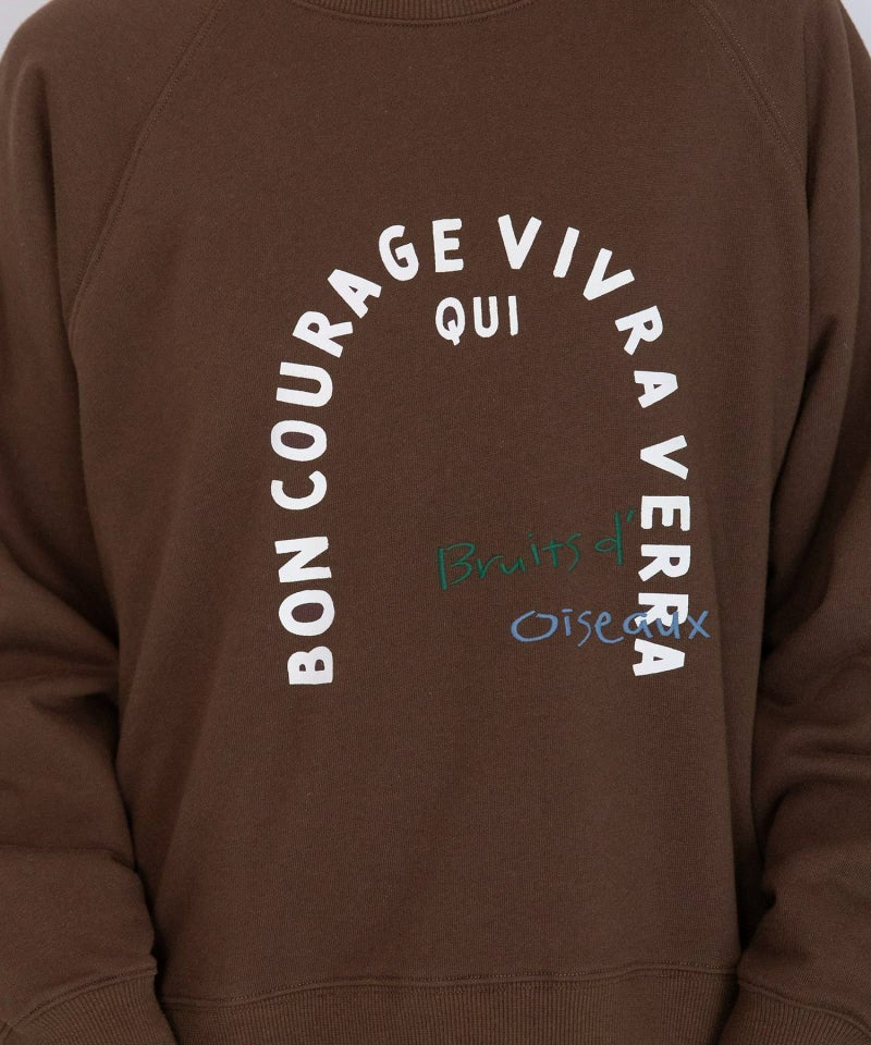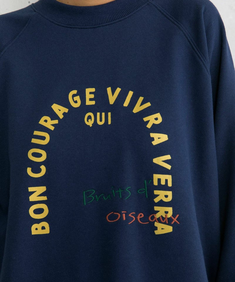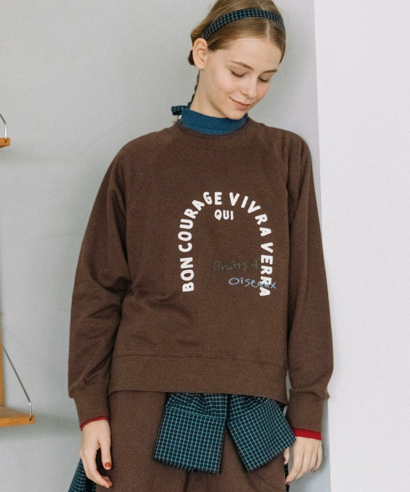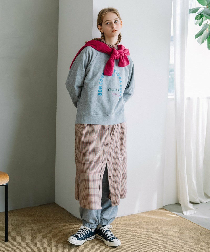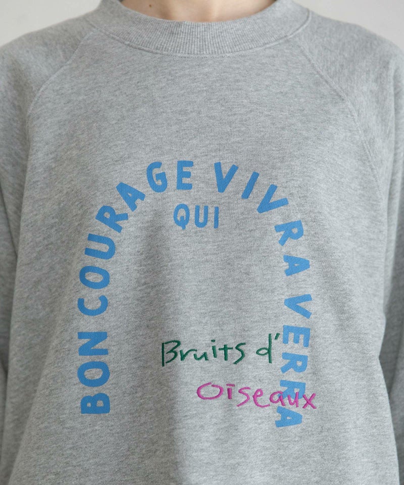 アーチ上にロゴを並べたプリントにメッセージ刺繍を重ねたスウェット。ナチュラルに肩に馴染むラグラン切り替えにすることで、動きやすいシルエットにしています。脇裾にスリットを入れ、シャツなどを下に着やすくしています。