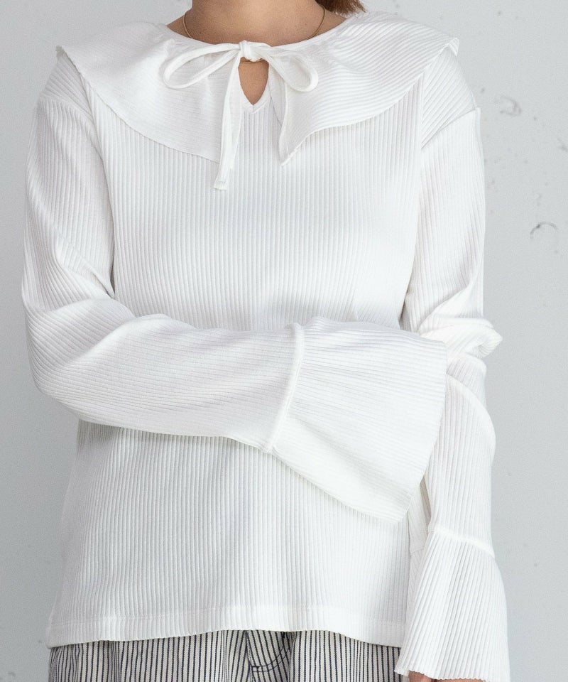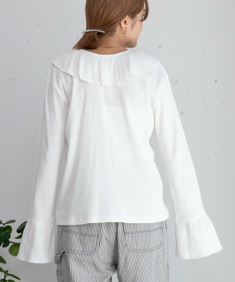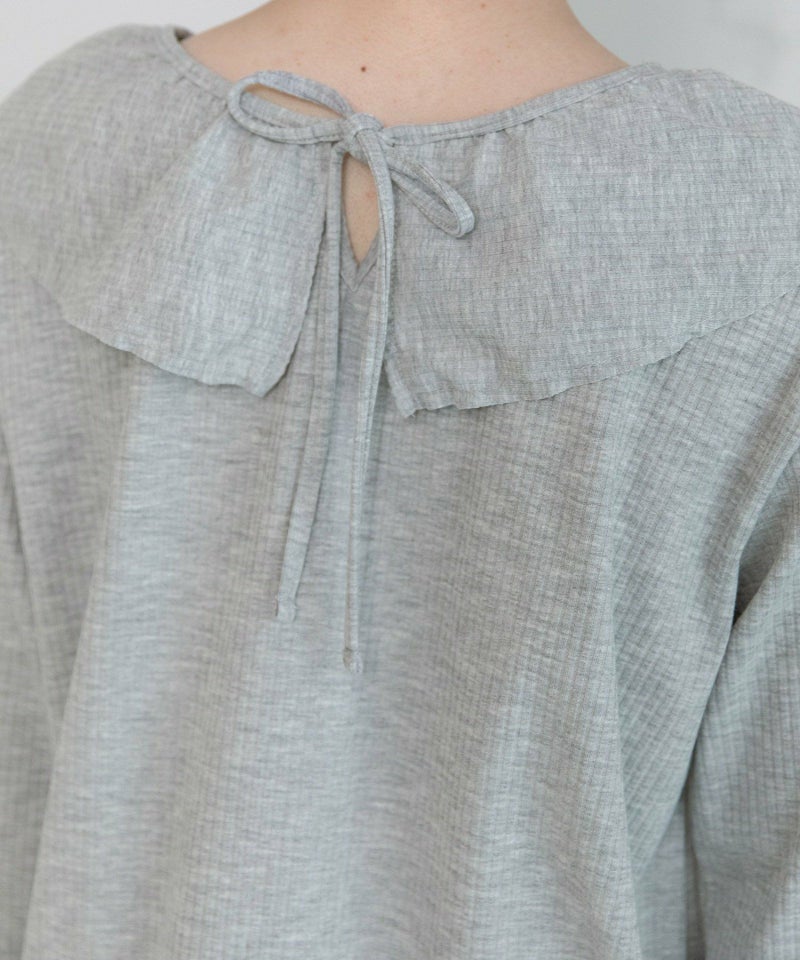 衿元のラッフルカラーと袖口のギャザー切り替えが華やかな雰囲気のトップス。前後どちらでも着られる2WAYのデザイン。リボンを結ばずに抜け感を出しても。伸縮性に優れ、肌触りが良いトタンテレコ素材を使用しました。程よい厚みがあり、体のラインを拾いにくく、綺麗なシルエットを保ちやすい素材です。