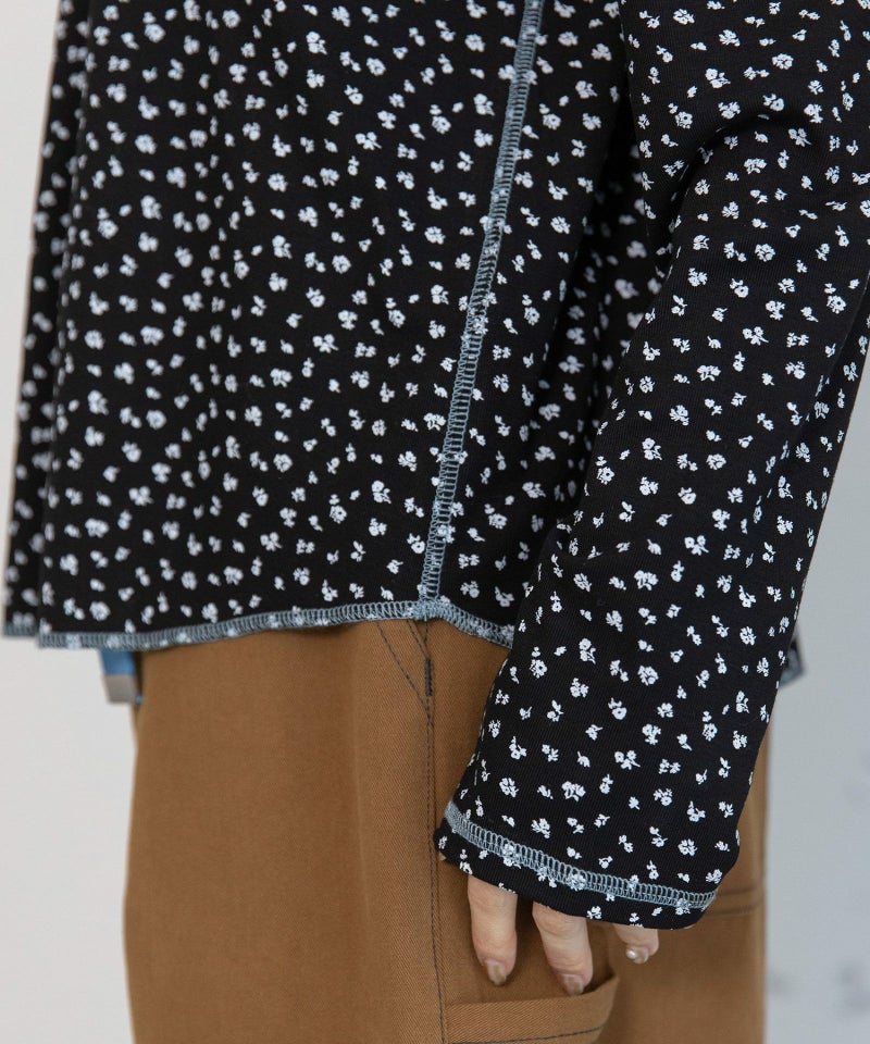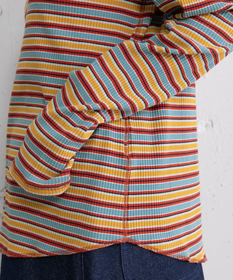 程よく首に沿うモックネックのトップス。タートルネックに比べて短めのネックなので、リラックスして着られます。配色のロックステッチがさりげないアクセント。アイボリー・ブラックは小花柄の天竺素材、ピンク・ブルーはマルチボーダーのリブ素材です。身体のラインを拾いすぎない程よくゆとりのあるサイジングです。