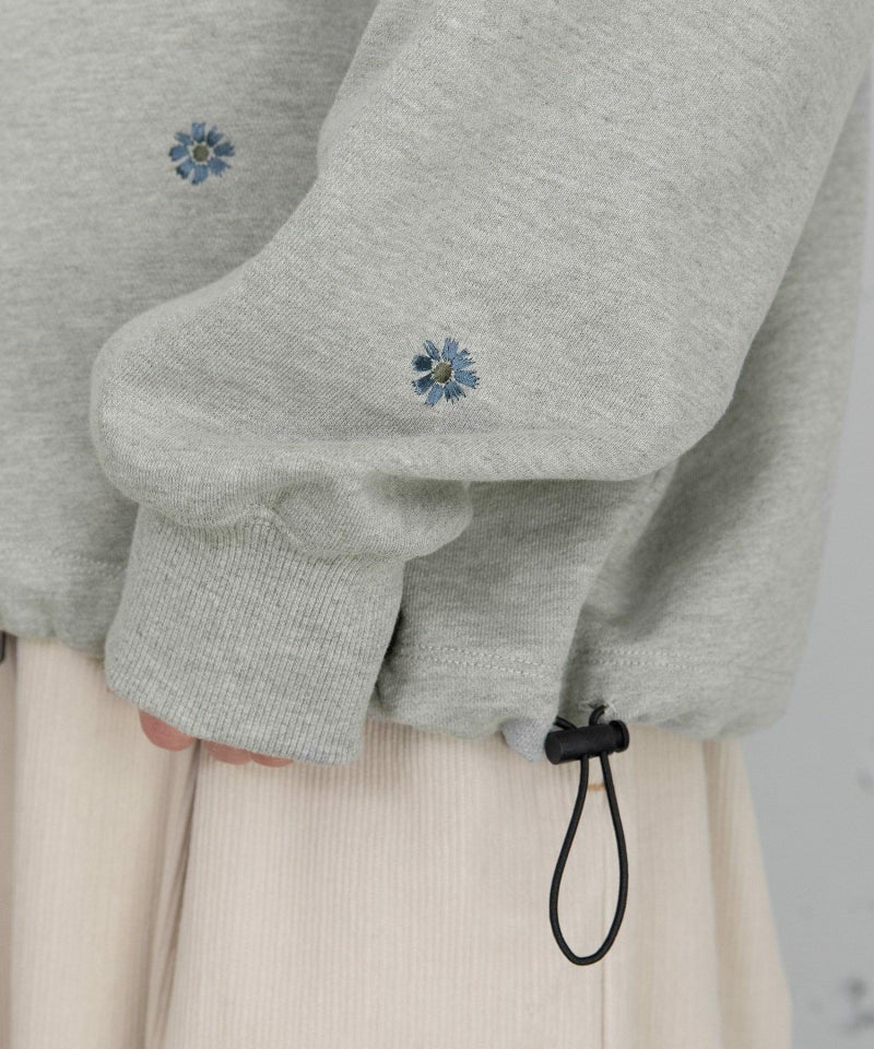 裾のドロストデザインがアクセントになった一枚着トップス。ザクザクとラフな雰囲気の花刺繍を散りばめました。裾にスピンドルを通しているので、サイズ感とシルエットをお好みに調節可能です。肩を落としてゆったり身巾を取っているのでゆったりした着心地。程よい丈感なので色々なボトムスと相性良く合わせられます。